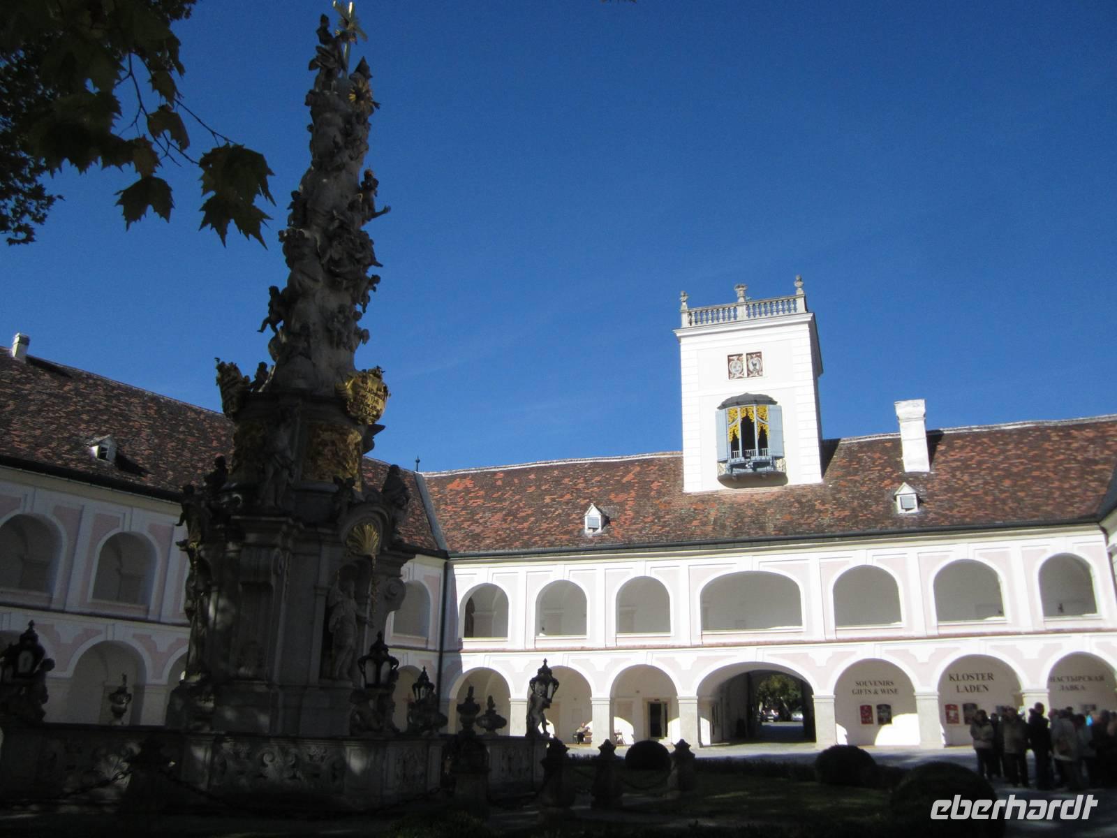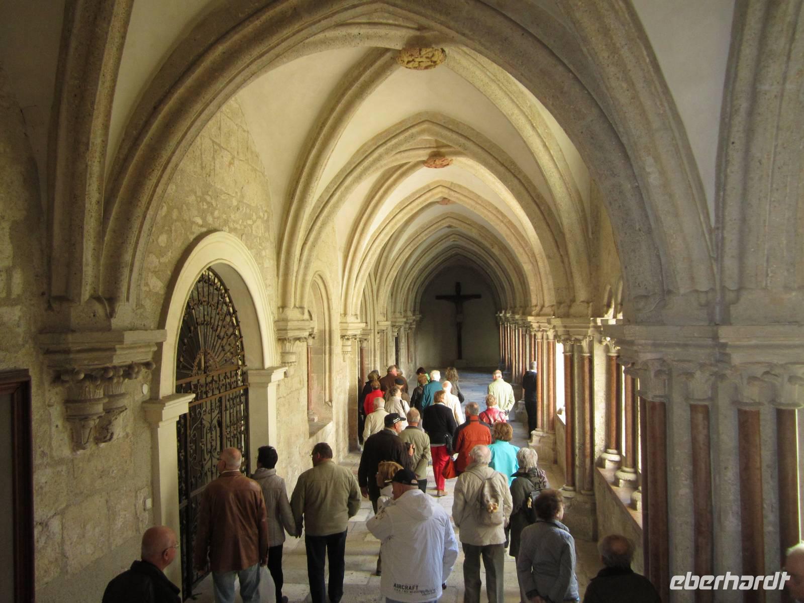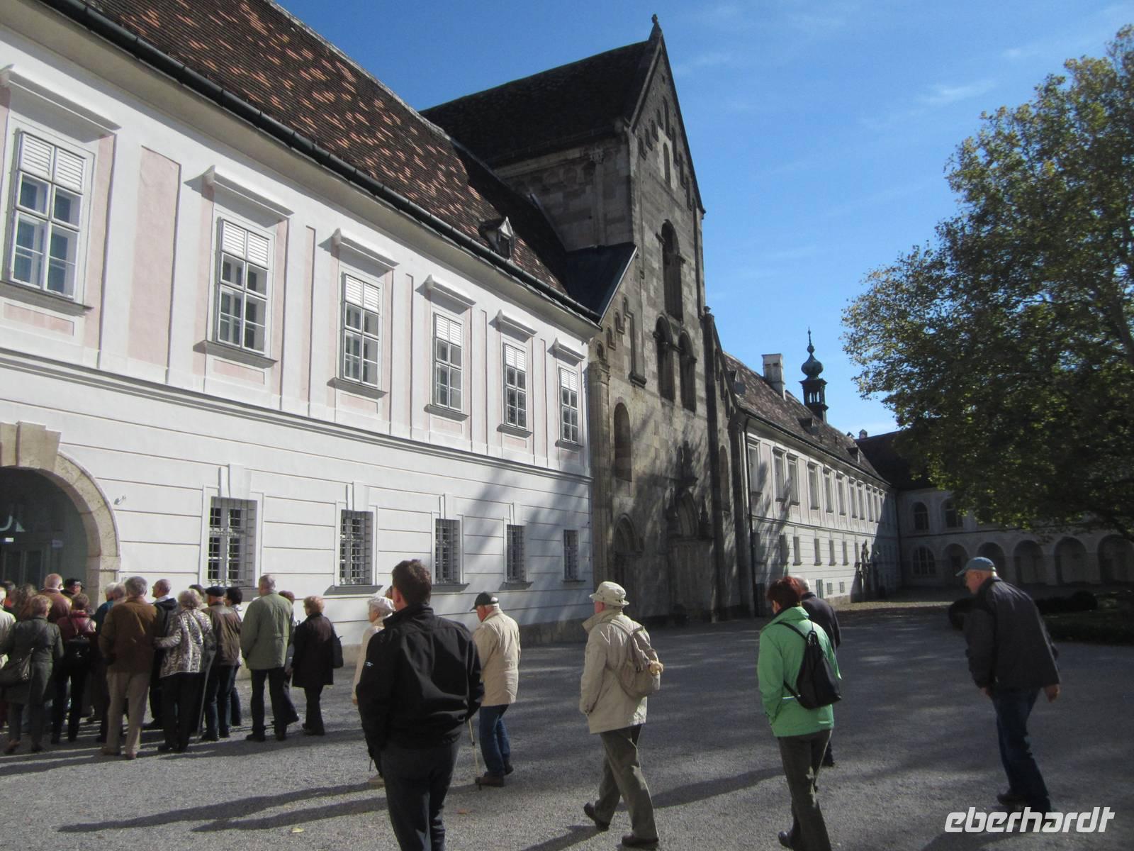 Heute Mittag starten wir unseren Ausflug in den Wienerwald. Am Vormittag besucht ei Teil der Gruppe den Prater, der andere Teil fährt in die Altstadt um noch einmal der "Steffl" oder auch das Kunsthistorische Museum mit seiner großen Breughel-Kollektion zu sehen, Am Mittag fahren wir mit dem Bus in den Wiener Wald. Franz Paminger informiert uns über die unterschiedliche Struktur des Wiener Waldes. Wir haben eine herrliche Sicht auf die Umgebung und viel Sonne lässt die beginnende Laubfärbung zu einem besonderen Erlebnis werden. Bevor wir nach Heiligenkreuz kommen (unser erstes Ziel), sehen wir die Stammburg der Fürsten von Liechtenstein, die hoch auf einen Bergrücken hervorragt. Beeindruckt sind wir vom Stift Heiligenkreuz, der mit seinen 81 Mönchen eine lebendige Zisterzienserabtei ist und seit 880 von seiner Gründung an (1133 vom hl. Leopold) ununterbrochen besteht. Nach der beeindruckenden Führung durch das Kloster fahren wir weiter durch das schöne Helenental in das Biedermeier-und Villenstädtchen Baden. Dem Sommeraufenthalt der Habsburger. Treff der Wiener Gesellschaft im 19. Jahrhundert, die Musiker Strauß, Schubert, C.-M.v.Weber und Beethoven . Auch August der Starke verweilte in Baden. Er ließ sich von seinen Großvetter in Wien heimlich im katholischen Glauben unterrichten und konvertierte heimlich am 1. Juni 1697 in der katholischen Hofkapelle zu Baden. Die Zeitzeugen der vergangenen Jahrhunderte sehen wir uns bei unserem Bummel durch Baden an. Wir haben heute einen weiteren Programmpunkt, der bei keiner Wienreise fehlen sollte. Der Besuch eines "Heurigen" und dazu fahren wir nach Gumpoldskirchen. Beim Heurigen Bruckberger werden wir erwartet. Mit einem Stelzenessen, guten Wein und Musik von Leo genießen wir den Abend bevor es wieder nach Wien zurückgeht.