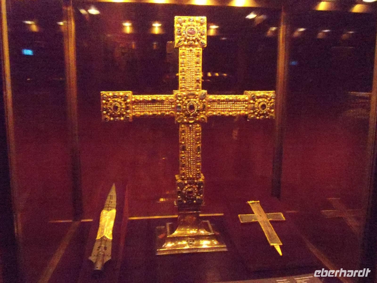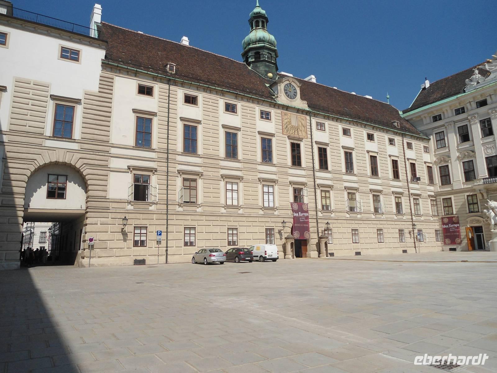 Wieder war ein warmer Tag angebrochen. Der heutige Ausflug versprach das Kennenlernen von Macht und Reichtum. Wo finden wir die Zeugen dafür, natürlich in der Hofburg. Mit Herrn Paminger trafen wir uns im Burghof. Zuerst gab es Erklärungen zur Geschichte der Hofburg, zu den ständigen Erweiterungen bei Machtantritt eines neuen Regenten aus dem Hause Habsburg und zur Nutzung der Burg heute. Der Bundespräsident hat z.B. seine Arbeits- und Repräsentationsräume in der Hofburg. Wir schauten uns zuerst die „Silberkammer“ an. Hier findet man alles was zur Führung eines kaiserlichen Hauses für die Versorgung der kaiserlichen Familie sowie der unzähligen Gäste notwendig ist. Das sind u.a. die größten Töpfe und Pfannen, die verschiedensten Service in den unterschiedlichsten Ausführungen besten Porzellans, Gold und Silber, die kleinsten und zartesten Tassen für einen Mokka, Tischschmuck für jede Gelegenheit. Die Präsentation der Macht bewunderten wir in der Ausstellung der „Kronjuwelen“. Hier sahen wir die Gewänder und Ornate, die Könige und Gefolge zu den Krönungszeremonien trugen. Dazu gehörte natürlich die Krone. Das ist einmal die Königskrone von Österreich. Aus Gold gefertigt und reich verziert mit verschiedensten Edelsteinen. Weiterhin ist zu sehen die Krone des Heiligen Römischen Reiches Deutscher Nation, das Prunkstück der Ausstellung. Dazu das Krönungsornat des Kaisers . Auch diese Krone war in den letzten Jahrhunderten dieses Reiches im Hause Habsbug geblieben Mit vielen neuen Eindrücken beendeten wir unseren Ausstellungsbesuch. Wir entschlossen uns noch zu einem kleinen Bummel durch die Altstadt. Ob es wirklich ein „kleiner“ Bummel wird? Wir lernten einen weiteren Teil Wiens kennen, Plätze und Straßen, versteckte Ecken und Gassen. Zuerst ging es zur Minoritenkirche. Dort sahen wir eine wahre Rarität, das Bild „Das Heilige Abendmahl“ von Leonardo Da Vinci, in Mosaiksteinen nachgestaltet. In unmittelbarer Nähe ist das Cafe Central zu finden, das warscheinlich bekannteste Cafe der Stadt. Man kann das Flair vergangener Zeiten gut nachempfinden. Weiter ging es zum Platz „Am Hof“ , einer der historisch bedeutendsten Plätze Wiens. Hier schlugen bereits die Römer ihr erstes Heerlager „Vindebona“ auf. Auch an diesem Platz bauten hunderte Jahre später die ersten Regenten aus dem Hause der Babenberger ihre erste Pfalz. Über den „Judenplatz“ mit dem Holocaustdenkmal erreichten wir den „Hohen Markt“, den ältesten Platz der Donaumetropole. Die Entstehung reicht bis zum Beginn der Stadtgeschichte zurück. Eine große Attraktion ist hier die „Kunstuhr der Ankerversicherungsgesellschaft“ von 1914. In einem die Straße überspannenden Schwibbogen paradieren stündlich bedeutende Persönlichkeiten wie Kaiser Mark Aurel, Walther von der Vogelweide, Kaiser Karl der Große, Maria Theresie, Joseph Haydn u.a. Noch ein kleines Stück des Weges und wir waren am Ziel des heutigen Vormittages. Die Temperaturen waren wieder sehr heiß und die Gäste haben alles bestens gemeistert. Das Ziel des Ausfluges hieß „Cafe Frauenhuber“, auch ein bekanntes historisches Kaffeehaus in Wien. Bei einer guten Tasse Kaffee und einem Stück Kuchen nach Wahl konnten sich alle etwas erholen. Aber erst gab es einen Erfrischungstrunk auf Kosten des Reiseveranstalters, das hatten sich alle verdient. Den weiteren Nachmittag gestalteten sich die Gäste nach ihren Vorstellungen.