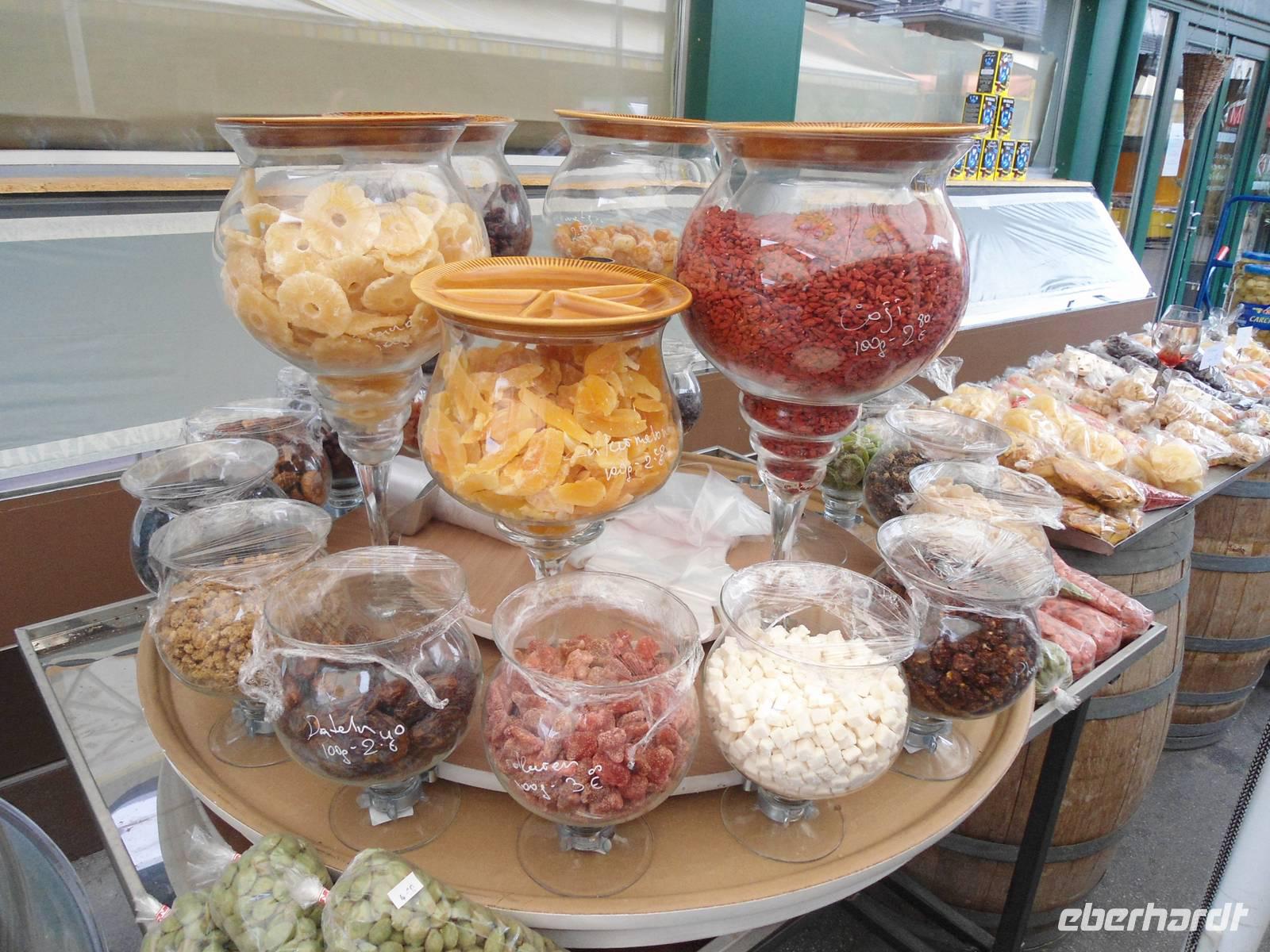 Einige Gäste hatten sich entschieden, den „Naschmarkt“ etwas näher kennenzulernen. Mit Herrn Paminger trafen wir uns um die Mittagszeit an der Secession am Karlsplatz. Dort ist in unmittelbarer Nähe der „Naschmarkt“ zu finden. Nach einigen Ausführungen über die Umgebung mit wunderschönen Jugendstilhäusern, begannen wir unseren Spaziergang über den Markt. Mit seinen farbenprächtigen, rund 160 transportablen und festen Marktständen ist er nicht nur eine von den Wienern gern genutzte Open-Air-Markthalle, er zieht auch viele Touristen an. Das Angebot ist ein beeindruckender Warenmix aus den verschiedensten Ländern. Internationale gastronomische Einrichtungen sorgen für das leibliche Wohl der Besucher. Das wollten wir kennenlernen. Herr Paminger ließ auch für uns einen kleinen bunten Deliatessenmix zum Kosten zusammenstellen. Wir fanden auf dem Markt nicht die richtige Verzehrgelegenheit, etwas später, im Burggarten, haben wir es uns dann schmecken lassen. Dazwischen lernten wir noch ein weiteres typisches Wiener Cafe kennen, das „Cafe Sperl“. Hier lud uns unser Stadtführer zum Kaffee ein.