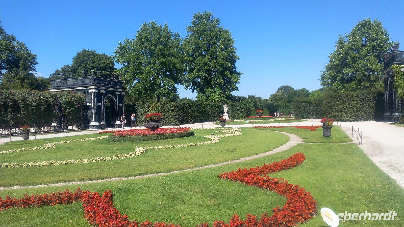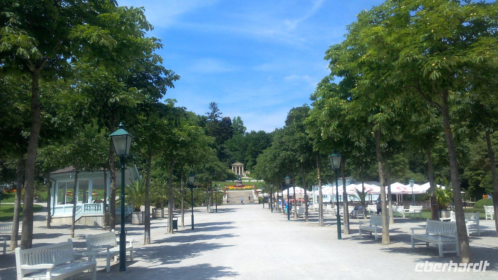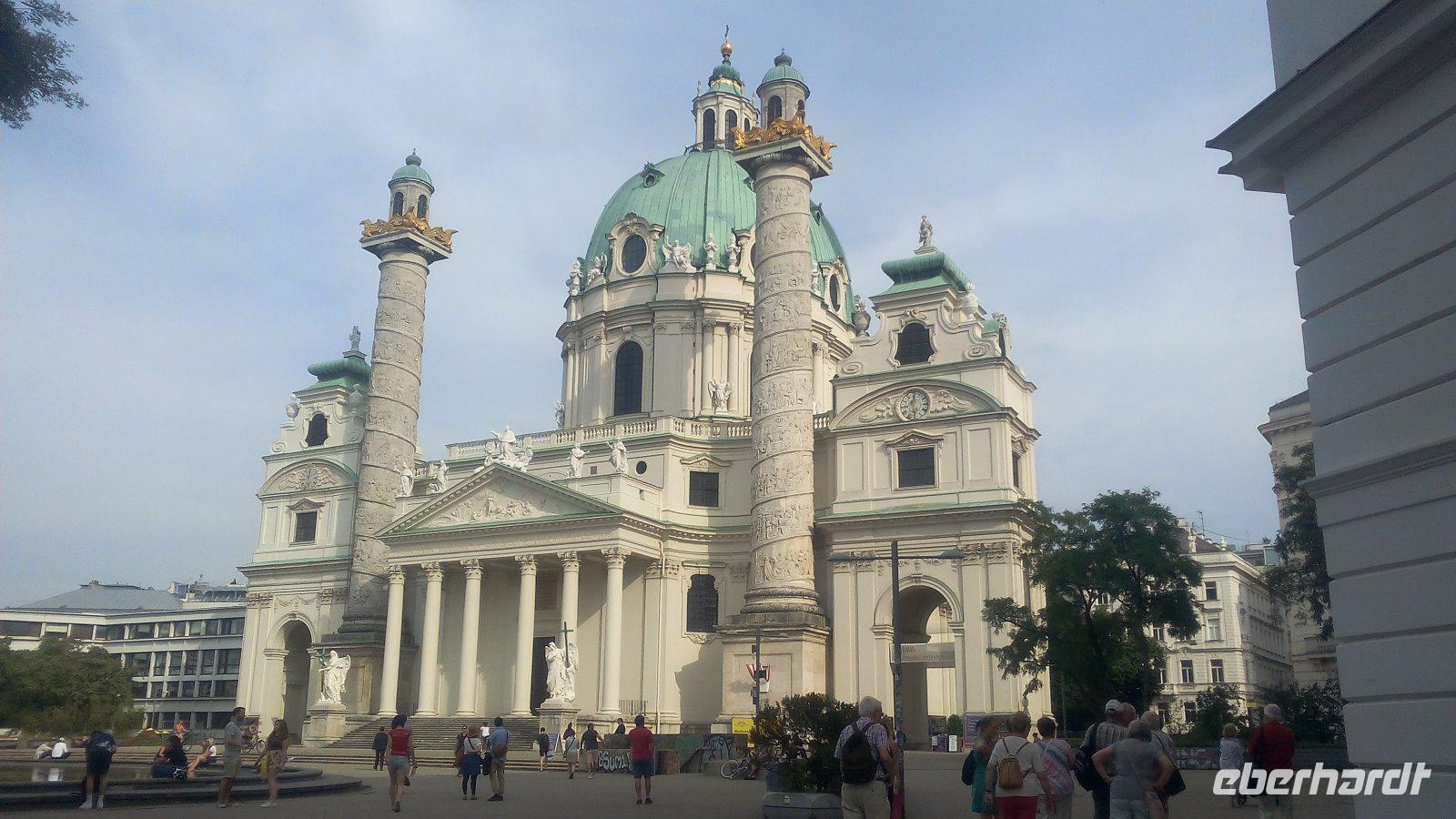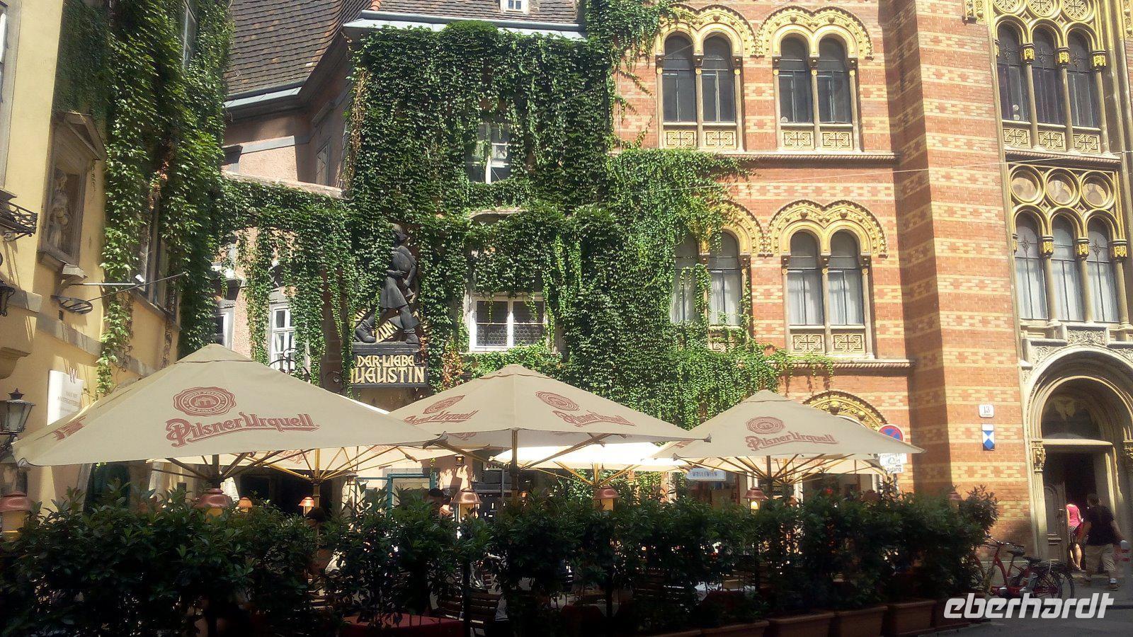 angekommen und nach der Führung von Franz kühlen wir uns im Garten der Konditorei-Trahbüchse bei einer Weinschorle und einem Eis ab. Entspannt spazieren wir am Casino vorbei und kommen vom Grünmarkt an die bekannte Römertherme. Die Schwefelquellen erreichen hier wohlige Temperaturen bis 36 Grad. Wir haben Zeit und laufen zum Rosarium. Aufgrund der hohen Temperaturen sind einige Rosen schon verblüht aber der Garten bietet sich an, hier einige Minuten zur Entspannung zu nutzen. Auf dem Weg zurück in die Stadt verweilen wir an der Kirchgasse 10, in der Ludwig von Beethoven wohnte und Teile der 9. Sinfonie komponierte. Nun ist es Zeit für die Rückfahrt nach Wien. Nicht ohne Hindernis. In Wien ist heute der iranische Präsident Hassan Rouhani auf Staatsbesuch. Aus diesem Grund können wir mit der Baden-Bahn nicht in die Innenstadt fahren und nutzen die U-Bahn, um zum Karlsplatz zu kommen.Für heute Abend steht noch den Besuch des Augustinerkellers im Programm. Auf dem Weg dahin führt uns Franz noch zur Karls-Kirche und zur Sezession. Im Augustinerkeller werden wir schon mit Schrammelmusik begrüßt. Die servierten Stelzen, die alle Vorstellung übertreffen sind sehr schmackhaft und sehr groß. Ein sehr schöner Abschluss des heutigen Tages.