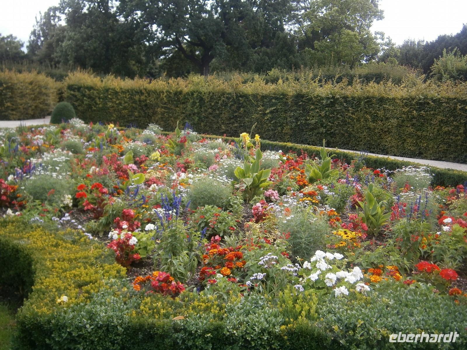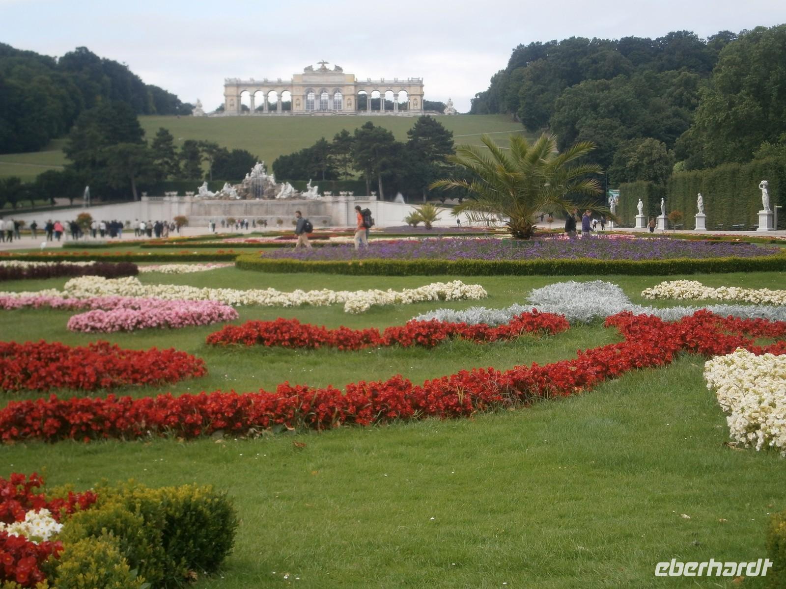 Die weitläufige Parkanlage besticht durch phantasievolle Blumenarrangements, den Neptunbrunnen, den Nymphenbrunnen und die über allem stehende Gloriette.