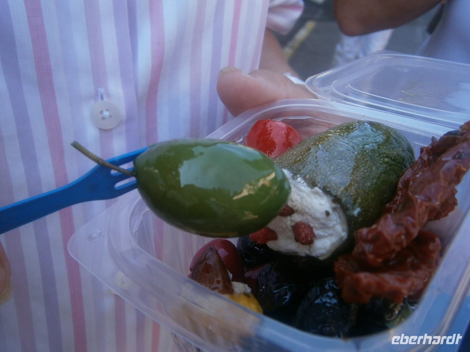 Antipasti - die richtige Alternative - grüne und dunkle Oliven, eingelegte getrocknete Tomaten, gefüllte Zucchini - alles lecker - aber viel zu viel.