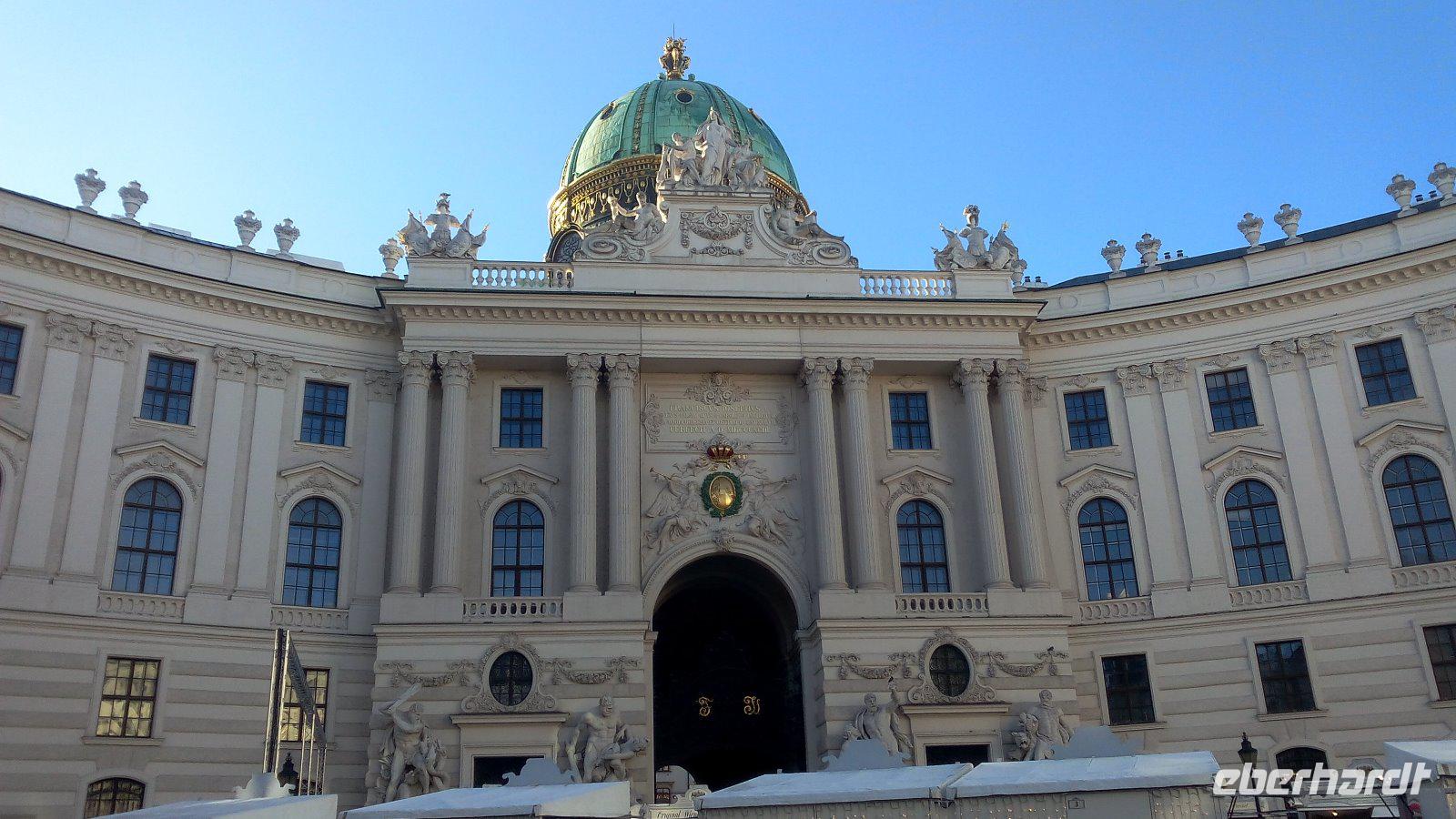 Am frühen Morgen können wir schon die kalte und klare Luft spüren und sehen schon den blauen Himmel. Der letzte Tag im Jahr 2016 beginnt und wir gestalten den Morgen etwas besinnlich. Wir haben unser Programm umgestellt und besuchen als Erstes den Zentralfriedhof im 11. Bezirk . Hier suchen wir die Gräber von bekannten Persönlichkeiten auf wie z.B. Beethoven, Schubert, Brahms, Johann Straus Sohn, Hörbiger, Linker und nicht zu vergessen auch das Grab von Udo Jürgens. Beeindruckend sind nicht nur die unterschiedlichsten Denkmäler, sondern auch die in der Friedhofmitte errichtete Karl-Lueger-Kirche. Zum Heiligen Karl Borromäus. Nach dem angenehmen Spaziergang fahren wir zur Hofburg. Herr Paminger führt uns und gibt uns einen Einblick in die Geschichte der Hofburg. Sie war vom 13. Jahrhundert bis 1918 (mit Unterbrechungen) die Residenz der Habsburger in Wien. Seit 1945 hat der österreichische Bundespräsident seinen Amtssitz in der Hofburg. In der auch verschiedene Museen untergebracht sind.