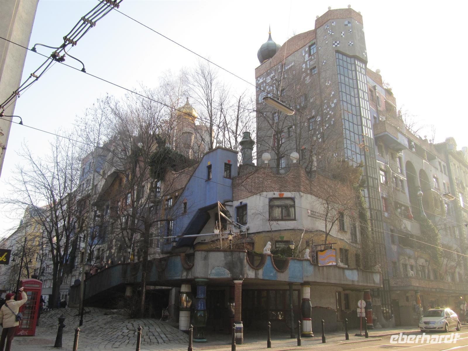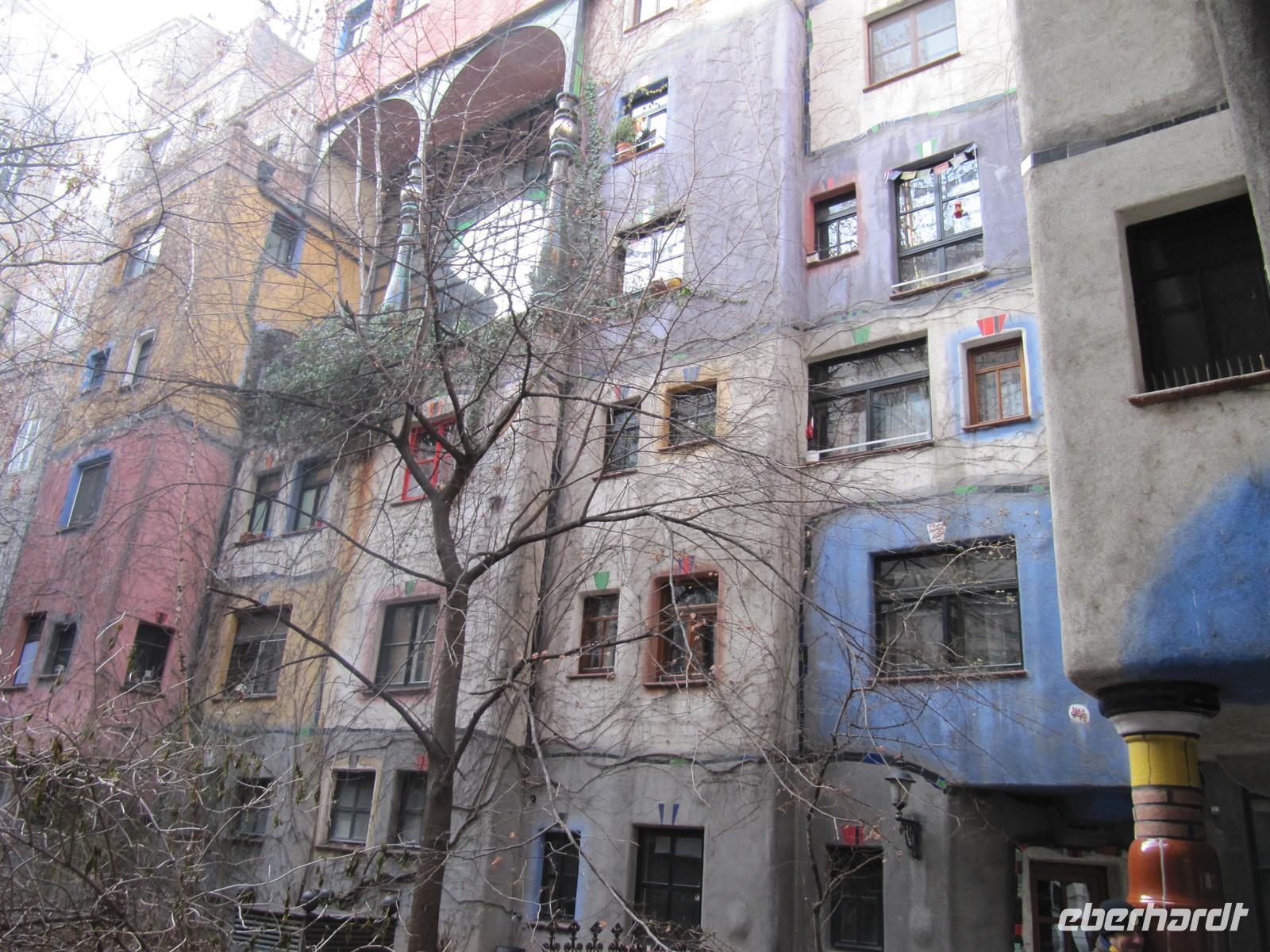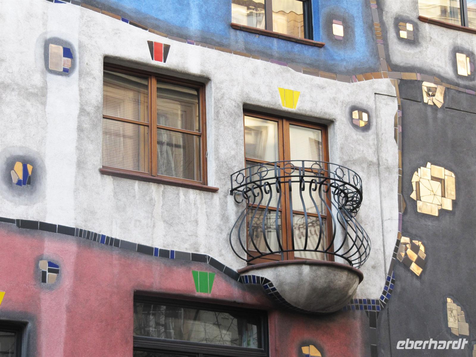 Unterwegs erfuhren wir viel zur Geschichte der Stadt, zur Aufteilung in Besatzungszonen nach dem Zweiten Weltkrieg, zum Wohnungsbau in den einzelnen Stadtbezirken, zur Qualität des Trinkwassers und dann erspähten wir ein etwas anderes Haus - das bunte Hundertwasserhaus, erschaffen vom Meister der krummen Linien Friedensreich Hundertwasser. Mit einer Ausnahmegenehmigung der Baubehörden ist dieses Gesamtkunstwerk entstanden: Auf den Dächern und Balkonen wachsen Bäume und Büsche, die Wände und Böden sind vielfach gekrümmt und die Fassaden kunterbunt bemalt. Es ist schon heute beeindruckend ... wie dann, wenn die Bäume und Sträucher ihre natürliche Pracht entfalten. Und doch zeigt sich das Haus nicht als ein Durcheinander, sondern mit einer erstaunlichen Leichtigkeit und Harmonie. Schade, dass das Dresdner Vorhaben der Hohen Haine nicht realisiert wurde. Lag es an der Unentschlossenheit der Dresdner Stadtväter oder war Hundertwassers Tod der Grund ...
