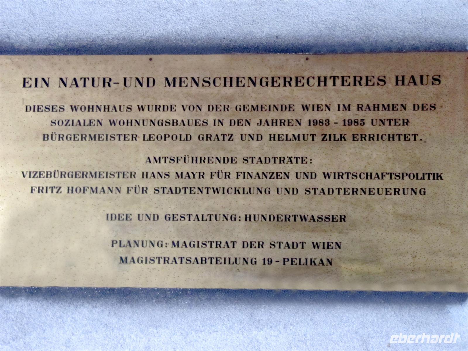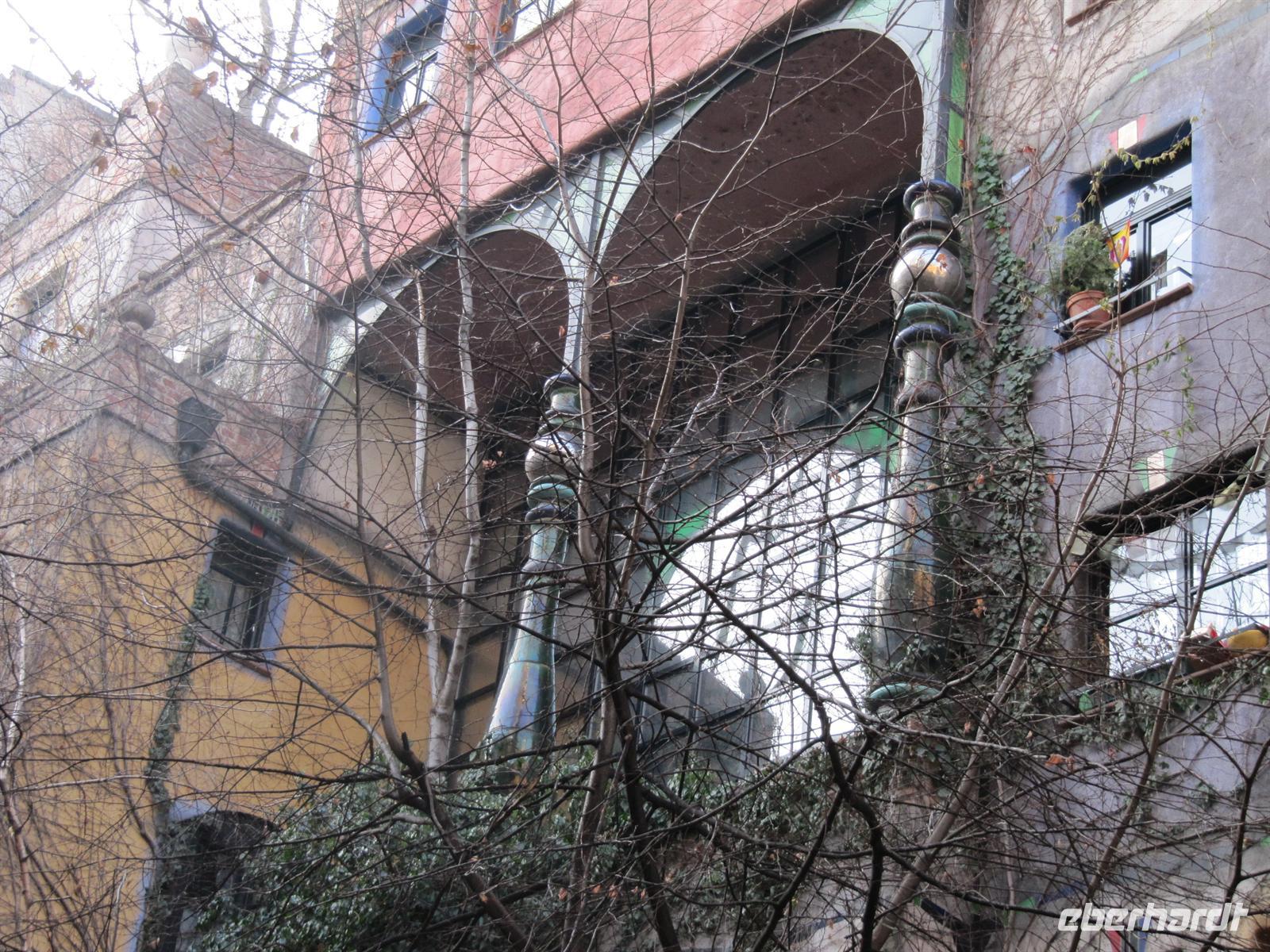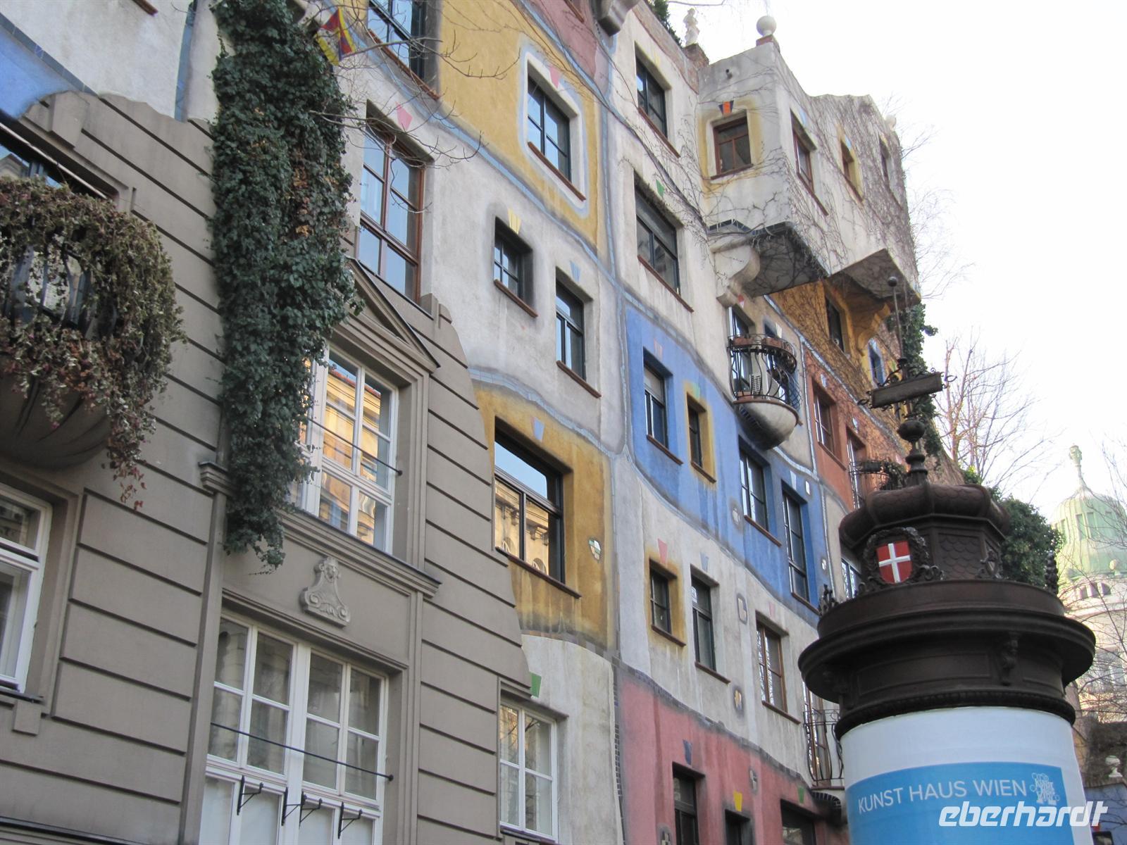Unterwegs erfuhren wir viel zur Geschichte der Stadt, zur Aufteilung in Besatzungszonen nach dem Zweiten Weltkrieg, zum Wohnungsbau in den einzelnen Stadtbezirken, zur Qualität des Trinkwassers und dann erspähten wir ein etwas anderes Haus - das bunte Hundertwasserhaus, erschaffen vom Meister der krummen Linien Friedensreich Hundertwasser. Mit einer Ausnahmegenehmigung der Baubehörden ist dieses Gesamtkunstwerk entstanden: Auf den Dächern und Balkonen wachsen Bäume und Büsche, die Wände und Böden sind vielfach gekrümmt und die Fassaden kunterbunt bemalt. Es ist schon heute beeindruckend ... wie dann, wenn die Bäume und Sträucher ihre natürliche Pracht entfalten. Und doch zeigt sich das Haus nicht als ein Durcheinander, sondern mit einer erstaunlichen Leichtigkeit und Harmonie. Schade, dass das Dresdner Vorhaben der Hohen Haine nicht realisiert wurde. Lag es an der Unentschlossenheit der Dresdner Stadtväter oder war Hundertwassers Tod der Grund ...