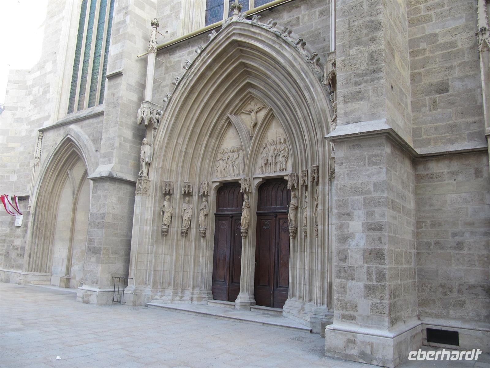 Pünktlich starteten wir gut gestärkt und voller Elan zu unserem Stadtspaziergang, um Bekanntes und Verborgenes in der Wiener Altstadt für uns zu entdecken. Romanische und gotische Kirchen zeugen von der tiefen katholischen Verwurzlung der Kaiserstadt. Zuerst besuchten wir die Augustinerkirche unmittelbar an der Hofburg und bestaunten die Netz- und Kreuzrippengewölbe. Seit Mitte des 17. Jahrhunderts dient sie als Hofpfarrkirche: Hier traten viele Kaiser, so auch Kaiser Franz Joseph mit Sissi vor den Traualtar. Hier wurde der Nachwuchs der kaiserlichen Familie getauft. Hier ruhen in der Herzgruft in 54 Urnen die Herzen der Habsburger. Wir bestaunten das Marmorgrabmal der Erzherzogin Maria Christine.