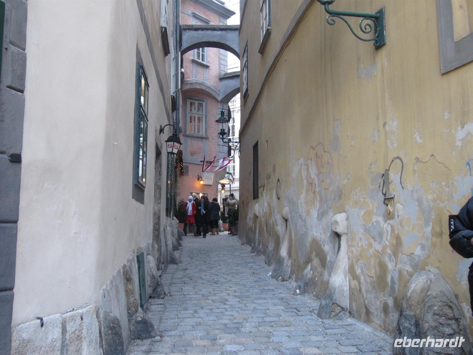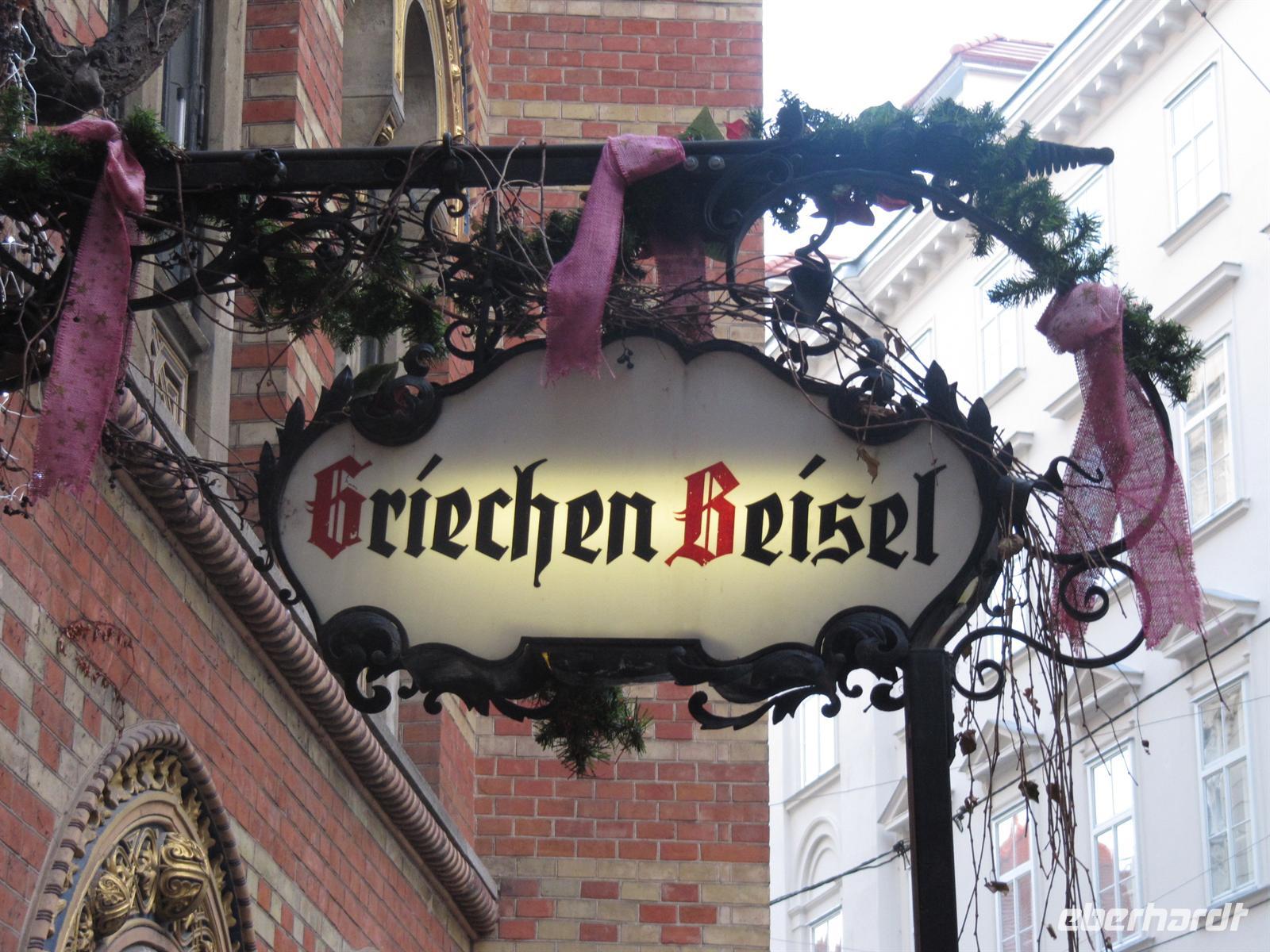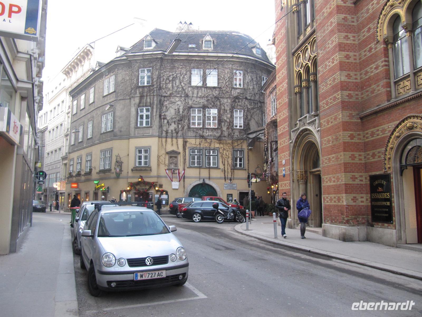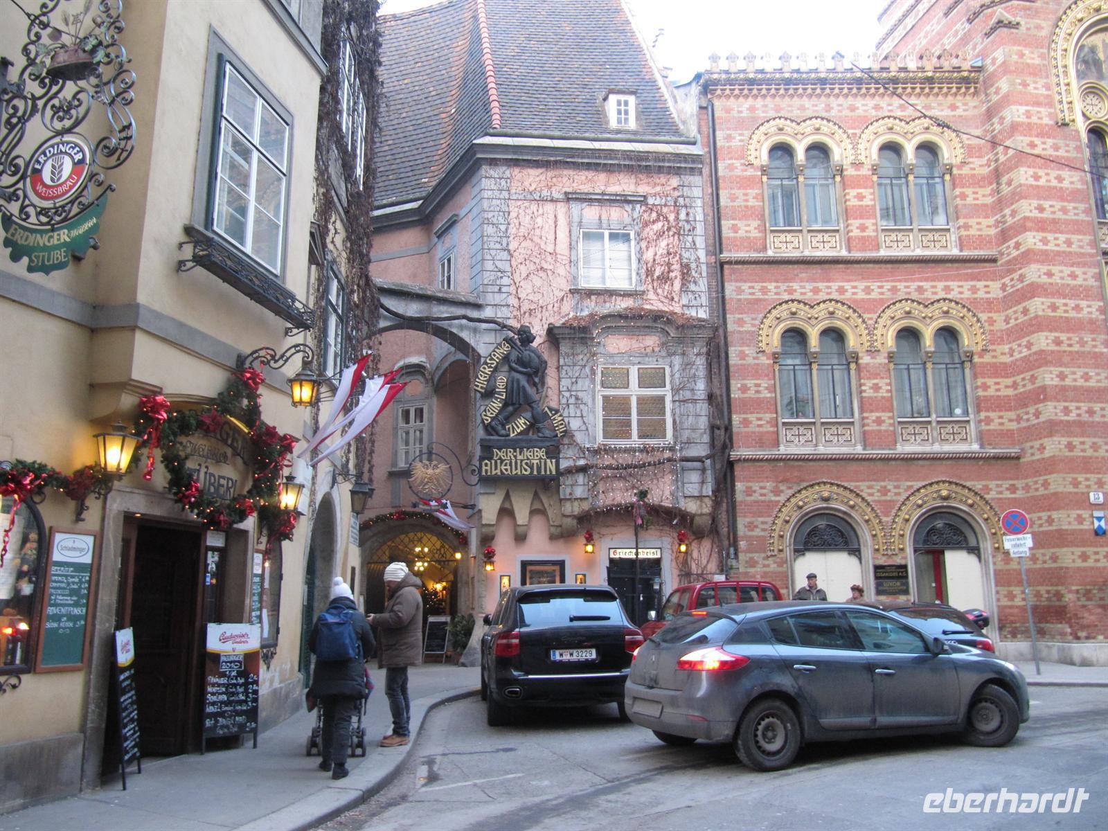 Durch enge Gassen führte uns der Weg zum ältesten Restaurant der Stadt zum „Griechenbeisl“ (seit 1447 Restaurant) am Fleischmarkt. Im 17. Jahrhundert trat hier regelmäßig der Bänkelsänger und Sackpfeifer Marx Augustin („Der liebe Augustin“) auf. An ihn erinnert eine beim Lokaleingang unter dem Fußabstreifer sitzende Augustin-Figur, der man Geld in den Hut werfen kann. Wir schauten auf ihn herab und einige gaben ihm einen kleinen Obolus. Der Legende nach, kommt man als Gast zurück nach Wien ...