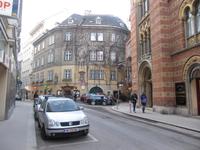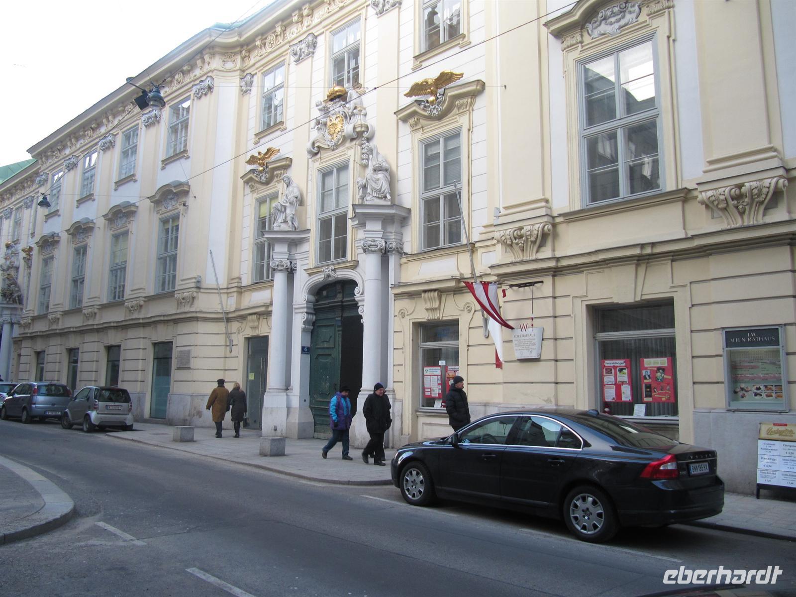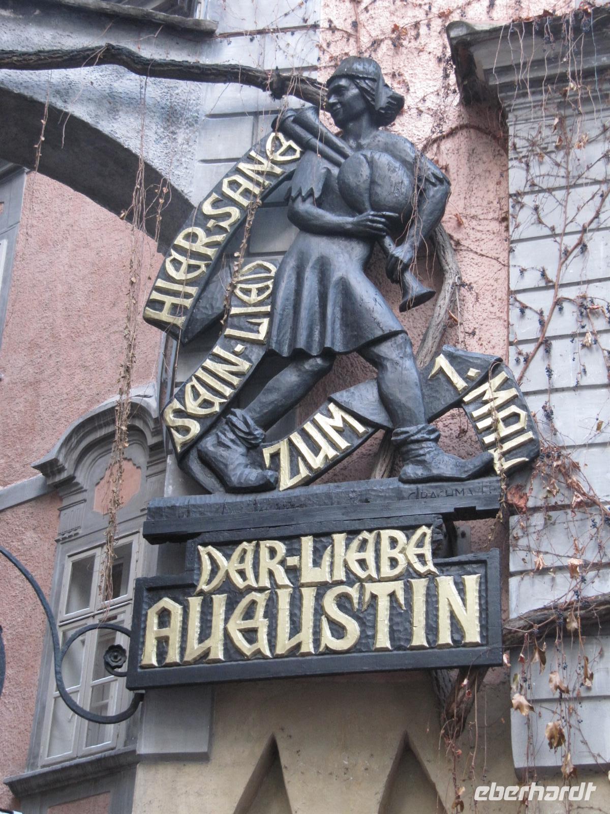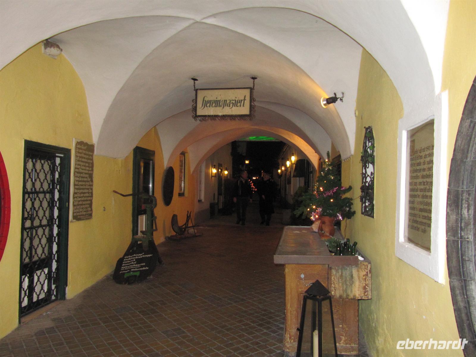 Durch enge Gassen führte uns der Weg zum ältesten Restaurant der Stadt zum „Griechenbeisl“ (seit 1447 Restaurant) am Fleischmarkt. Im 17. Jahrhundert trat hier regelmäßig der Bänkelsänger und Sackpfeifer Marx Augustin („Der liebe Augustin“) auf. An ihn erinnert eine beim Lokaleingang unter dem Fußabstreifer sitzende Augustin-Figur, der man Geld in den Hut werfen kann. Wir schauten auf ihn herab und einige gaben ihm einen kleinen Obolus. Der Legende nach, kommt man als Gast zurück nach Wien ...
