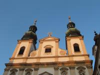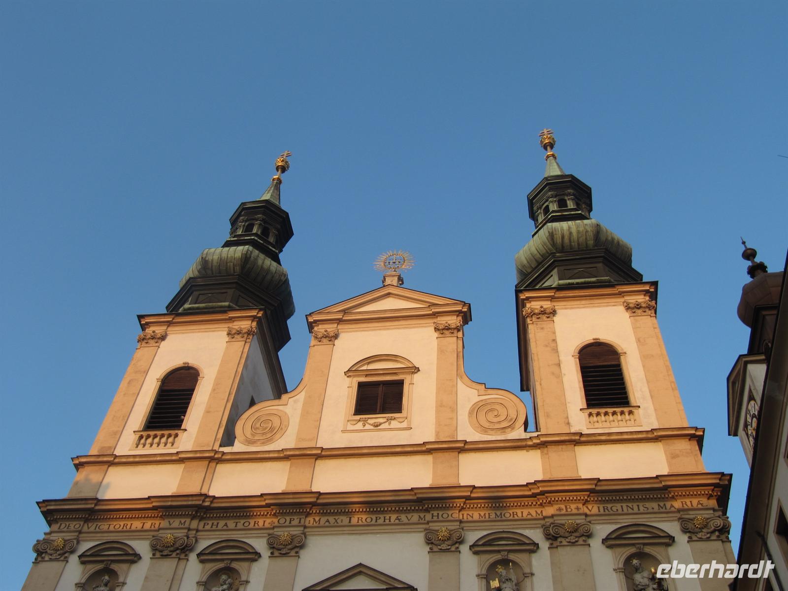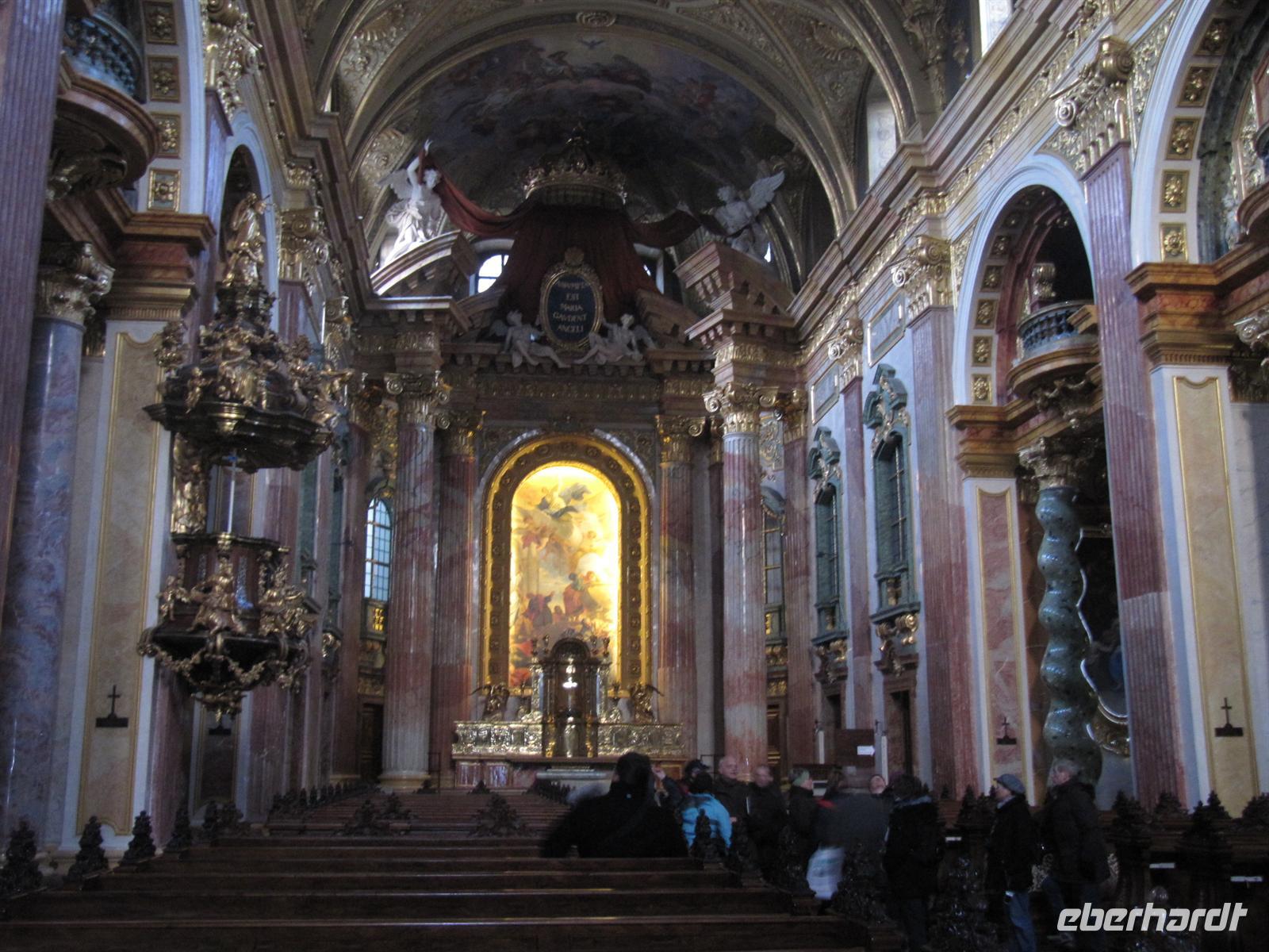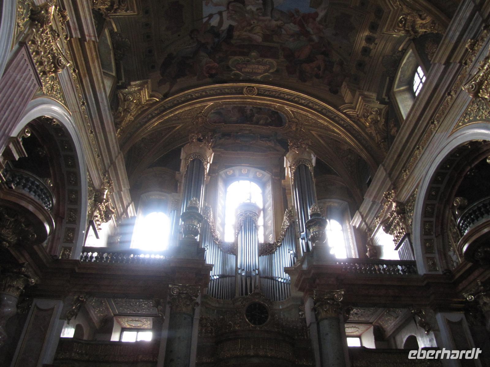 Herr Paminger führte uns durch versteckte Höfe zur Jesuitenkirche, die uns mit ihrer illusionistischen Deckenmalerei faszinierte: Inmitten des Langhauses täuscht sie eine zentrale Kuppel vor. Anfang des 17. Jahrhunderts erbaut, wurde die Kirche zu Beginn des 18. Jahrhunderts hochbarock umgestaltet. Früher wurde sie auch als Universitätskirche bezeichnet. Beeindruckend schön das Wechselspiel von geraden und geschwungenen Säulen, als hätte Hundertwasser bereits hier gewirkt. Für uns besonders interessant ist, dass die Orgel 2003 bis 2004 vom Freiburger Orgelbauer Hartwig Späth erbaut wurde.