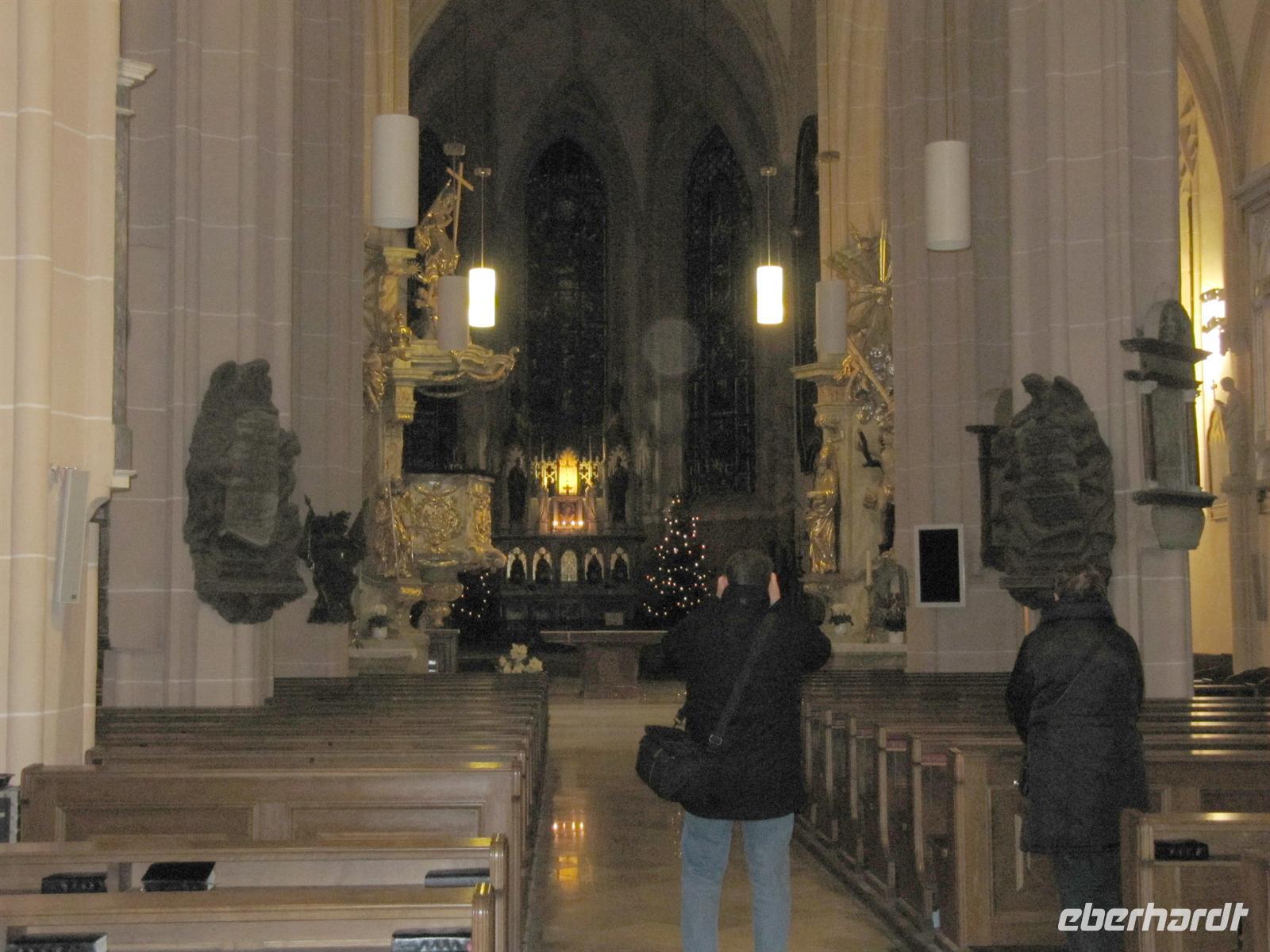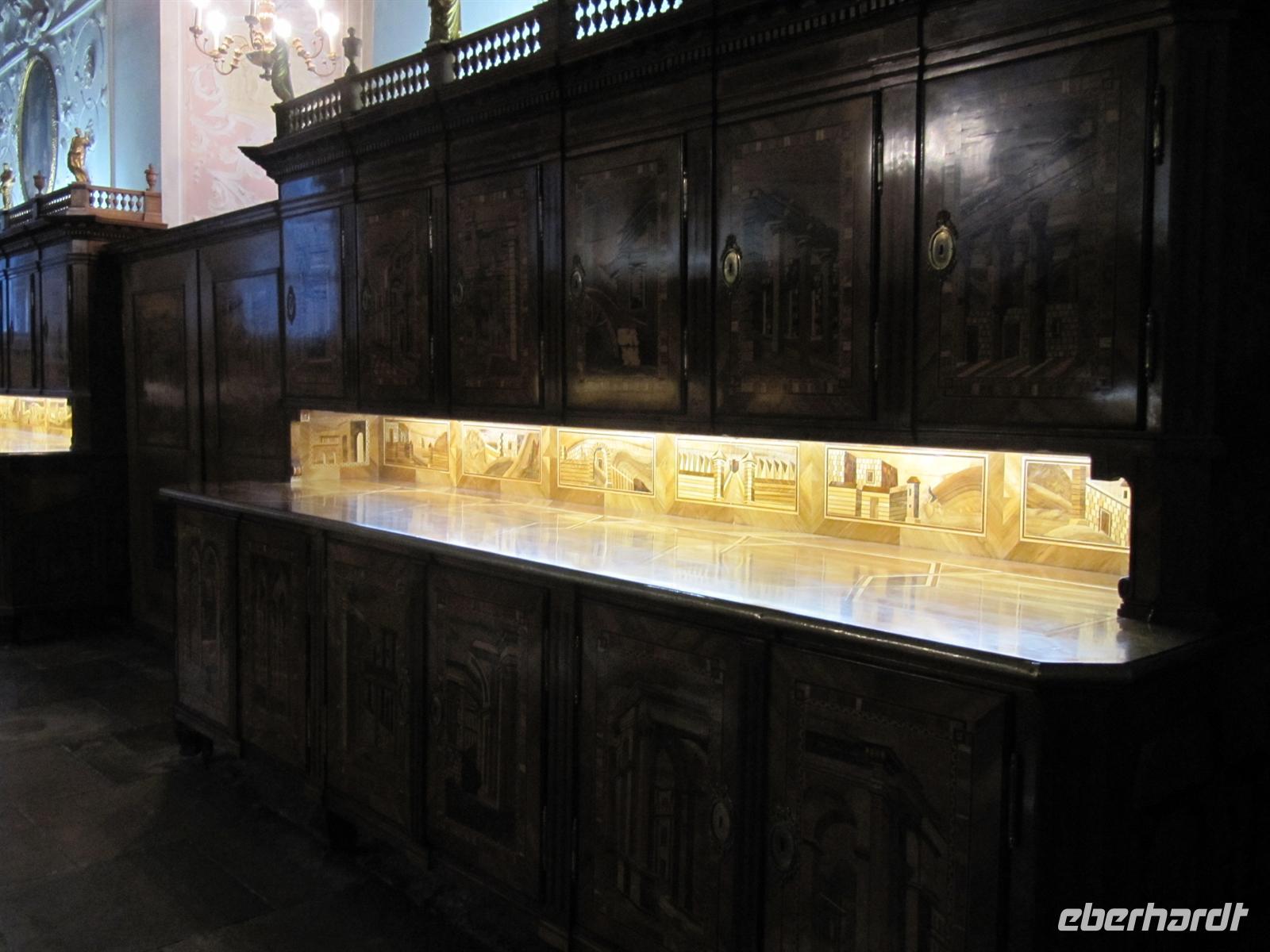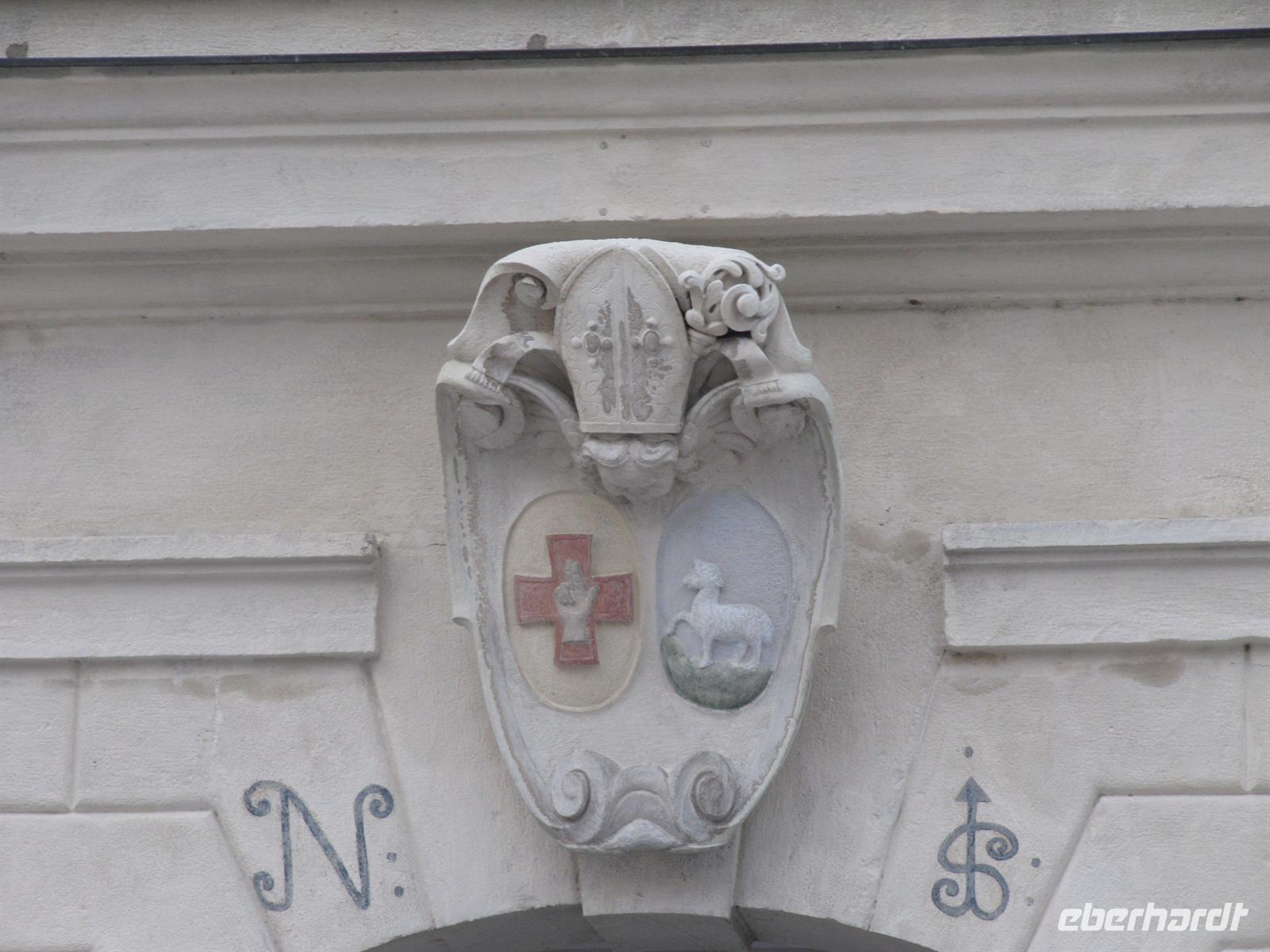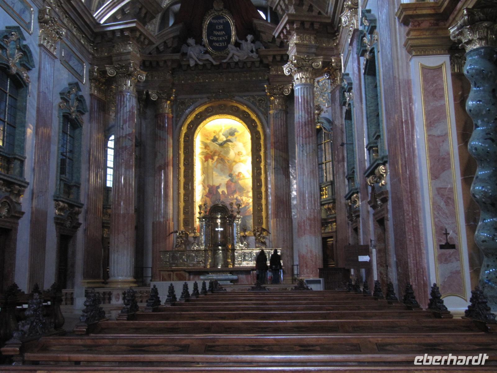 Herr Paminger führte uns durch versteckte Höfe zur Jesuitenkirche, die uns mit ihrer illusionistischen Deckenmalerei faszinierte: Inmitten des Langhauses täuscht sie eine zentrale Kuppel vor. Anfang des 17. Jahrhunderts erbaut, wurde die Kirche zu Beginn des 18. Jahrhunderts hochbarock umgestaltet. Früher wurde sie auch als Universitätskirche bezeichnet. Beeindruckend schön das Wechselspiel von geraden und geschwungenen Säulen, als hätte Hundertwasser bereits hier gewirkt. Für uns besonders interessant ist, dass die Orgel 2003 bis 2004 vom Freiburger Orgelbauer Hartwig Späth erbaut wurde.