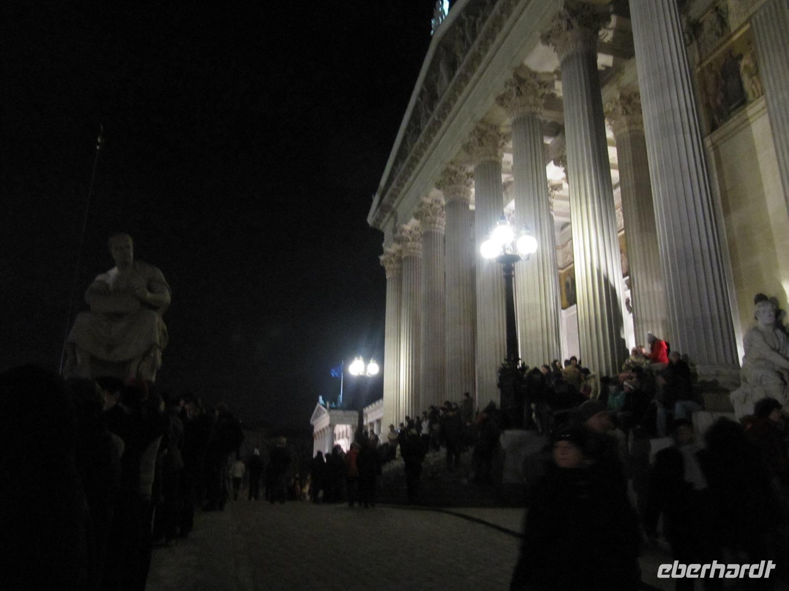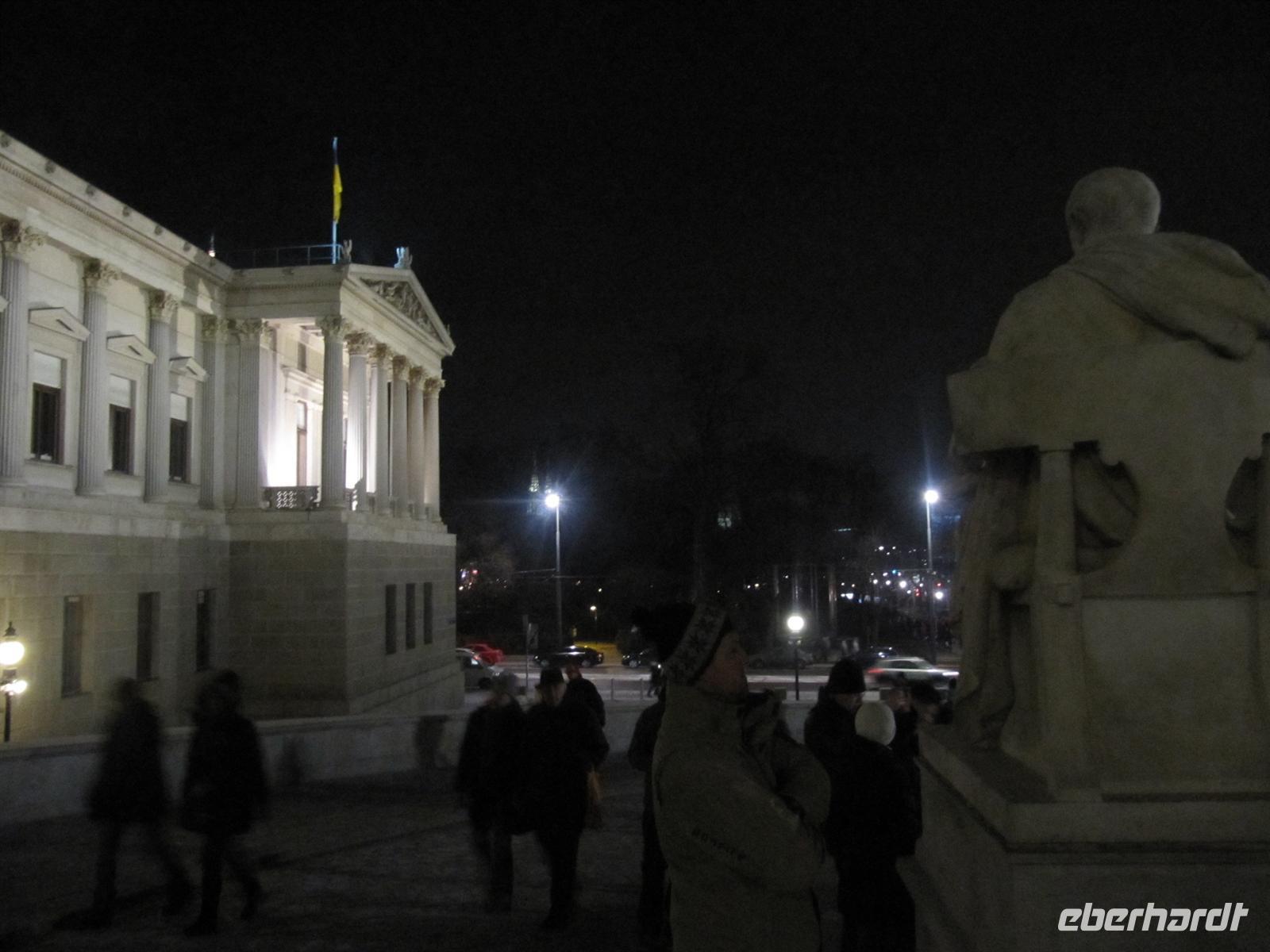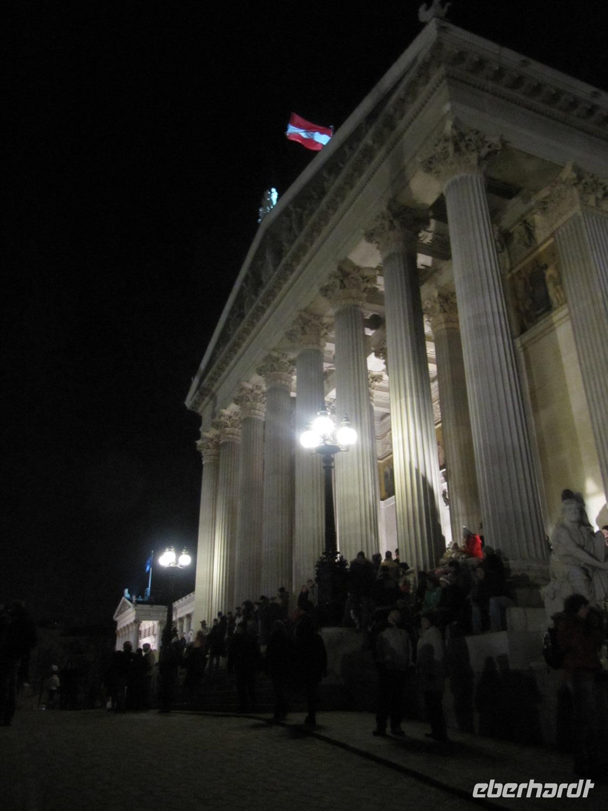 Zehn Bühnen vom Rathausplatz über die Freyung, den wundervoll gestalteten Graben, natürlich am Steffl, der Kärntner Straße bis zum Neuen Markt boten ein vielfältiges Programm: Rock und Pop, Schlager, Operettenklassiker, Musicals der Welt, Blasmusik - dazwischen Clowns und Gaukler sowie immer wieder „Standl“ mit den berühmten Glücksbringern - allen voran die „Schweinerl“ ... Im Haus der Musik konnte man selbst einen Walzer dirigieren ... Jung und alt waren unterwegs, es war einfach faszinierend schön, gemeinsam mit vielen Wienern und Gästen der Stadt so stimmungsvoll die Zeit bis zum Jahreswechsel zu verbringen. Ich gebe es zu, die in Deutschland übliche Knallerei zwischen den Menschen ist auch nicht mein Ding. Aber davon war hier in Wien nichts zu spüren: Überall freundliche Gesichter voller Erwartung, überall lag eine gewisse Gemütlichkeit, die den Wienern so eigen ist, in der Luft. Dazu wurde getanzt und gesungen - die Straßen und Plätze verwandelten sich zu einem riesigen Ballsaal. Faszinierend auch die geschmackvolle Beleuchtung der Straßen: An der Wollzeile - riesige beleuchtete rote Wollknäuel, im Graben eine Beleuchtung, die an Kronleuchter erinnerte ... es passte alles prima zusammen. Wir haben den Abend mit einem ausführlichen Bummel über den Silvesterpfad genießen können und spazierten dann vorbei an der Albertina und der Hofburg zum Rathausplatz. Am Wiener Burgtheater machten wir einen Abstecher, um das imposante und prächtige Foyer mit der großen Freitreppe zu bestaunen. Und vom Vorplatz bot sich uns ein Panoramablick zum Rathaus. Wir lauschten der Musik der Blues Brothers und begaben uns dann in Richtung Parlament, um von dort das große Feuerwerk auf dem Heldenplatz zu genießen. Wir standen in der ersten Reihe und es war ein wunderschönes Erlebnis, dieses Feuerwerk zu bestaunen.