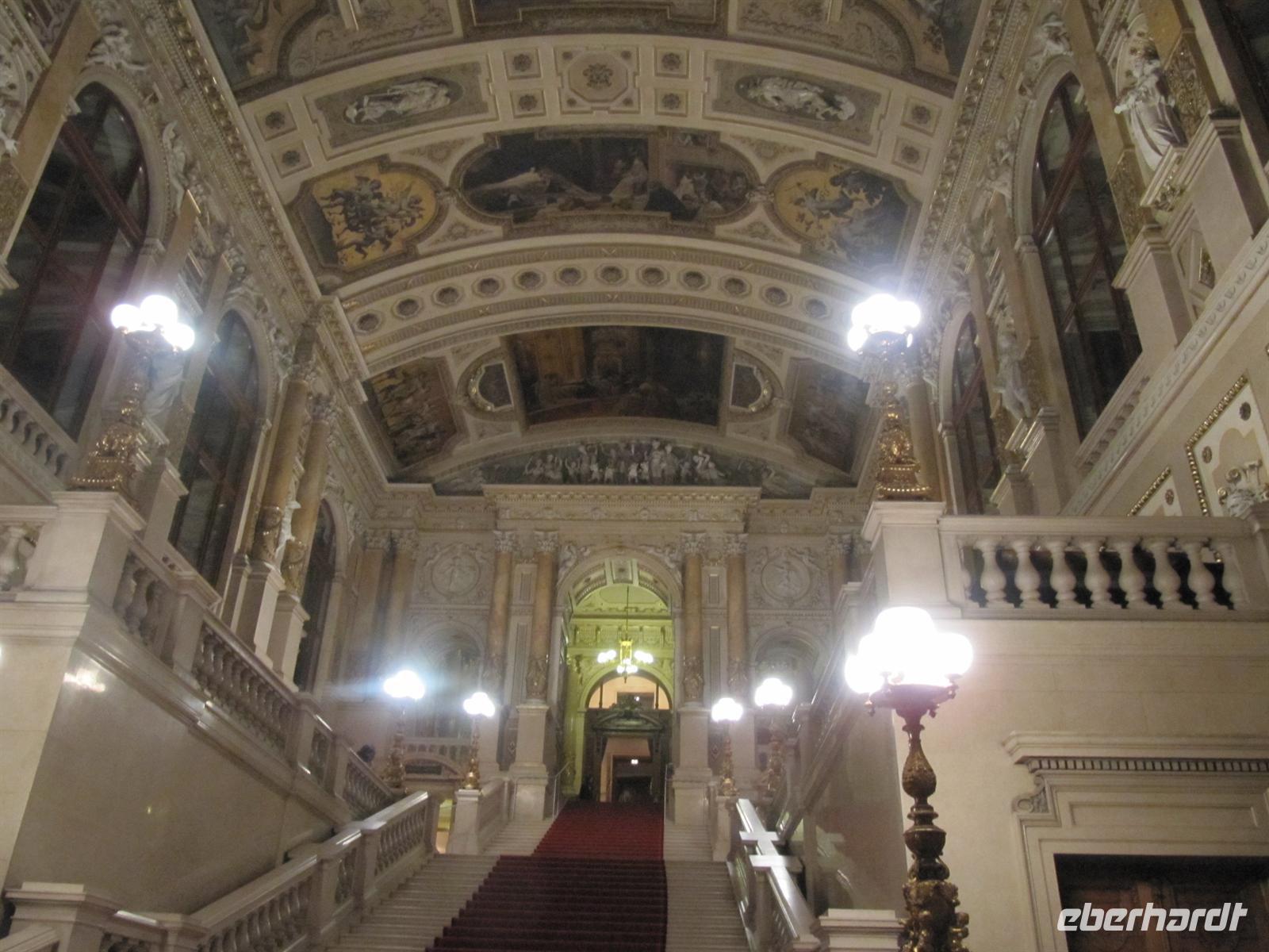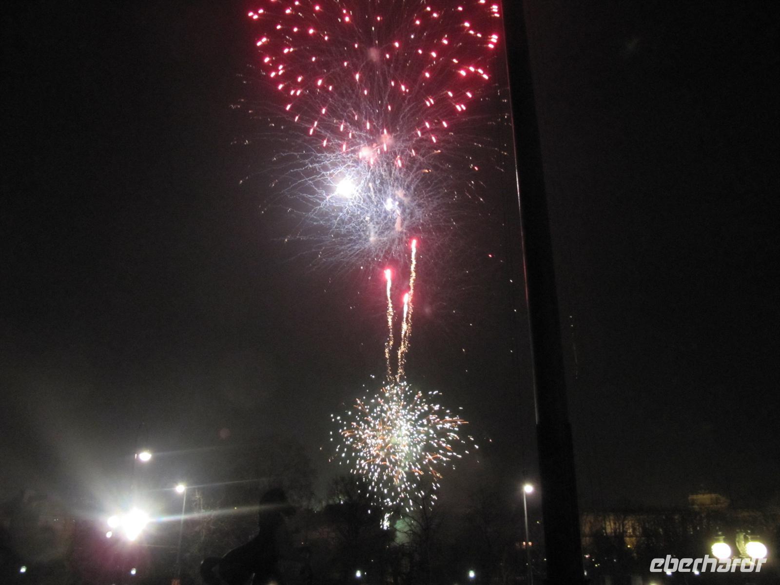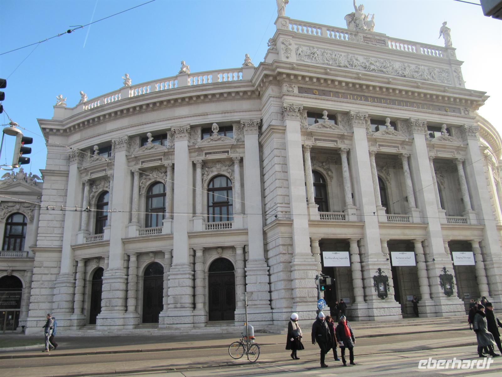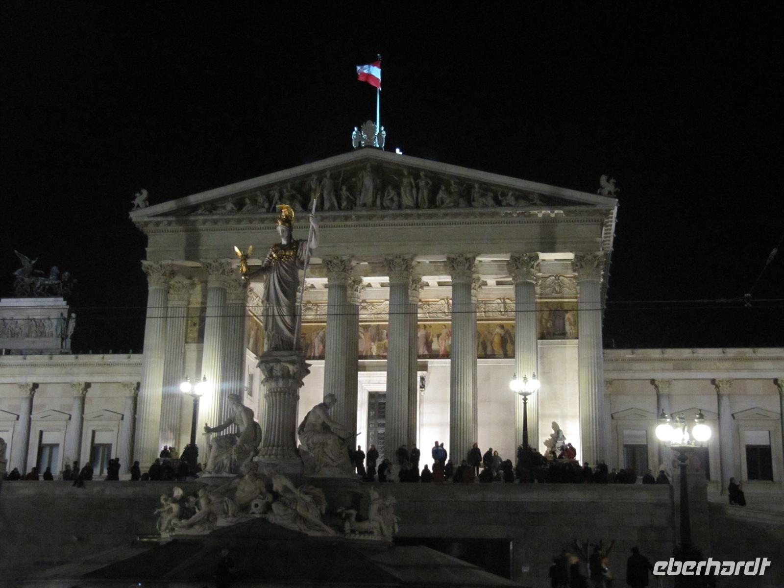 Zehn Bühnen vom Rathausplatz über die Freyung, den wundervoll gestalteten Graben, natürlich am Steffl, der Kärntner Straße bis zum Neuen Markt boten ein vielfältiges Programm: Rock und Pop, Schlager, Operettenklassiker, Musicals der Welt, Blasmusik - dazwischen Clowns und Gaukler sowie immer wieder „Standl“ mit den berühmten Glücksbringern - allen voran die „Schweinerl“ ... Im Haus der Musik konnte man selbst einen Walzer dirigieren ... Jung und alt waren unterwegs, es war einfach faszinierend schön, gemeinsam mit vielen Wienern und Gästen der Stadt so stimmungsvoll die Zeit bis zum Jahreswechsel zu verbringen. Ich gebe es zu, die in Deutschland übliche Knallerei zwischen den Menschen ist auch nicht mein Ding. Aber davon war hier in Wien nichts zu spüren: Überall freundliche Gesichter voller Erwartung, überall lag eine gewisse Gemütlichkeit, die den Wienern so eigen ist, in der Luft. Dazu wurde getanzt und gesungen - die Straßen und Plätze verwandelten sich zu einem riesigen Ballsaal. Faszinierend auch die geschmackvolle Beleuchtung der Straßen: An der Wollzeile - riesige beleuchtete rote Wollknäuel, im Graben eine Beleuchtung, die an Kronleuchter erinnerte ... es passte alles prima zusammen. Wir haben den Abend mit einem ausführlichen Bummel über den Silvesterpfad genießen können und spazierten dann vorbei an der Albertina und der Hofburg zum Rathausplatz. Am Wiener Burgtheater machten wir einen Abstecher, um das imposante und prächtige Foyer mit der großen Freitreppe zu bestaunen. Und vom Vorplatz bot sich uns ein Panoramablick zum Rathaus. Wir lauschten der Musik der Blues Brothers und begaben uns dann in Richtung Parlament, um von dort das große Feuerwerk auf dem Heldenplatz zu genießen. Wir standen in der ersten Reihe und es war ein wunderschönes Erlebnis, dieses Feuerwerk zu bestaunen.