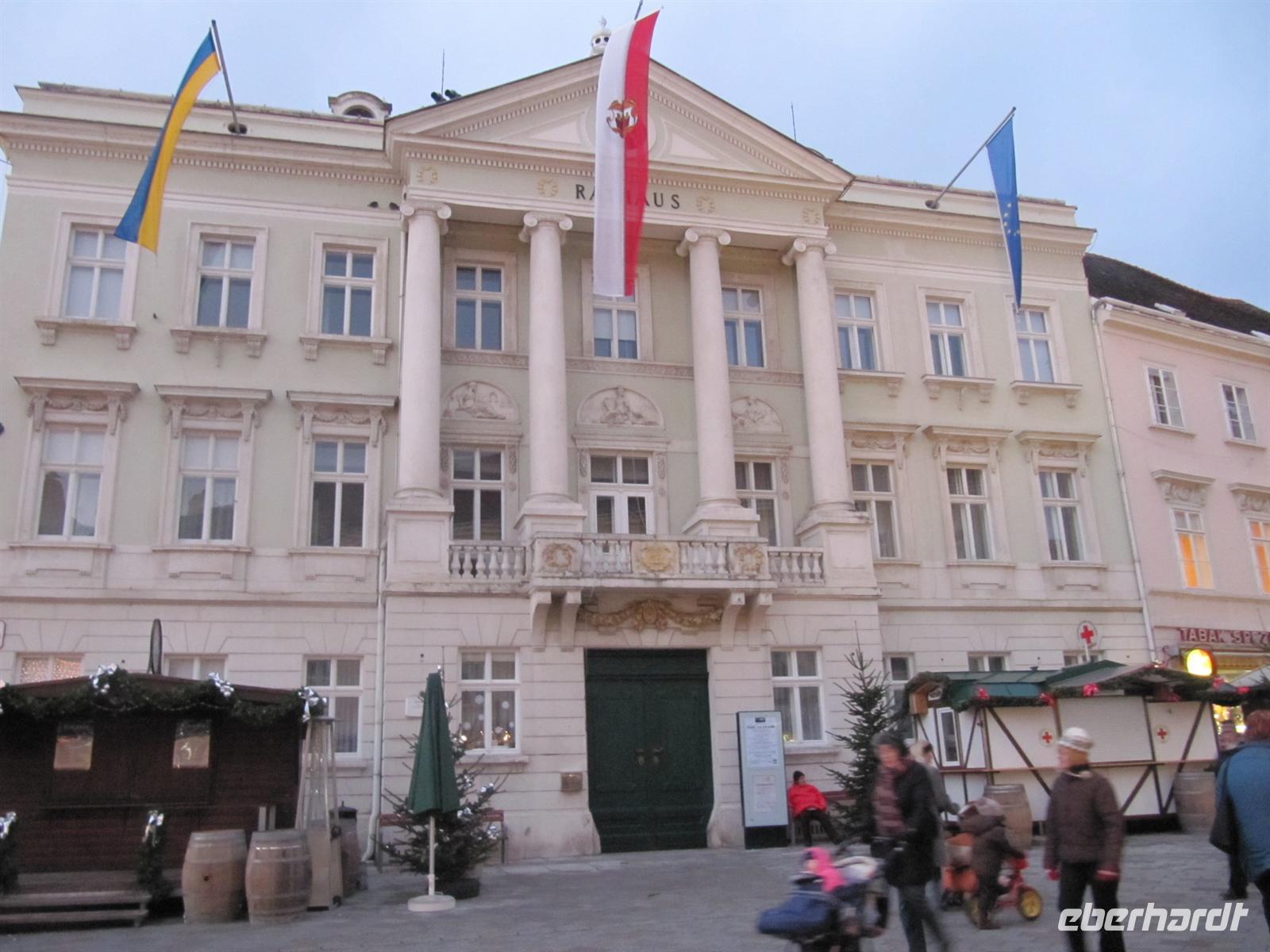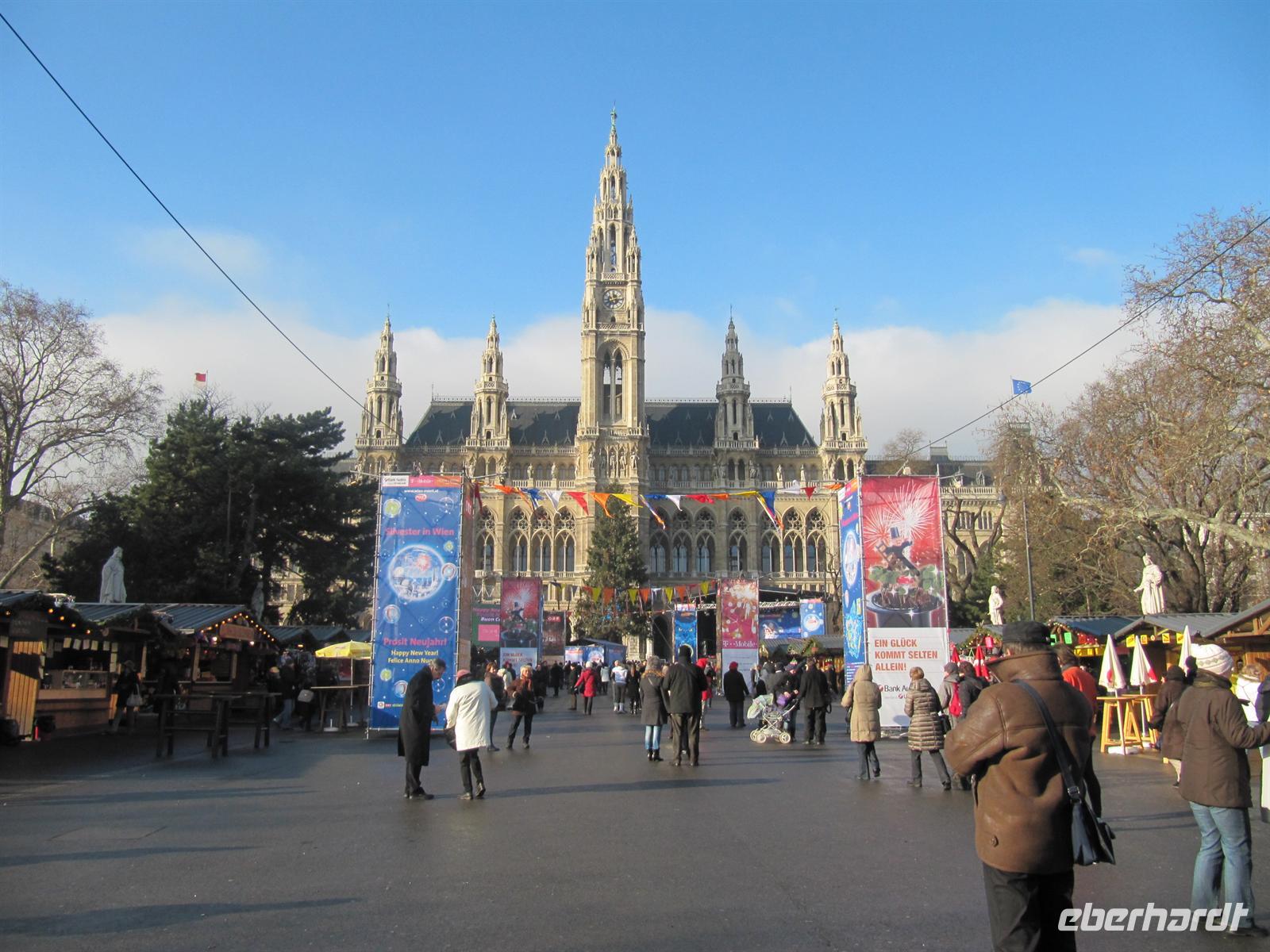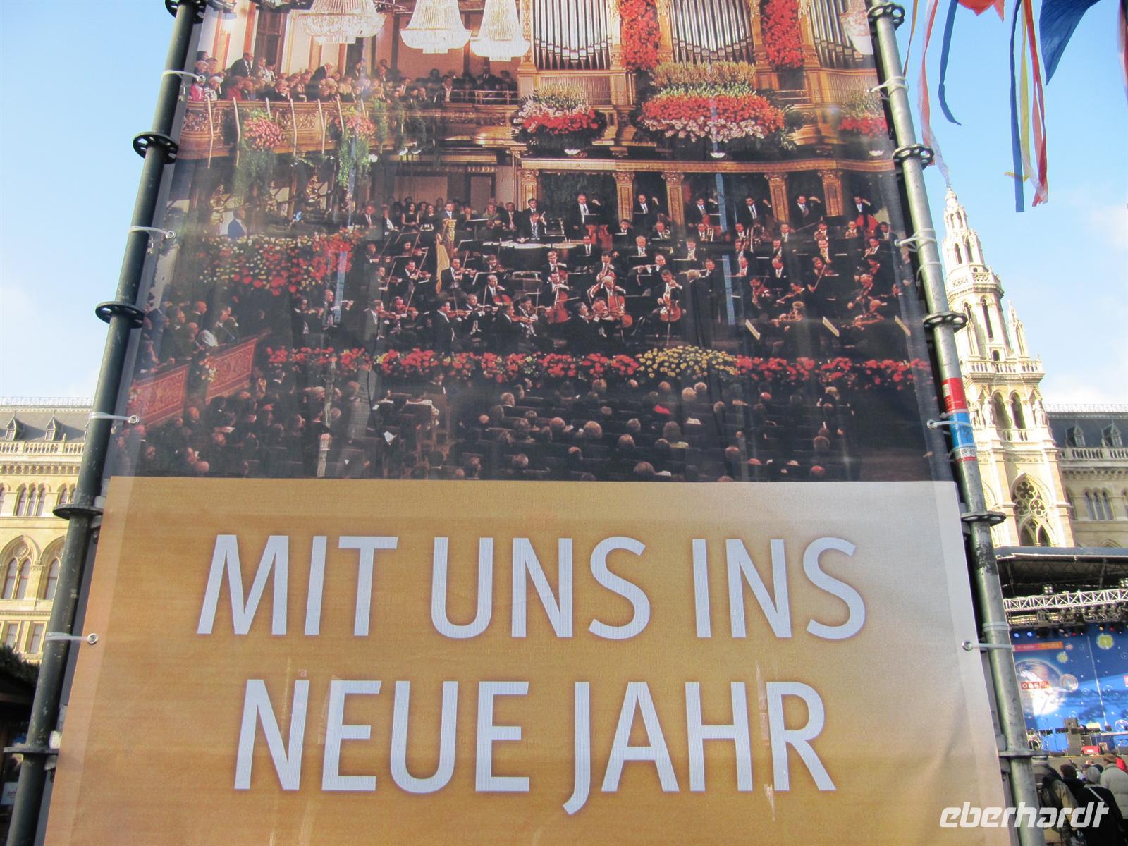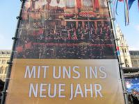 Am Neujahrsmorgen zog es uns sofort wieder in die Innenstadt. Am Rathaus lud uns der Silvestermarkt zum Einklang ins Neue Jahr ein und dazu 11.00 Uhr die Live-Übertragung des Neujahrskonzertes der Wiener Philharmoniker, dirigiert von Franz Welser-Möst. Mit Werken der Strauß-Dynastie sowie von Joseph Lanner, Joseph Hellmesberger und Franz Liszt, präsentierten Orchester und Dirigent diese „wienerischte“ aller Musik (so Clemens Hellsberg, Vorstand der Wiener Philharmoniker) nicht nur dem Publikum im Goldenen Saal, sondern auch Tausenden Besuchern vor dem Wiener Rathaus. Welch ein Erlebnis bei strahlendem Sonnenschein - und wir tanzten und schunkelnden einfach mit!