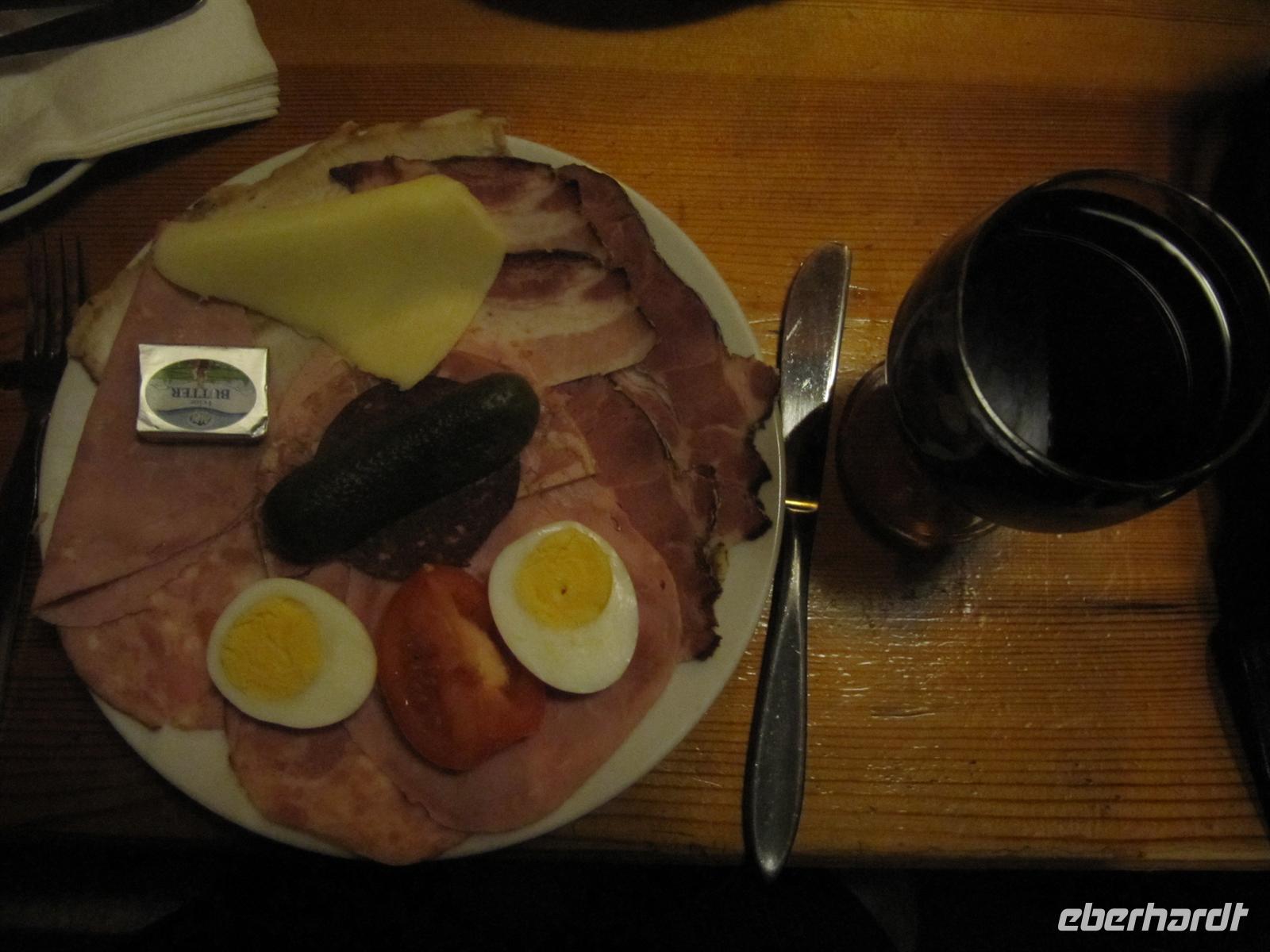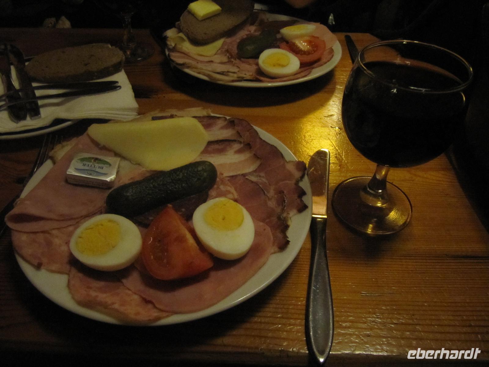 Nun war es Zeit für unseren Besuch in einem der Heurigenlokale rund um Wien. Für uns waren beim Heurigen „Bruckberger“ in Gumpoldskirchen Plätze reserviert. Unterwegs stimmten wir uns mit Wiener Heurigenmusik auf den Besuch ein. Für uns war eine Jause vorbereitet. Allen mundete diese kalte Braten-Käseplatte sehr, dazu wurde ein Viertel Grüner Veltliner oder Zweigelt gereicht. Und diese hier gekelterten Tropfen schmeckten uns vortrefflich. Der Familienbetrieb einer Weinbauernfamilie weist auf eine Tradition von mehr als 300 Jahren zurück. Und so wird auch heute das Wiener Lied gepflegt. Die Musiker unterhielten uns bestens und wir sangen, klatschten und schunkelnden kräftig mit. Da staunten selbst die Musiker. Es war ein stimmungsvoller Ausklang der Reise. Mit guter Laune und einem Lied auf der Lippe fuhren wir zurück nach Wien. Unterwegs erfreuten wir uns über den Blick auf Wien. Nach der Ankunft im Hotel saßen wir noch etwas zusammen und es wurden bereits erste Reisepläne für den Jahreswechsel 2011/12 geschmiedet.