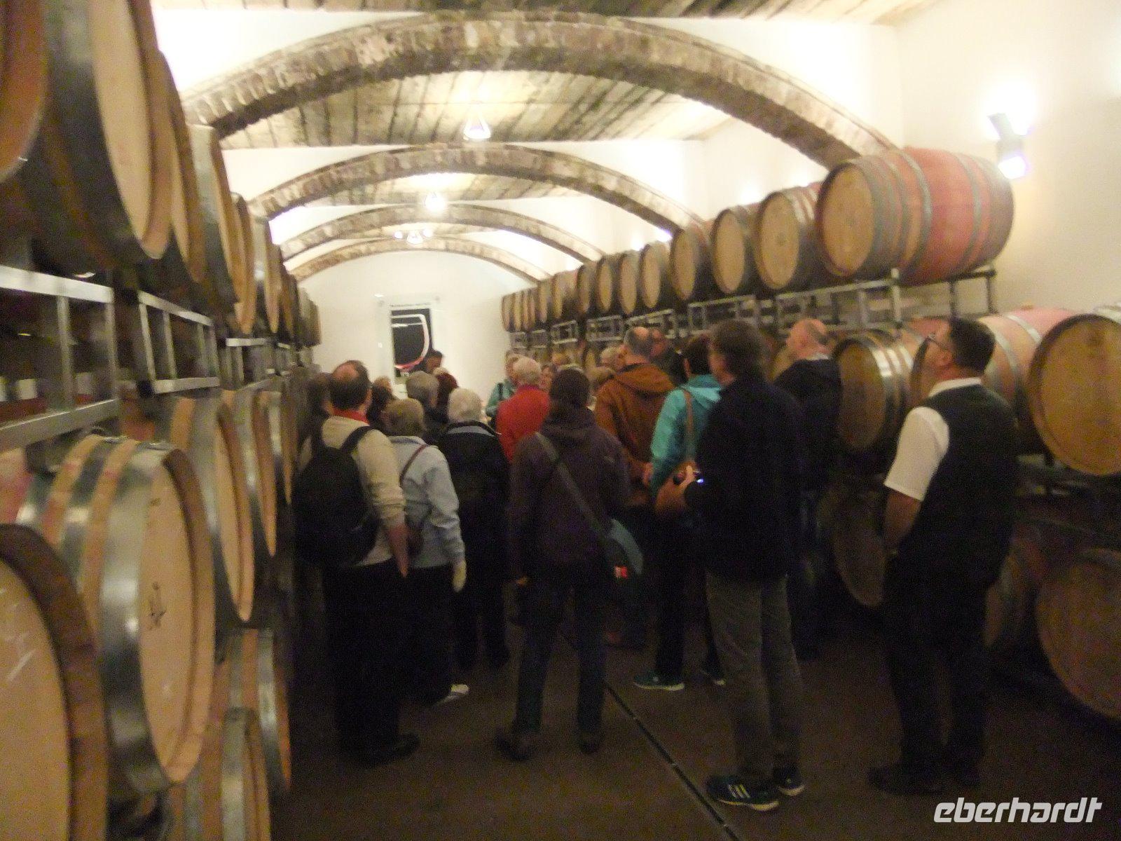 Feuchtfröhlich wird es dann bei unserem letzten Programmpunkt. Wir besuchen das Weingut der Familie Auer in Tattendorf. Zwischen den Fässern im Weinkeller erfahren wir u.a., dass die Familie ihre Weingärten nach biologischen Aspekte bearbeitet und dass der Tattendorfer Schwemmlandboden sowie das milde Klima in der Region eine perfekte Grundlage für den Weinanbau bilden. Nach der Theorie kommt die Praxis: Drei Weißweine, einen Rosé und 4 Rotweine dürfen wir verkosten. Dazu schmecken die leckeren Brotaufstriche der Winzerin.