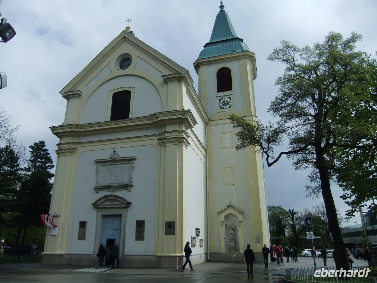 Der bekannteste Aussichtsberg Wiens ist der Kahlenberg. Tilo bringt uns mit dem Bus zum Bergplateau unterhalb des Gipfels. In der Nähe des weithin sichtbaren Stahlrohrmastes des ORF machen wir auch unsere Mittagspause. In der Nähe befindet sich die kleine Kirche St. Josef, von der es nur wenige Schritte bis zur Aussichtsterrasse sind. Wien und die Donau liegen uns zu Füßen.