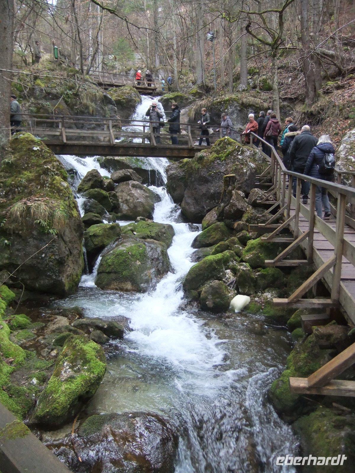 Am Frühstücksbuffet stärken wir uns für den heutigen Tag. Das Ausflugsprogramm verspricht Abwechslung rund um den Schneeberg. Josef will uns Interessantes und Sehenswertes seiner Heimatregion zeigen. Zuerst bringt uns Chauffeur Falk mit dem Bus durch das Piestingtal nach Muggendorf, wo uns ein besonderes Naturschauspiel erwartet: die Myra-Wasserfälle, die bereits seit über 125 Jahren touristisch erschlossen sind. Einige Gäste spazieren über die hölzernen Brücken und Stiegen nach oben und wir lauschen dem Tosen des Wassers.
