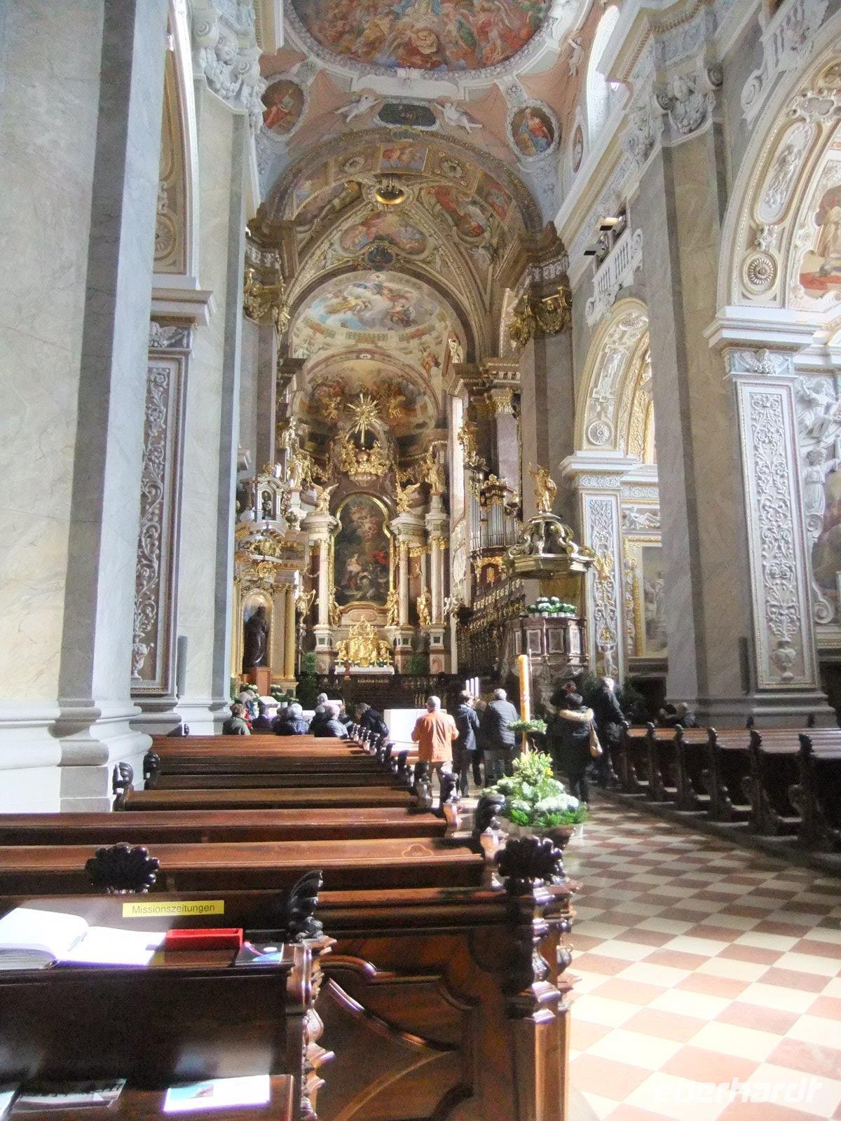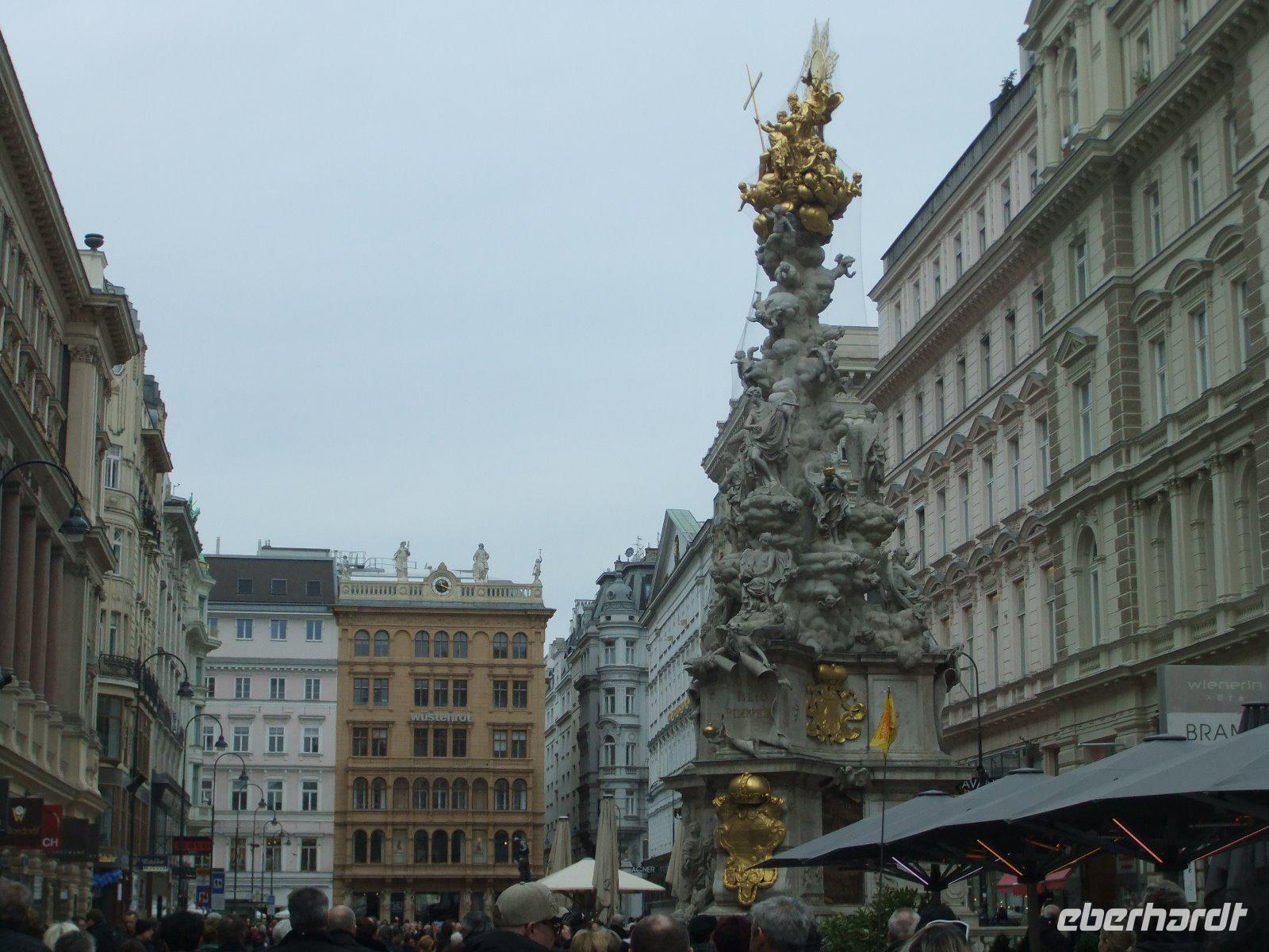 Am Schwedenplatz verlassen wir den Bus. Josef möchte uns gern seine Wiener Lieblingskirche zeigen: die Jesuitenkirche. Auch uns beeindruckt die Ausstattung. Wir spazieren weiter zum Stephansdom, bestaunen die Pestsäule am Graben, schauen in die Schaufenster der bekannten Konditorei Demel, überqueren den Michaelerplatz und erreichen schließlich die Hofburg. Nach einem Abstecher zum Heldenplatz laufen wir zum Josefsplatz, dann vorbei am Hotel Sacher zur Kärntner Straße. Hier in der Fußgängerzone mit eleganten Läden und Restaurants bleibt Zeit für individuelle Erkundungen. Am Stephansdom treffen wir uns alle wieder.