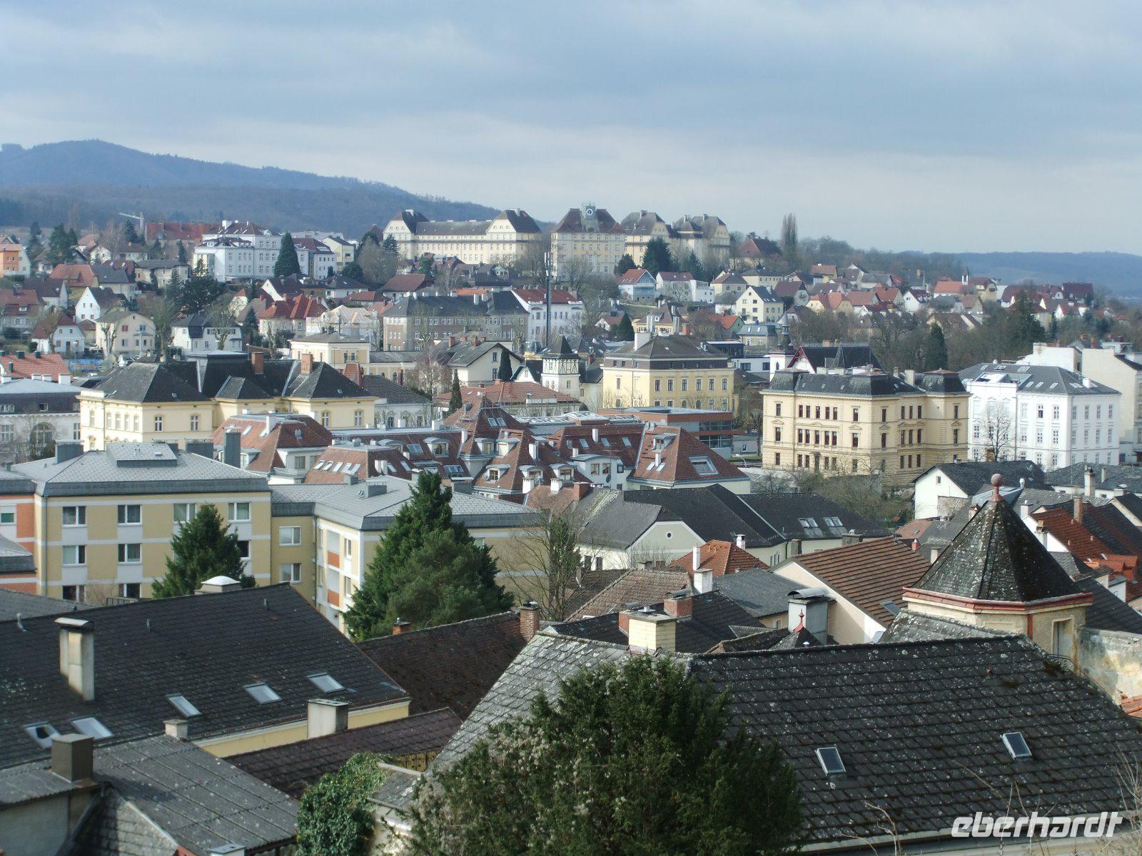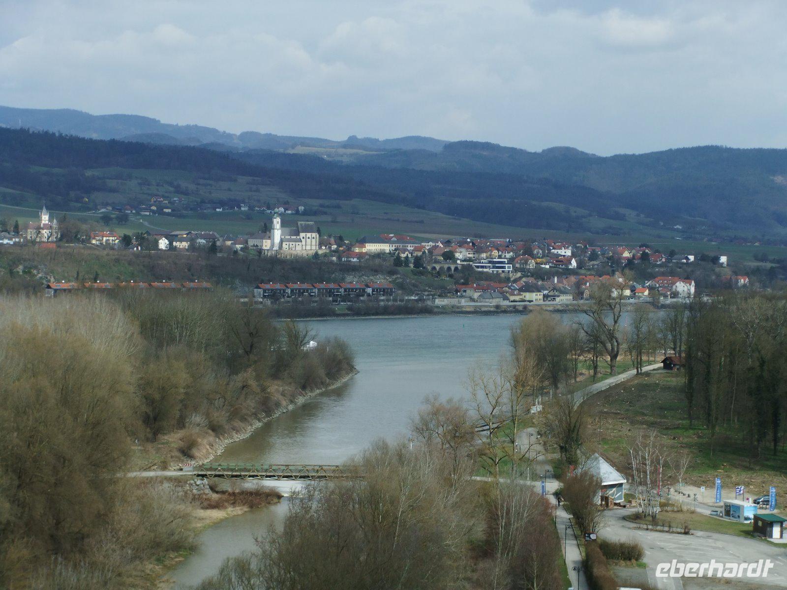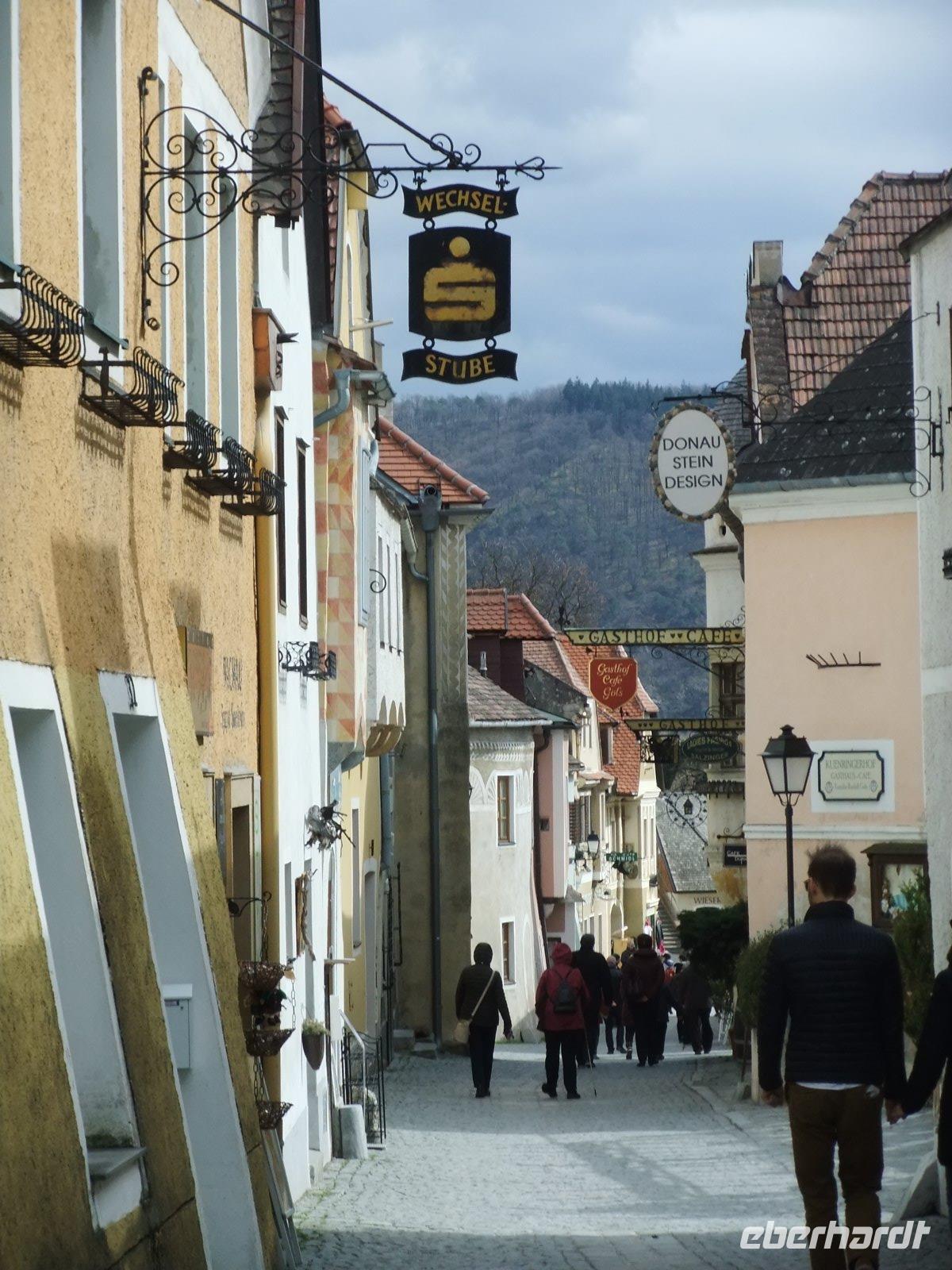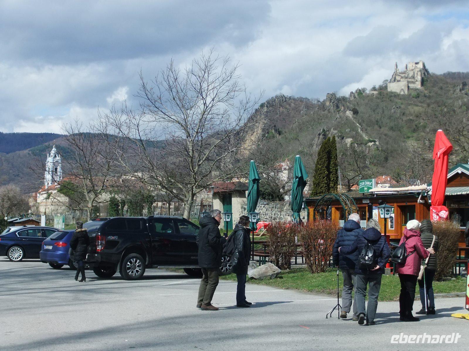 Zum Mittagessen treffen wir uns alle wieder am Bus. Weiter geht die Fahrt entlang der Donau durch die bezaubernde Landschaft der Wachau. Es geht zunächst über die Donau, wir sehen Schloss Schönbühl, fahren entlang des Flusses weiter, kommen durch Spitz und blicken hinauf zur Burgruine Aggstein. Bald sind in der Ferne der blaue Kirchturm und die Burgruine von Dürnstein zu sehen. Bei unserer Ankunft auf dem Parkplatz gibt es heute ein flüssiges „Osterei": Marillenlikör. Danach spazieren wir durch die verträumten Gassen des Ortes bis zum Renaissance-Schloss. Wir entdecken dabei lauschige Innenhöfe, schmiedeeiserne Fensterkörbe, romantische Weinlokale und zahlreiche kleine Läden, die Souvenirs und Produkte der Region anbieten. Heftige Windböen „wehen" uns wieder zum Bus. Mit dem „Mariandl-Lied" verabschieden wir uns von der Wachau und fahren vorbei an Krems, dem Stift Göttweig und St. Pölten in die Wiener Alpen zurück.