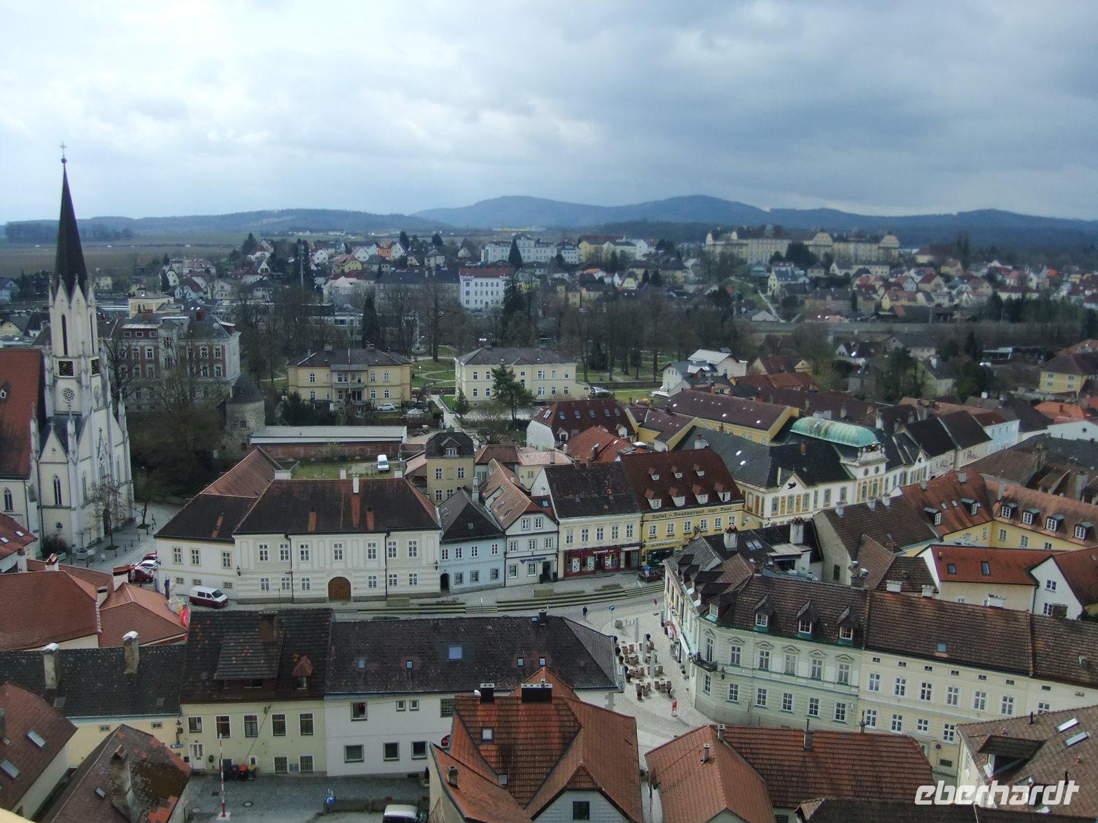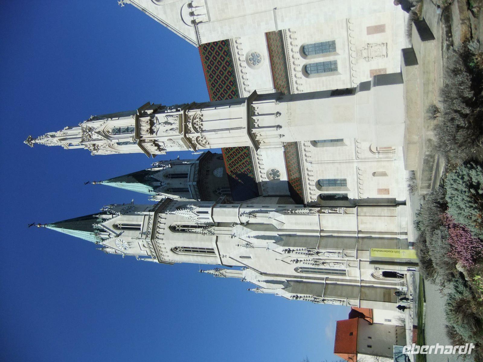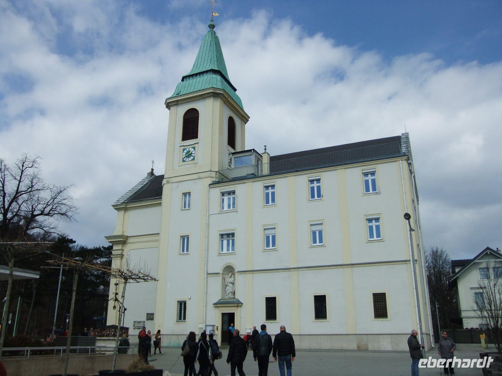 Vorbei an der Burgruine Gutenstein fahren wir weiter auf den Mariahilfberg, einen bedeutenden katholischen Wallfahrtsort. Oben angekommen wird erst einmal ein Grupppenfoto gemacht. Dann gibt es für die Gäste ein kulinarisches „Osterei": delikaten Eiersalat. Nun besichtigen wir die Wallfahrtskirche. Von deren Eingang kann man bis Schneeberg sehen. Dessen Gipfel hüllt sich allerdings in Wolken.
