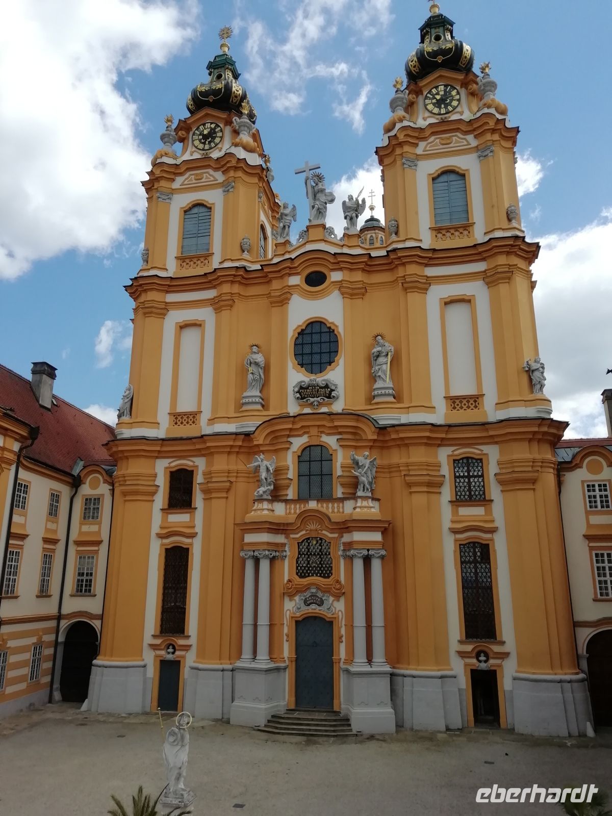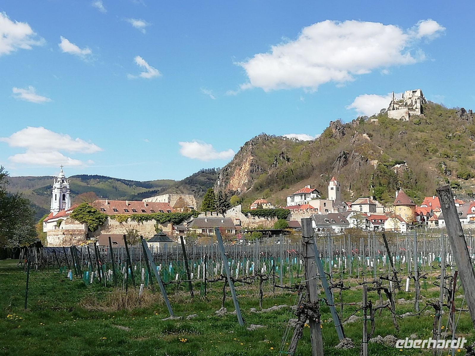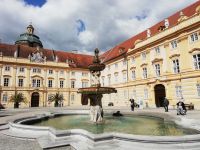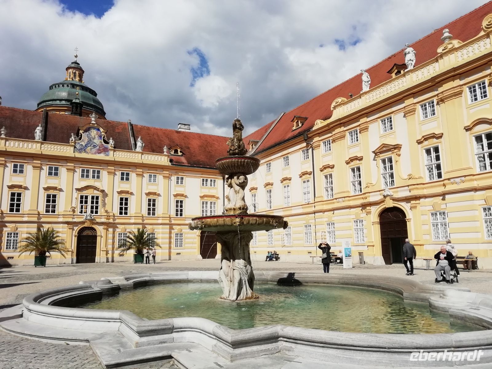 Die romantische Uferlandschaft der Wachau mit schroffen Felsen und sanften Weinhängen, bezaubernden Winzerhäusern und monumentalen Schlössern und Klöstern wollen wir heute kennen lernen. Doch als erstes begrüßen uns heute beim Frühstück viele lila Schmunzelhasen. Bei strahlendem Sonnenschein starten wir dann gut gelaunt zum Wachauausflug. Es geht über den „Hals“ ins Triestingtal und weiter durch den Wiener Wald – auch die grüne Lunge Wiens genannt. Nach etwa eineinhalb Stunden sehen wir dann von weitem das mächtige Stift Melk hoch über der Donau. Hier ist für uns eine Führung reserviert. Bis dahin bleibt noch etwas Zeit. Deshalb fahren einige noch in der Nordbastei hinauf zur Aussichtsplattform. Dann treffen wir uns alle im Innenhof, wo die Führung beginnt. Zunächst geht es über die Kaiserstiege in den Kaisergang. Im modern gestalteten Stiftsmuseum erhalten wir Einblicke in die Geschichte des Stifts und in das Klosterleben. Dann kommen wir in den Marmorsaal und auf die Altane. Hier bietet sich uns ein großartiger Ausblick auf den Ort Melk, die Donaulandschaft und die Westfassade der Stiftskirche. Anschließend besichtigen wir noch die bekannte Stiftsbibliothek. Die prunkvolle Stiftskirche ist dann der Abschluss und Höhepunkt unseres Rundgangs. Hier findet gerade das Mittagsgebet mit dem Abt des Stiftes statt und wir können dem Klang der großen Orgel lauschen. Nun bleibt noch Zeit für einen Besuch im Stiftspark, dann treffen wir uns zum Mittagessen wieder am Bus. Weiter geht die Fahrt entlang der Donau durch die bezaubernde Landschaft der Wachau. Dabei hören wir uns das bekannte Mariandl-Lied an. Zwar blühen die Marillenbäume noch nicht, dafür präsentieren die Kirsch- und Apfelbäume ihre Blütenpracht. Wir blicken hinauf zur Burgruine Aggstein, kommen durch Willendorf, das durch den Fund der Venus von Willendorf bekannt wurde, und durch Spitz. Dieser Ort liegt zu Füßen der Burgruine Hinterhaus am sogenannten „Tausendeimerberg“. Man sagt, dass der Ertrag dieses Weinberges in guten Jahren bei 1.000 Eimern, das heißt bei 57.000 Litern Wein liegt. Bald sind in der Ferne der blaue Kirchturm und die Burgruine von Dürnstein zu sehen. Einige Gäste lassen sich mit dem Wachau-Bummelzug durch die Weinberge in den Ortskern chauffieren, andere spazieren durch die verträumten Gassen des Ortes bis zum Renaissance-Schloss. Dann verabschieden wir uns von der Wachau und fahren vorbei an Krems, dem Stift Göttweig und St. Pölten zurück zum Hotel. Dabei machen wir noch einen Abstecher zum Schloss Mayerling und durchs Helenental. Nach dem Abendessen lädt uns Josef zu einem unterhaltsamen Abend mit Musik und Tanz ein.
