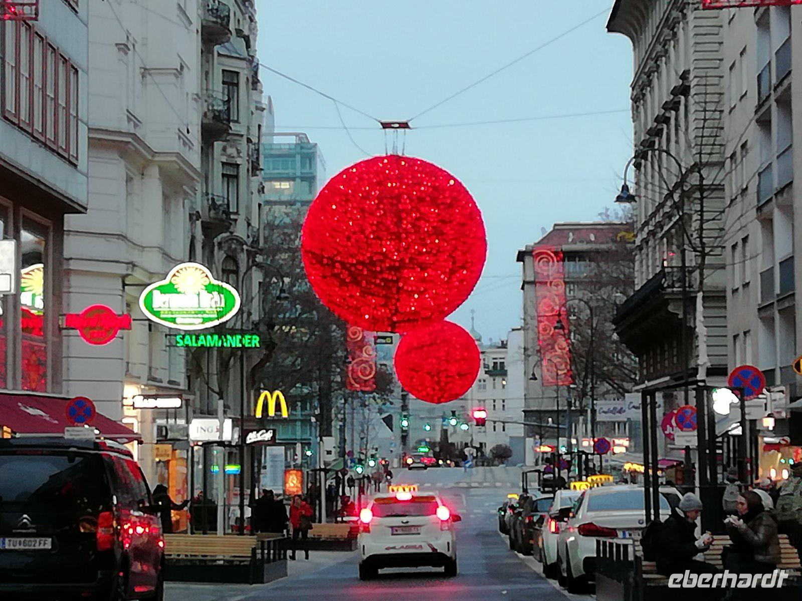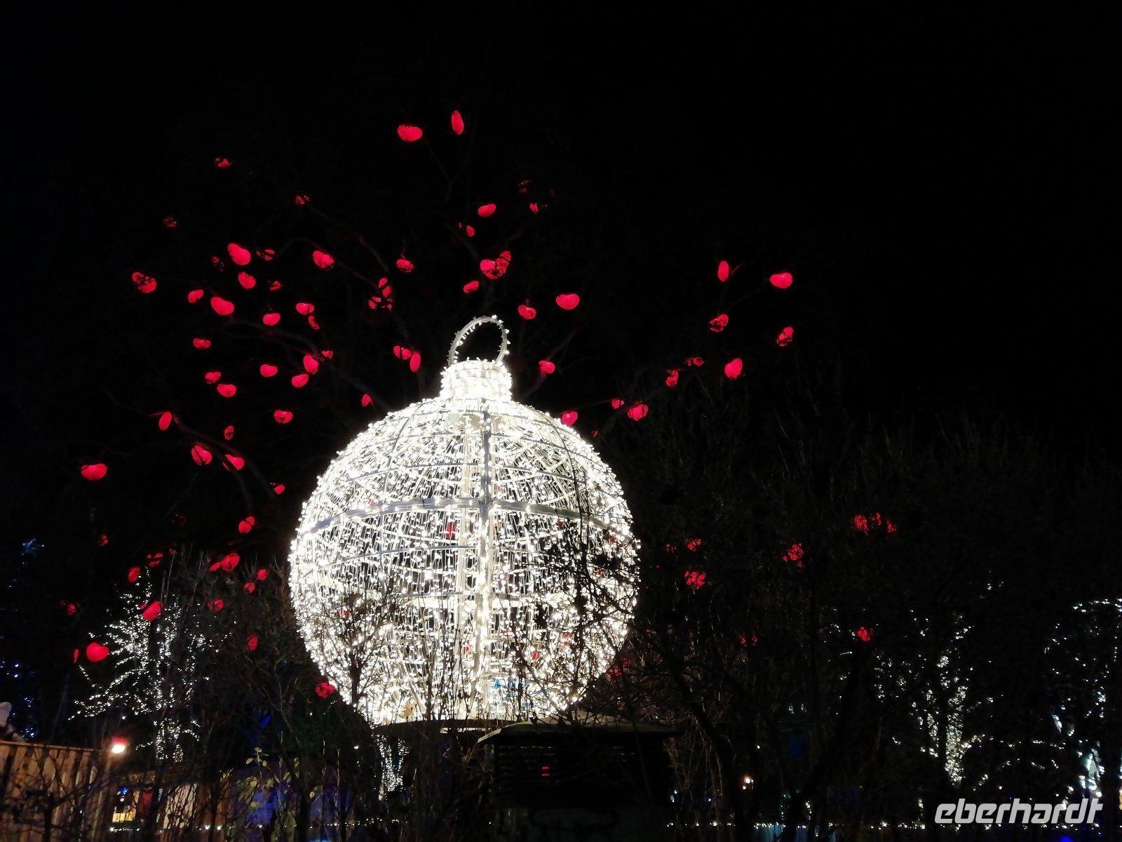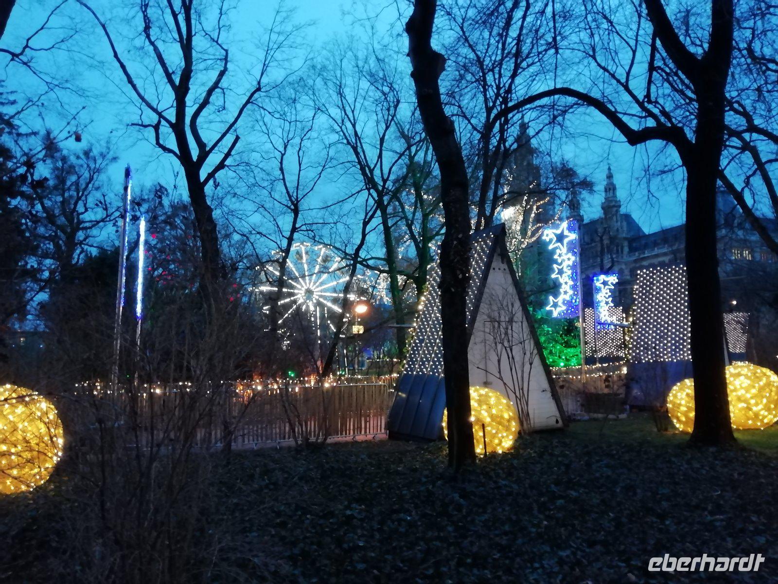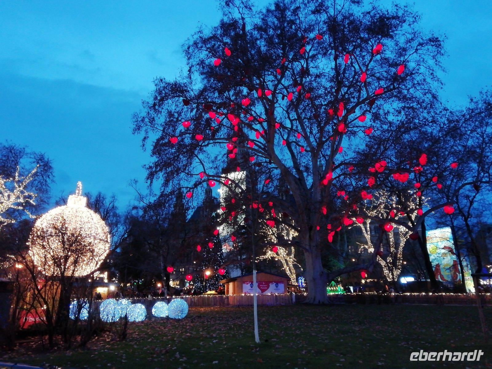 Nun erwartet uns noch der Höhepunkt des Tages: der Besuch des größten Christkindelmarktes Österreichs am Rathausplatz. An den 152 Ständen findet man ein vielfältiges Weihnachtsangebot: Spielwaren wie Puppen und Plüschtiere, Weihnachtsschmuck aus Filz, Glas, Holz, Stroh, Bienenwachs, Keramik und Zinn sowie verschiedenste Textilien. Erzeuger aus der Region präsentieren Lebkuchen, Marmeladen, Honig, Edelbrände, Liköre, Pralinen und Käse. Während wir der Livemusik lauschen wird so mancher Punsch getrunken. Besonders beeindruckt sind wir von der Beleuchtung im Rathauspark. Da hängen Herzen im Baum, liegen bunte Kugeln auf den Wiesen, erstrahlt ein Adventskranz und ein Krippenpfad lädt ein.