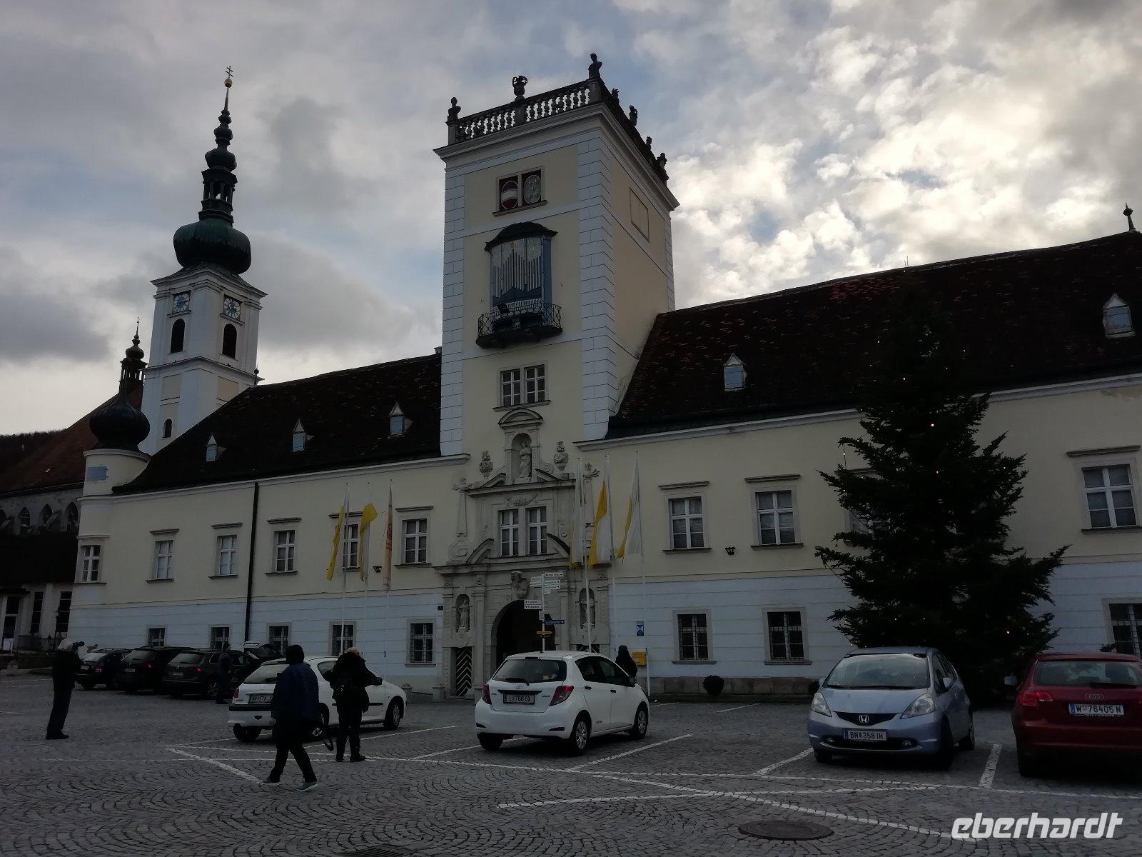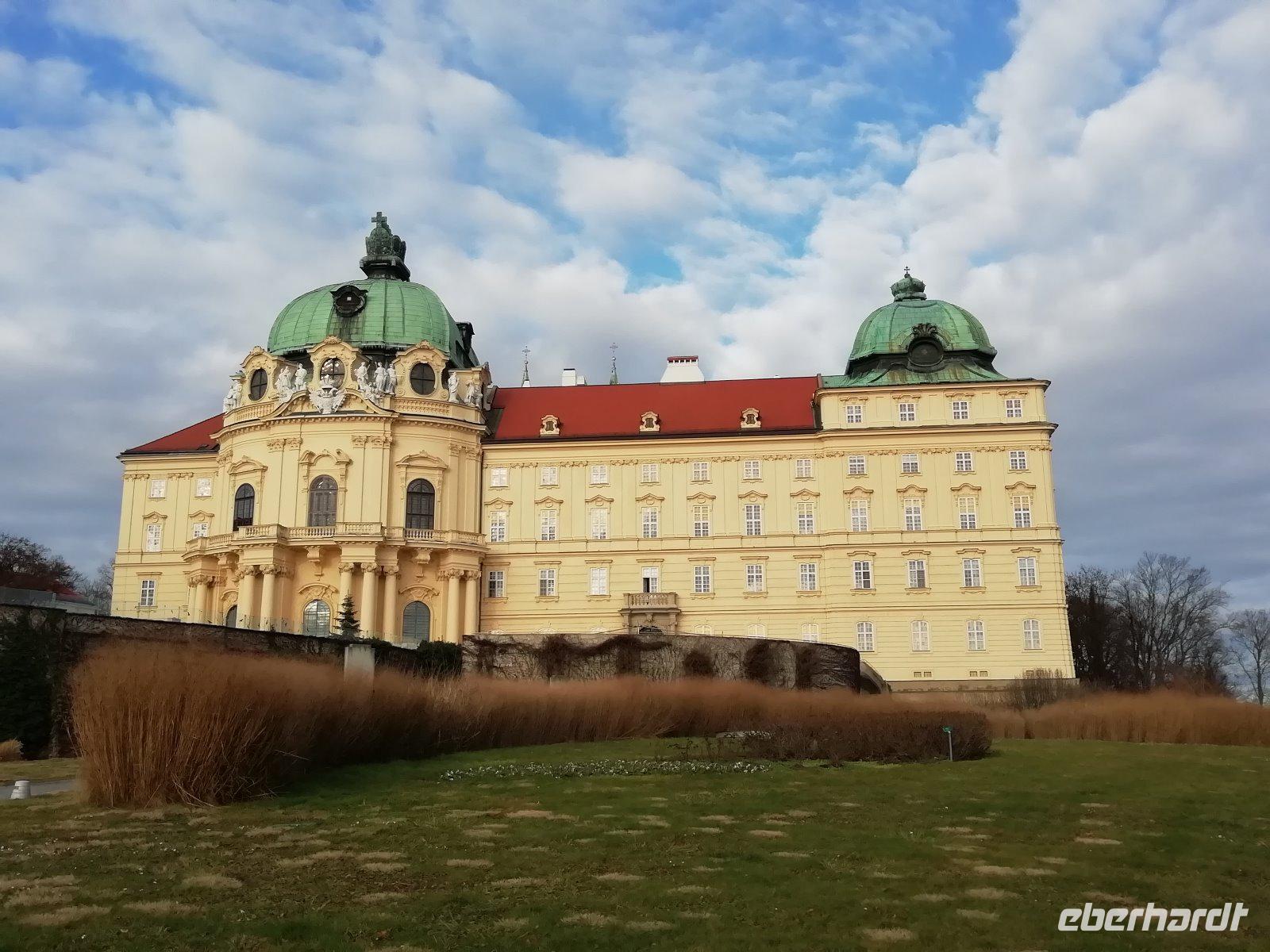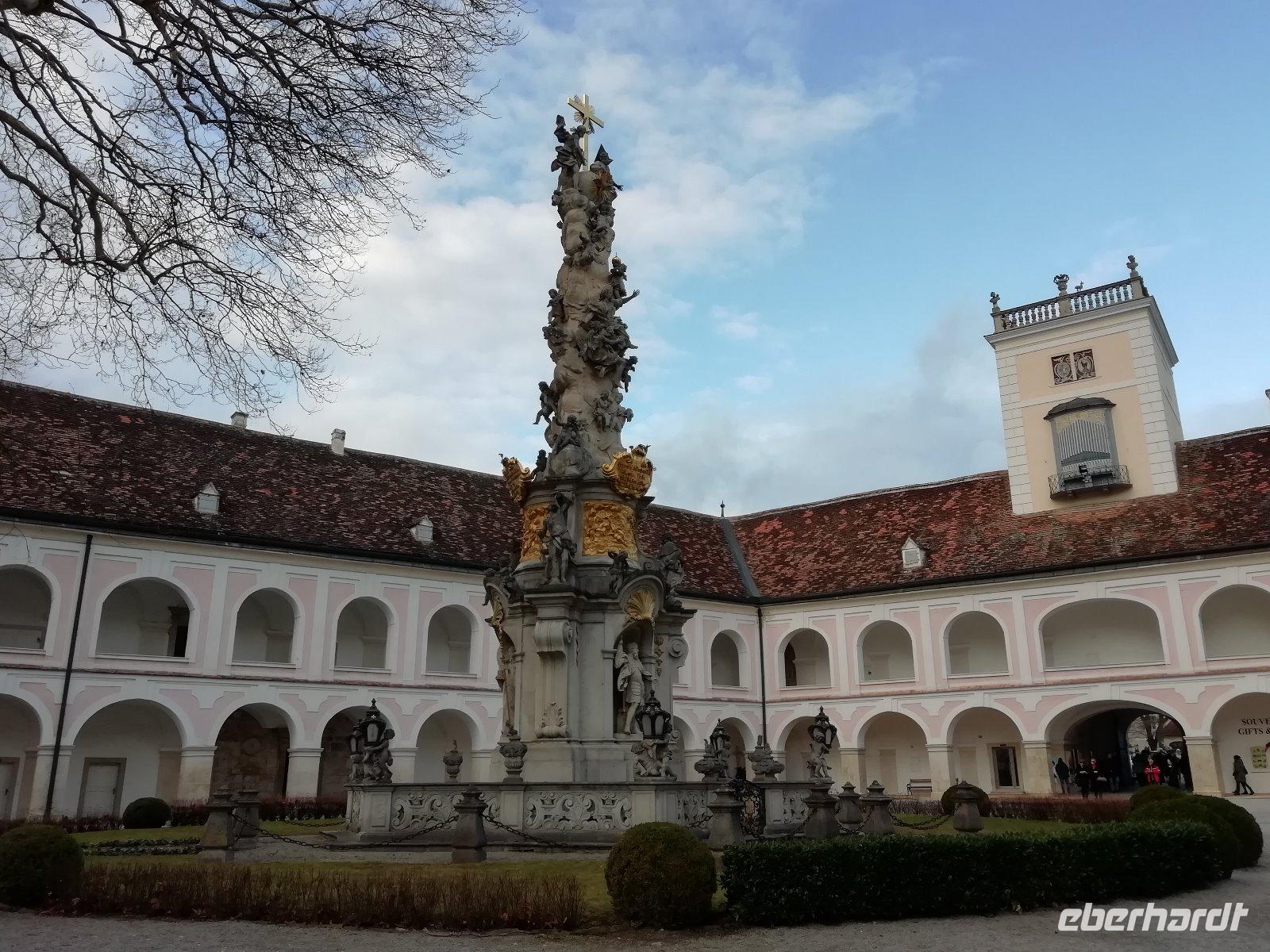 Nach einer Nacht mit heftigen Windböen, die teilweise sogar die Weihnachtsbeleuchtung am Hotel beschädigt haben, ist es am Morgen wieder ruhig. Der Wind hat zum Glück die dicken Wolken von gestern vertrieben und so fahren wir diesmal bei blauem Himmel und Sonnenschein wieder Richtung Wien. Unser erstes Ziel liegt in Klosterneuburg. Seit mehr als 900 Jahren gehört das Stift Klosterneuburg zu den bedeutendsten sakralen und kulturellen Zentren Österreichs. Für uns ist hier eine Führung bestellt. Dabei unternehmen wir einen Abstecher in die Stiftsgeschichte, besuchen die Stiftskirche und den Kreuzgang. Besondere Kostbarkeiten sind dabei u.a. den siebenarmigen Leuchter, die Keramikkrippe und der weltberühmten Verduner Altar. Es ist fast ein Wunder, dass man ihn heute noch anschauen kann, denn beinahe hätte ihn 1330 ein Brand zerstört. Doch als das Feuer damals die Stiftskirche erreichte und das Löschwasser aufgebraucht war, wickelten die Klosterneuburger den Altar in weingetränkte Tücher und retteten ihn so vor den Flammen.