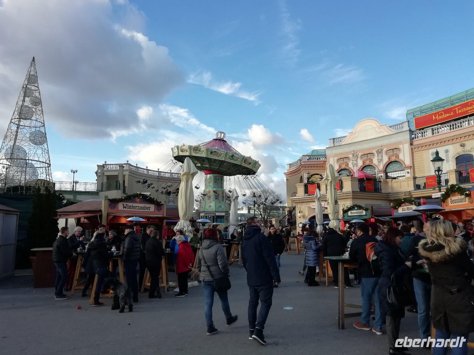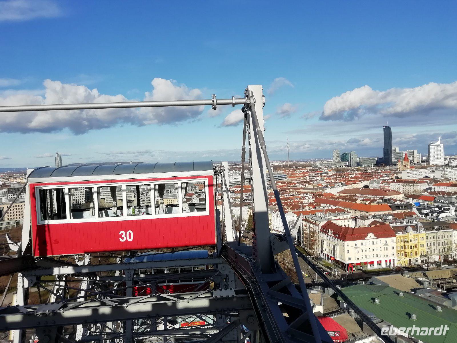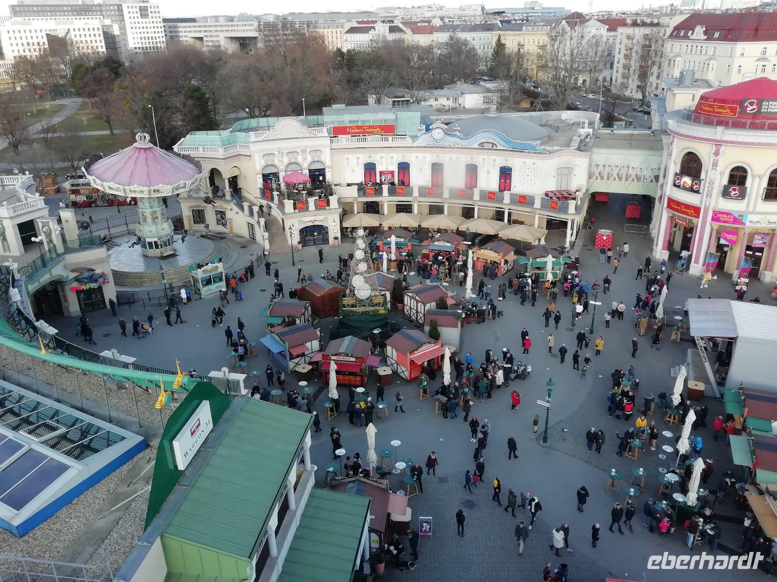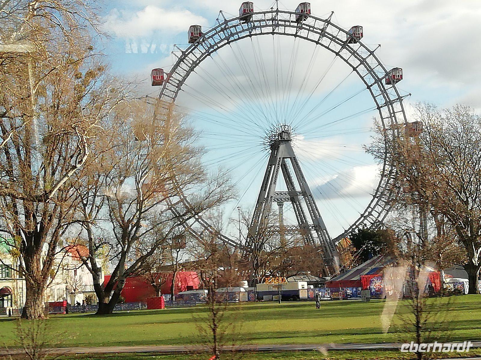 Weiter geht es entlang des Donaukanals zum ältesten Vergnügungspark der Welt, zum Wiener Prater. Hier erfüllen wir uns den Traum vieler Wienbesucher: Wir fahren mit dem historischen Riesenrad. Seit der Eröffnung 1897 ist es mit seiner Silhouette das Wahrzeichen der Stadt und das Symbol des Wiener Praters. Die Gondel bringt uns mit einer Geschwindigkeit von 0,75m/s auf eine Höhe von 64 Metern. Bei dem herrlichen Sonnenschein heute hat man eine ganz besonders schöne Sicht. Natürlich werden viele Fotos gemacht. Danach besuchen wir noch den Wintermarkt, der in diesem Jahr bereits zum 10. Mal auf dem Riesenradplatz stattfindet. Dem umfangreichen Punschangebot können die meisten Gäste nicht widerstehen.