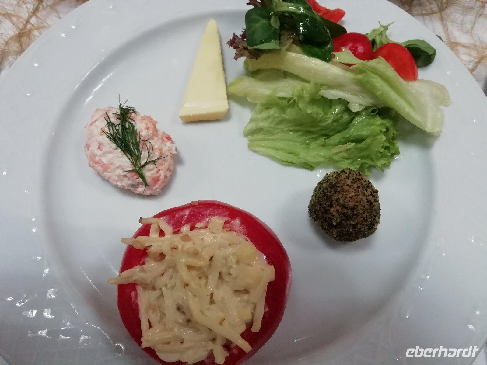 Inzwischen wurde für uns im Hotel die Weihnachtstafel geschmückt und ein festliches 4-Gang-Menü vorbereitet. Bei Kerzenschein genießen wir einen Vorspeisenteller mit gefüllter Tomate, Kalbsleberpralinen im Kürbismantel und Lachsnockerln, danach Rindssuppe Royal und anschließend Filet vom Schneeberglandschwein mit Eierschwammerln, Herzoginnenkartoffeln und Fisolen-Bündel. Zum Abschluss gibt es noch Bratapfeltiramisu, Zimteis und Lebkuchenmousse. Mit Gedichten, Erzählungen und Naturfilmen gestaltet Familie Hornung für uns einen besinnlichen Heiligabend. Wie es in Österreich Tradition ist, singen wir gemeinsam das Lied "Stille Nacht". Danach kommen das Christkind und der Eberhardt-Weihnachtsmann. Sie haben das passende Geschenk für den bunten Teller, mit dem Familie Hornung uns schöne Weihnachten wünscht.