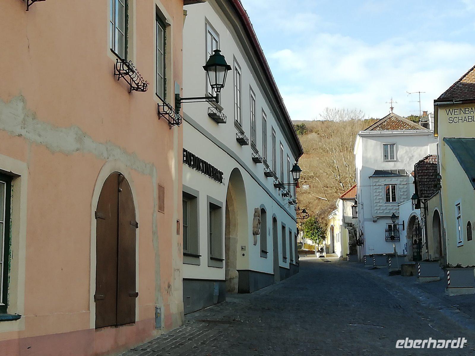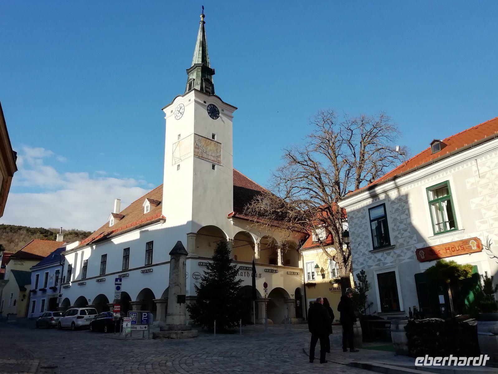 Danach fahren wir durch die „Thermenregion", so die Bezeichnung für das Weinanbaugebiet im Wiener Wald. Dabei haben wir teilweise einen tollen Blick bis Wien und über das Wiener Becken. Unser Ziel ist Gumpoldskirchen. Der Ort ist durch den Weinanbau bekannt geworden und so wollen wir hier bei einem Heurigen zum Mittagessen einkehren. Wir probieren den Wein und auch die Spezialitäten des Hauses. Leo unterhält uns derweil musikalisch mit Gesang und Akkordeonklängen. Einige Gäste nutzen die Zeit auch noch für einen Bummel durch den idyllischen Ort oder die Weinhänge.