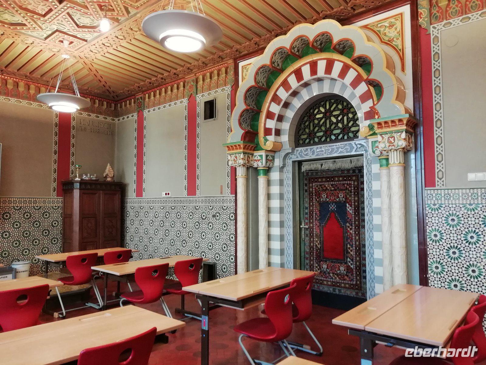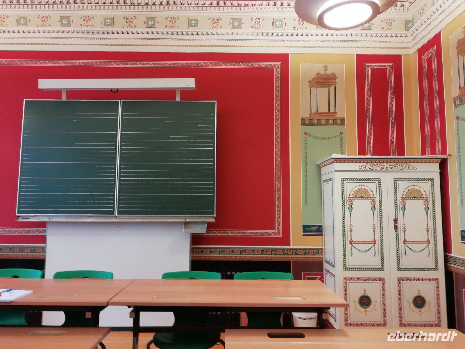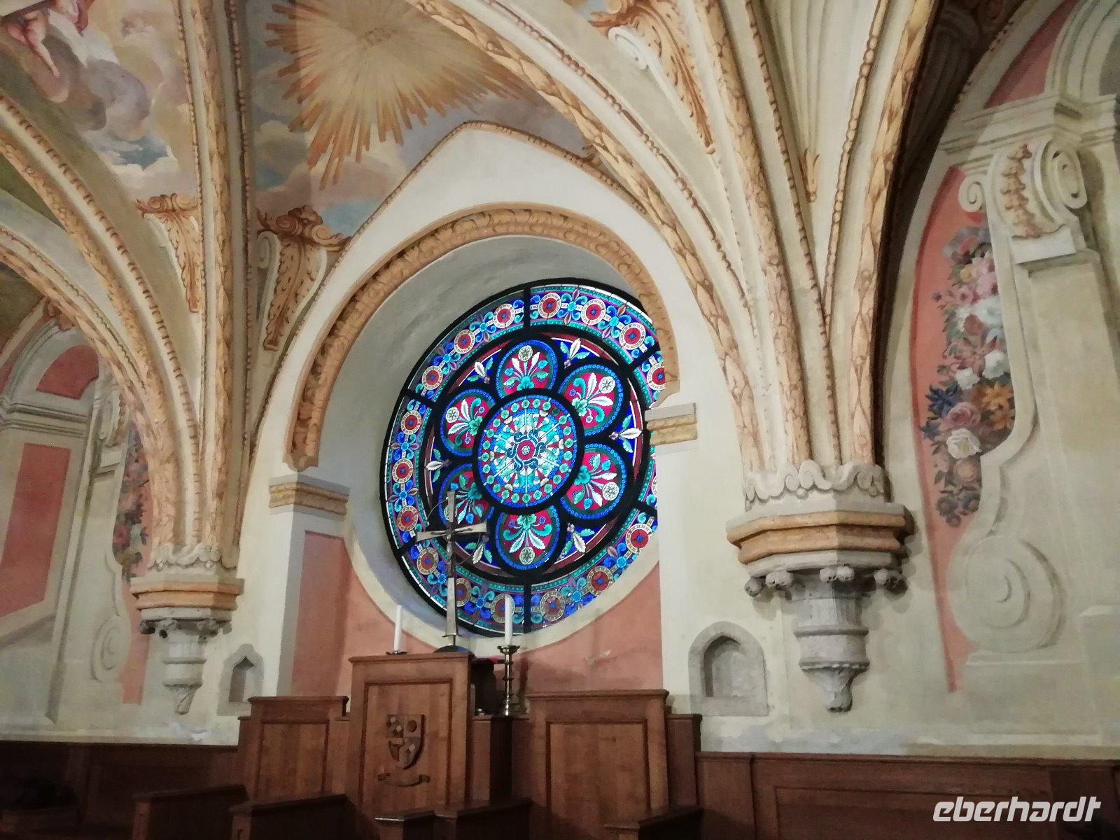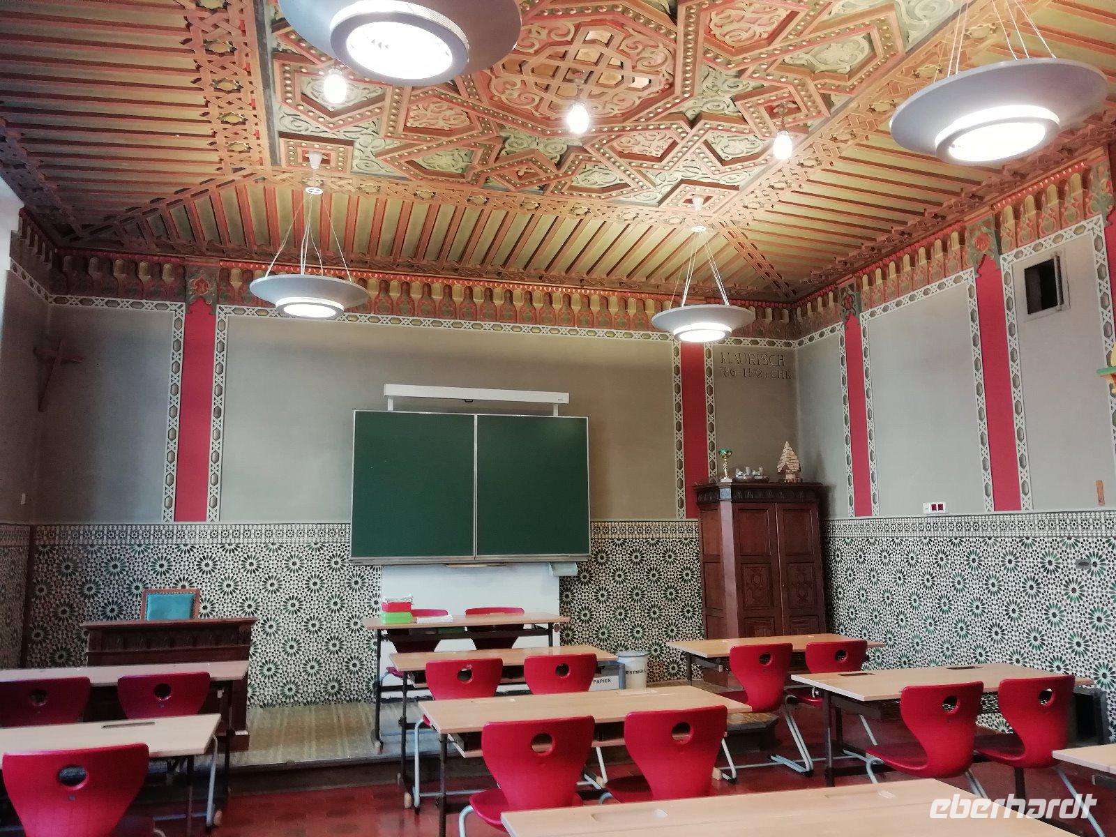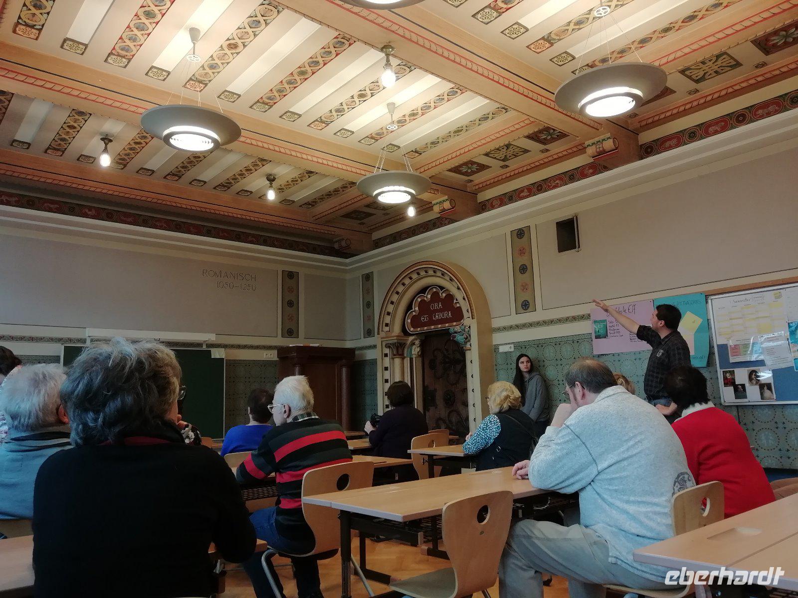 Zum Feiertag in die Schule? „Ja" sagen die Eberhardt-Reisegäste, denn es handelt sich um eine weltweit einzigartige Schule, die sogar im Guinnessbuch der Rekorde steht. Über den "Hals", einen Pass von 662 m Höhe, geht es deshalb wieder vom Piestingtal ins Triestingtal. Die Krupp-Stadt Berndorf ist unser Ziel. Hier befinden sich die „Stilklassen" - eine Volks- und eine Mittelschule. In jeder der beiden 1909 gebauten Schulen gibt es 11 Lehrzimmer, die bestimmten Baustilen nachempfunden sind. Wir besuchen die ehemalige Mädchenschule. Ein interessanter Rundgang führt uns u.a. nach Ägypten, Byzanz und ins Empire. Wir machen auch einen Abstecher nach Pompej und in die Zeit des Wiener Barock. In jedem Zimmer gibt es interessante Details zu entdecken, sei es an den Türen oder an den Decken. Herr Braun weiß außerdem so manches zu erzählen über die Stadt Berndorf und die Familie Krupp.
