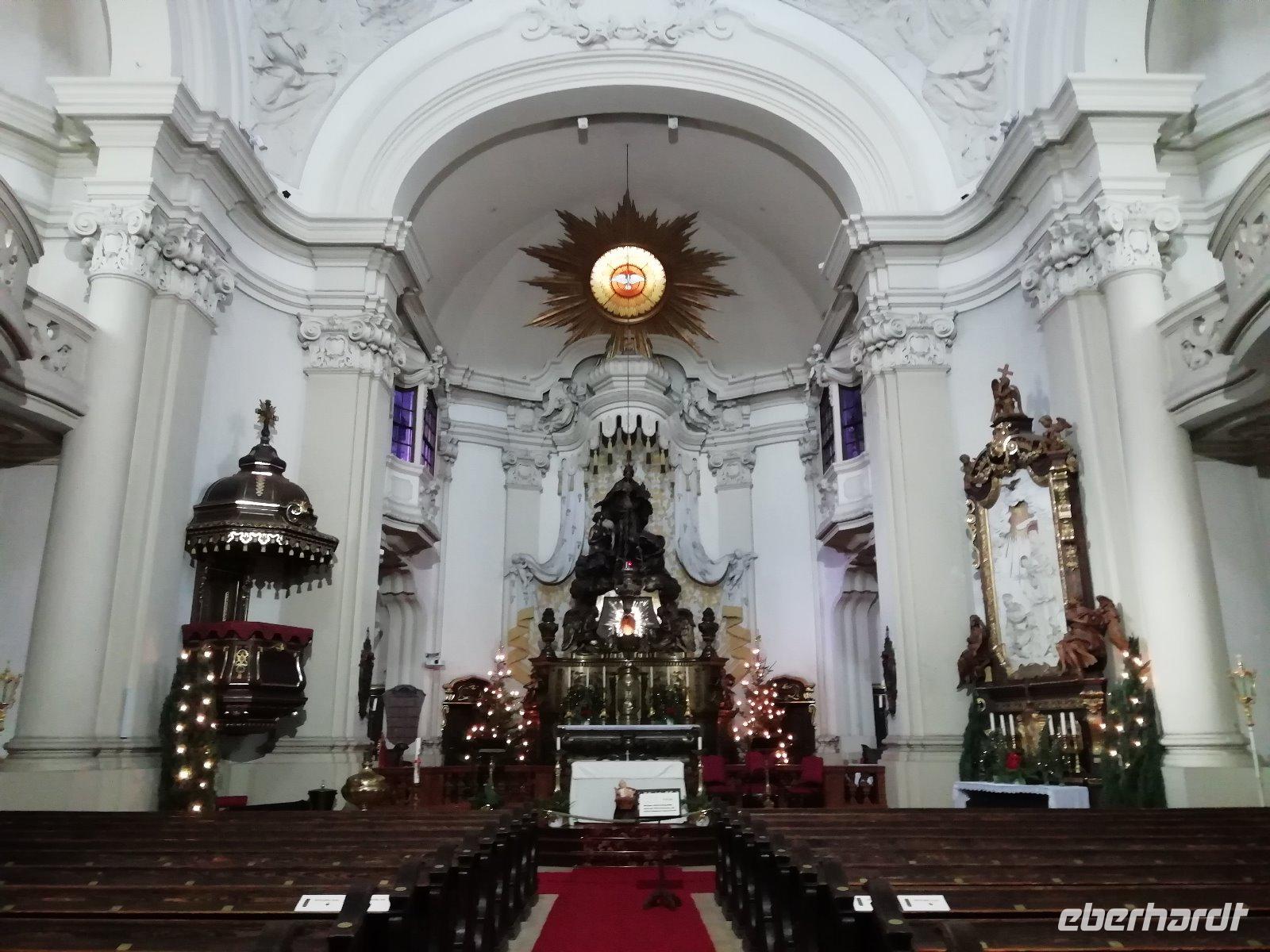 Zwischen den beiden Schulen steht die imposante Margaretenkirche mit der runden Kuppel. Als Vorbild für ihren Bau diente die Peterskirche in Wien. Den Innenraum beherrscht ein 20 Tonnen schwerer Hochaltar aus Bronze. Das schauen wir uns natürlich auch noch an.