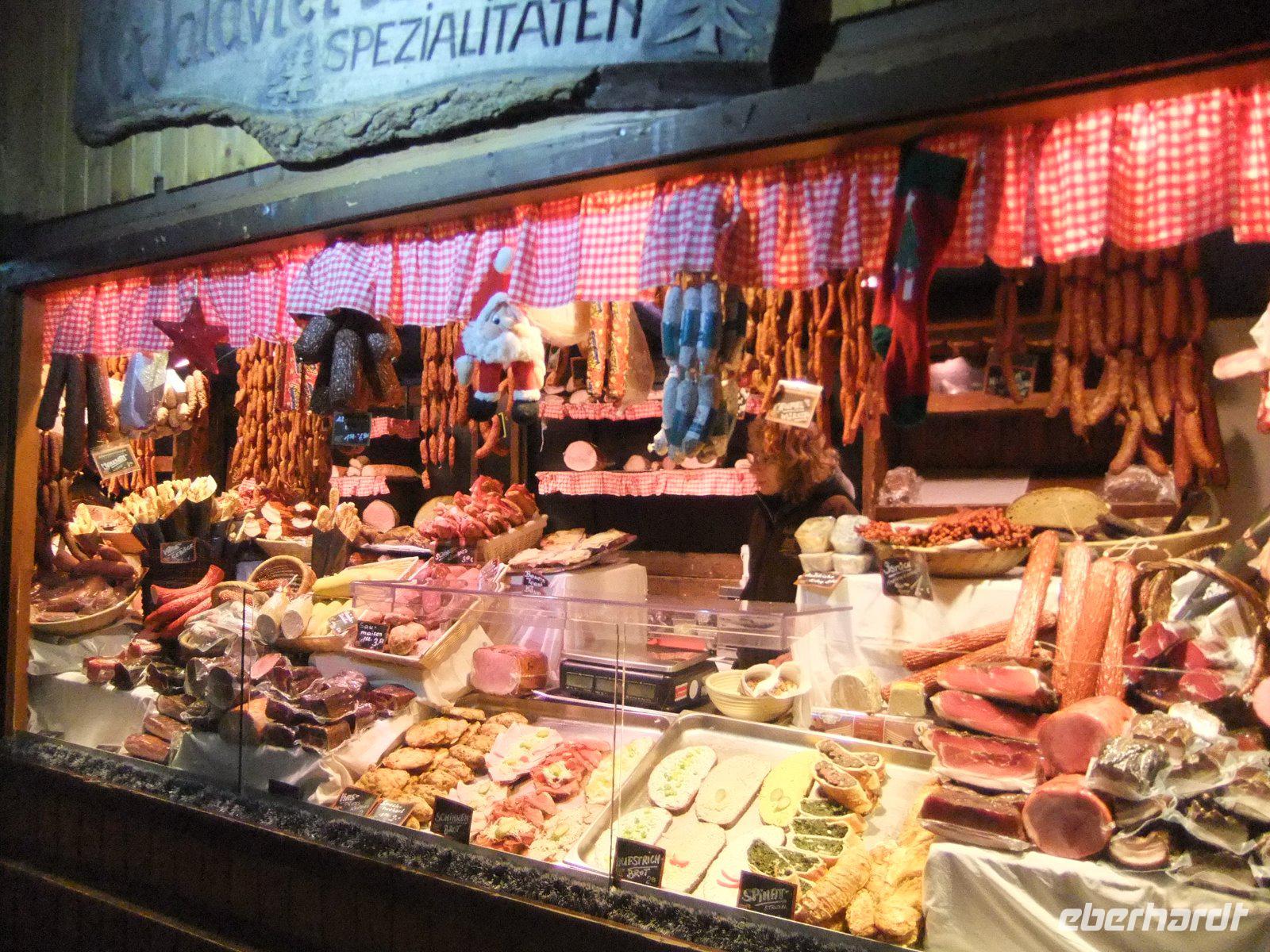 Nun bringt uns Tilo mit dem Bus aus der Wiener Innenstadt in südwestlicher Richtung zur eindrucksvollen Barockanlage von Schloss Schönbrunn. Vor dem Schloss lädt der Kultur- und Weihnachtsmarkt zum Bummeln, Schauen und Kaufen ein. An den zahlreichen Ständen finden wir unterschiedlichste Handwerkskunst - von Spielzeug über Kerzen und Kugeln bis hin zu Keramik, aber auch so manches Schmankerl.