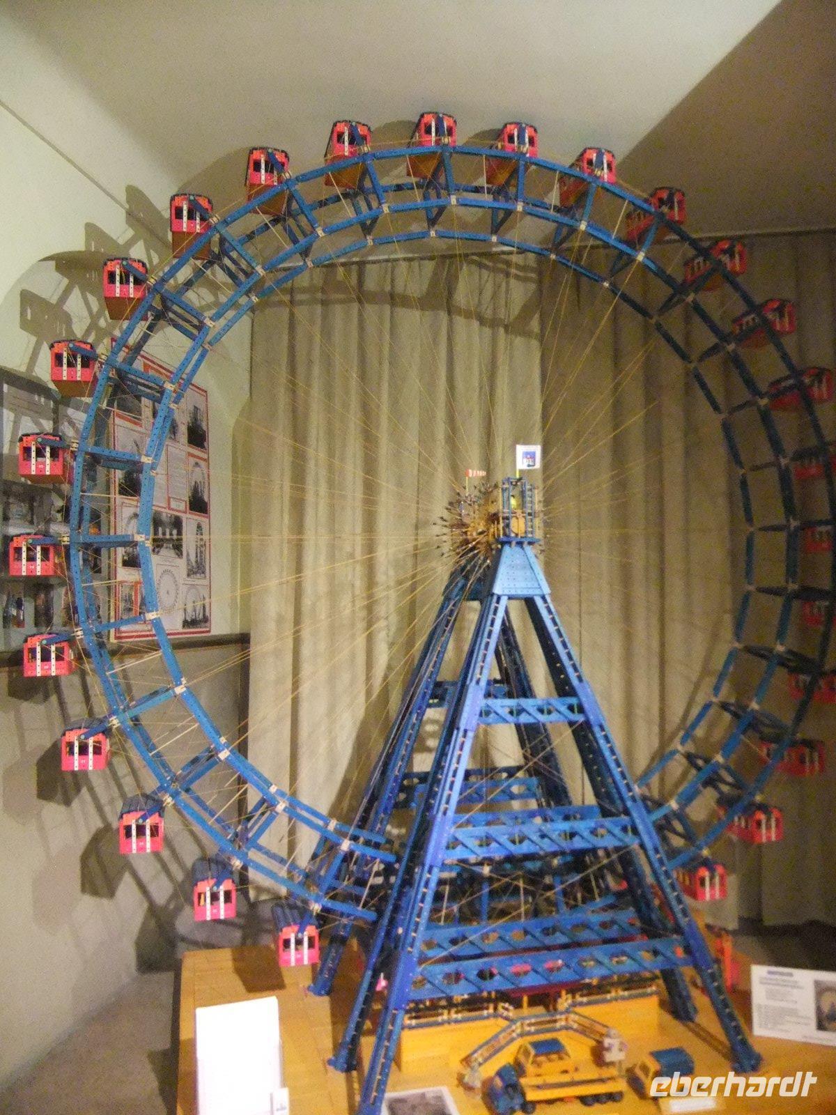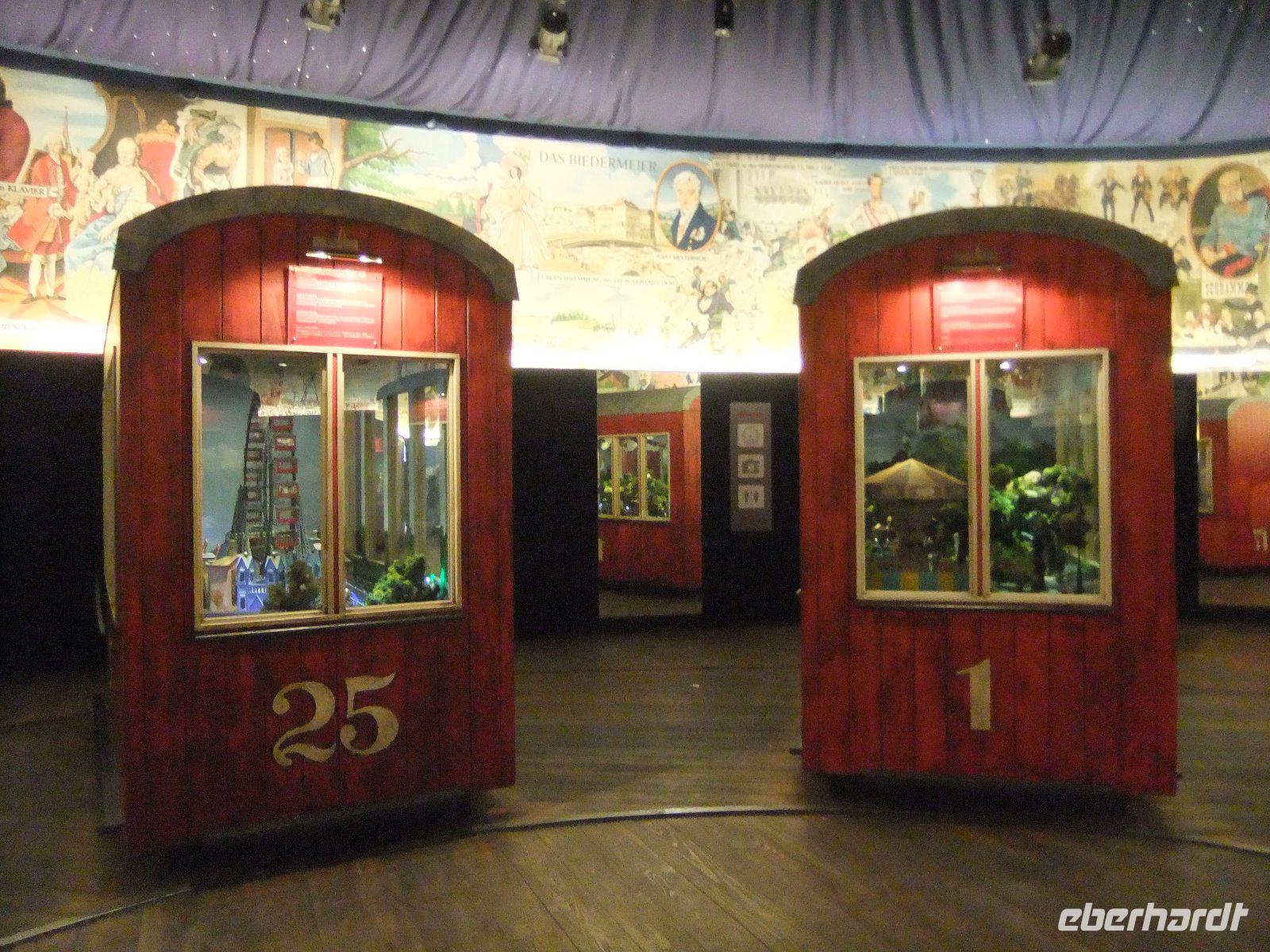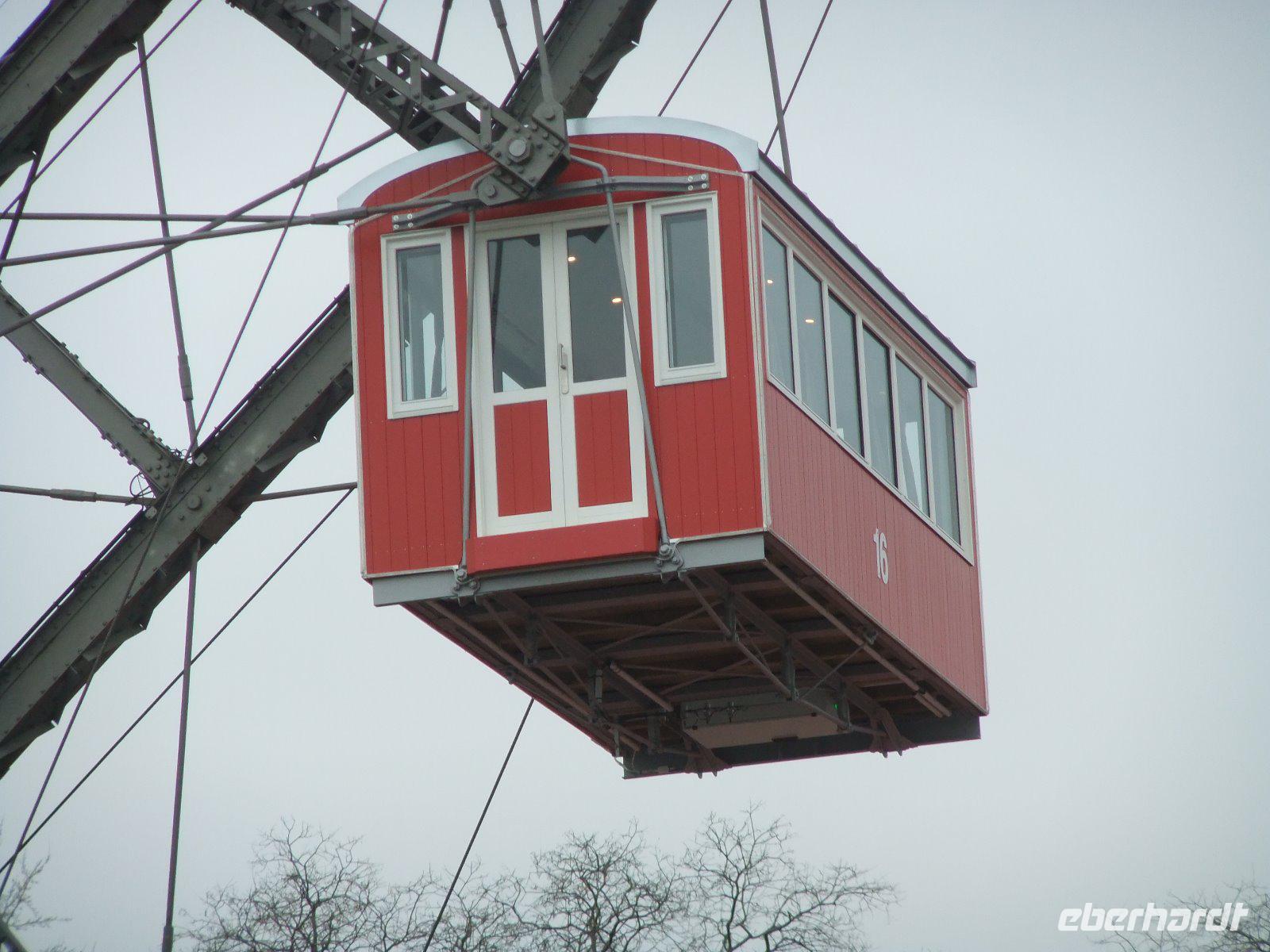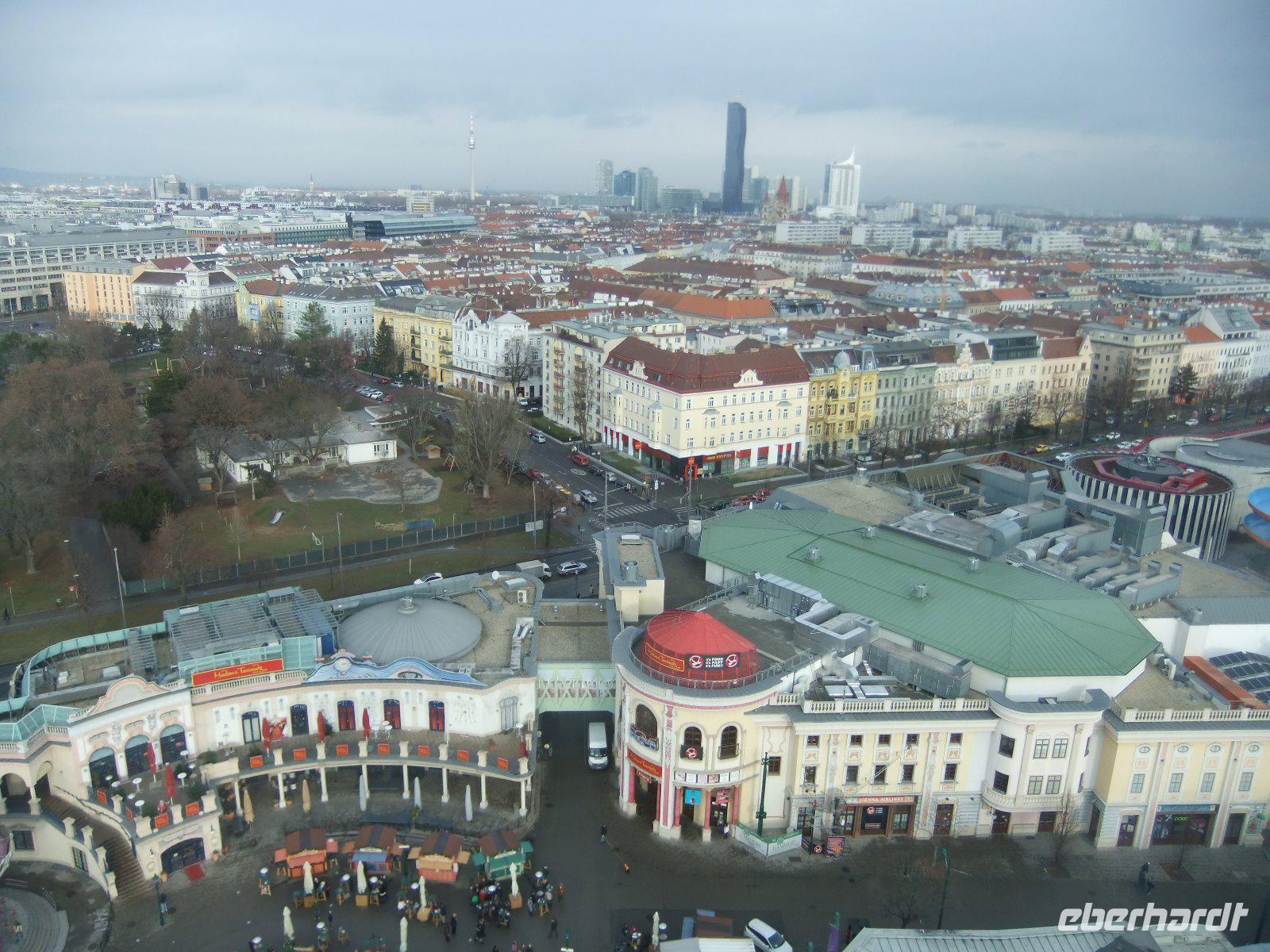 Unser nächstes Ziel ist der Wiener Prater. Auf uns wartet hier ein ganz besonderes Erlebnis: eine Fahrt mit dem historischen Riesenrad. Seit der Eröffnung 1897 ist es mit seiner Silhouette ein Wahrzeichen der Stadt und das Symbol des Wiener Praters. Im Eingangsbereich können wir einige nach dem Brand von 1944 nicht wieder aufgehängten Waggons anschauen. Voller Erwartung besteigen wir dann eine der 15 Gondeln und es geht mit 2,7 km/h langsam nach oben. Fast 65 Meter über Wien genießen wir die tolle Aussicht auf die Stadt. Wir haben wirklich Glück: Bis jetzt hatte sich alles in Nebel gehüllt, aber während unserer Riesenradfahrt scheint sogar die Sonne. Nun bleibt noch Zeit für einen Bummel über den Wintermarkt, der sich im Prater mit heißen Getränken und österreichischen Speisen präsentiert.