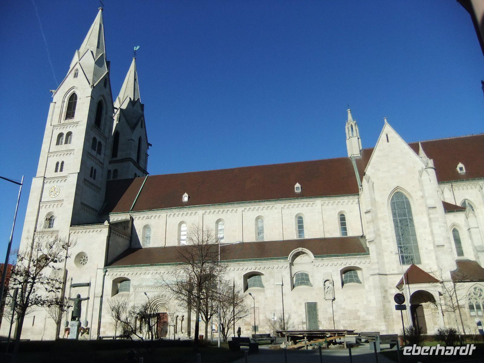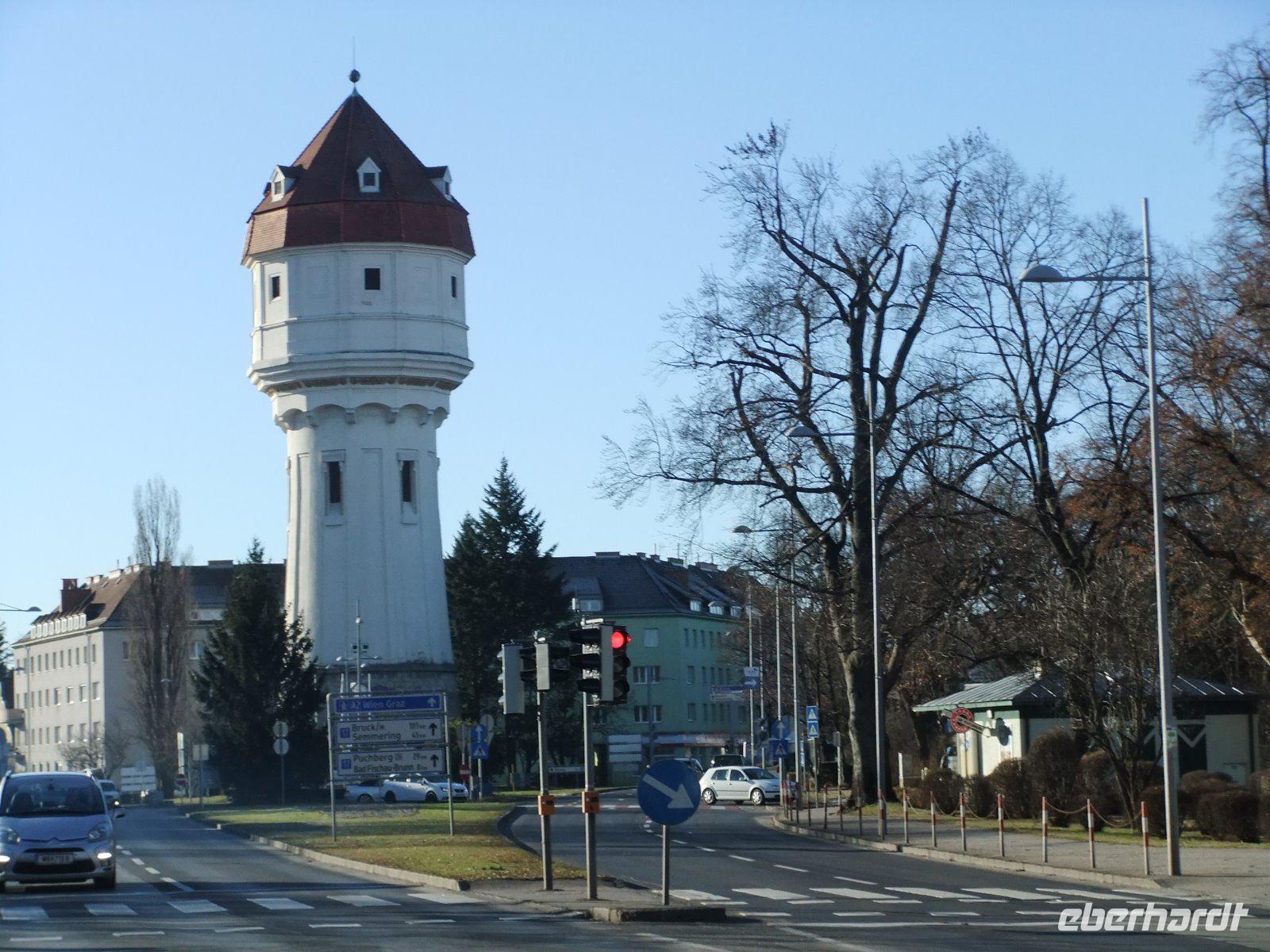 Ein Traumwetter erwartet uns heute. Gutgelaunt fahren wir nach Wiener Neustadt. Schon von weitem können wir ein Wahrzeichen des Ortes, den Wasserturm, sehen. Die Architekten gaben ihm die Form eines stilisierten Deckelpokals. Wir verlassen hier den Bus und gehen mit Josef vorbei an der Militärakademie zum Hauptplatz mit dem Rathaus im Renaissancestil und weiter bis zum Dom. Mittags essen wir im Bus Schnitzelbrötchen, denn heute hat uns das „Börsenhof"-Team Lunchpakete mitgegeben.