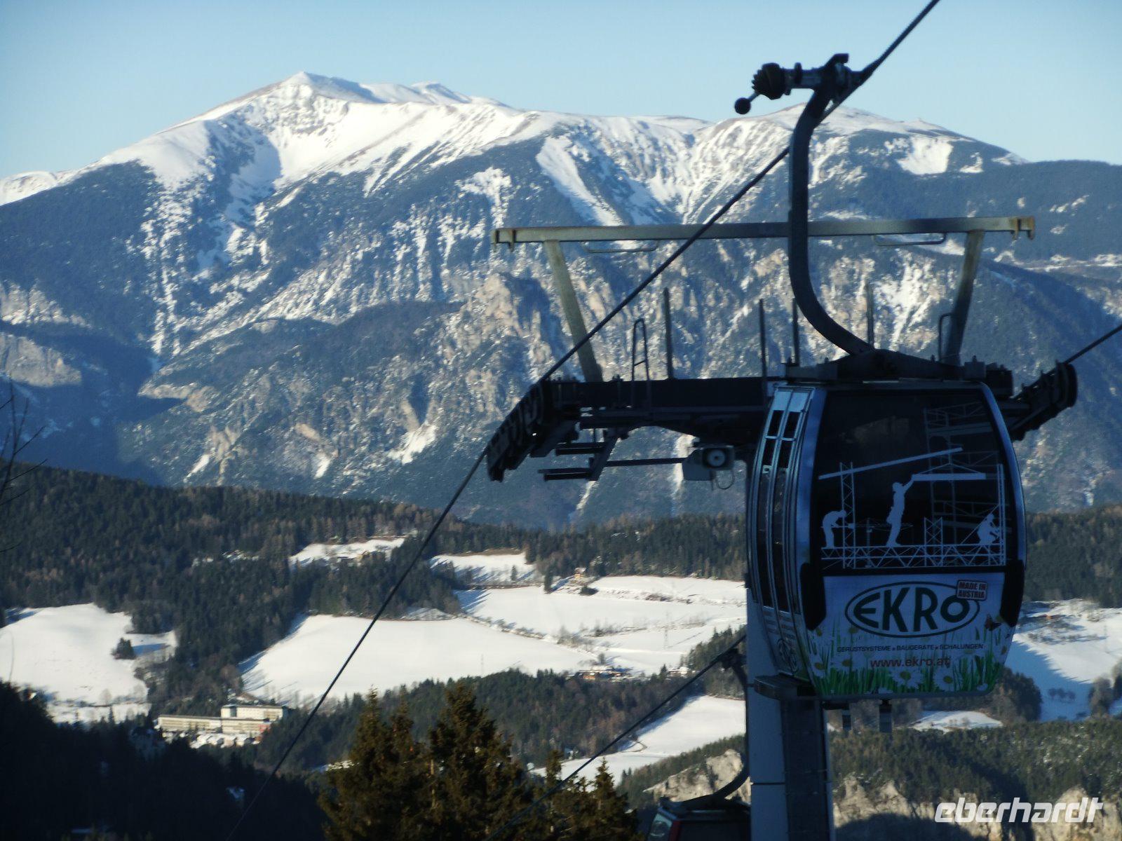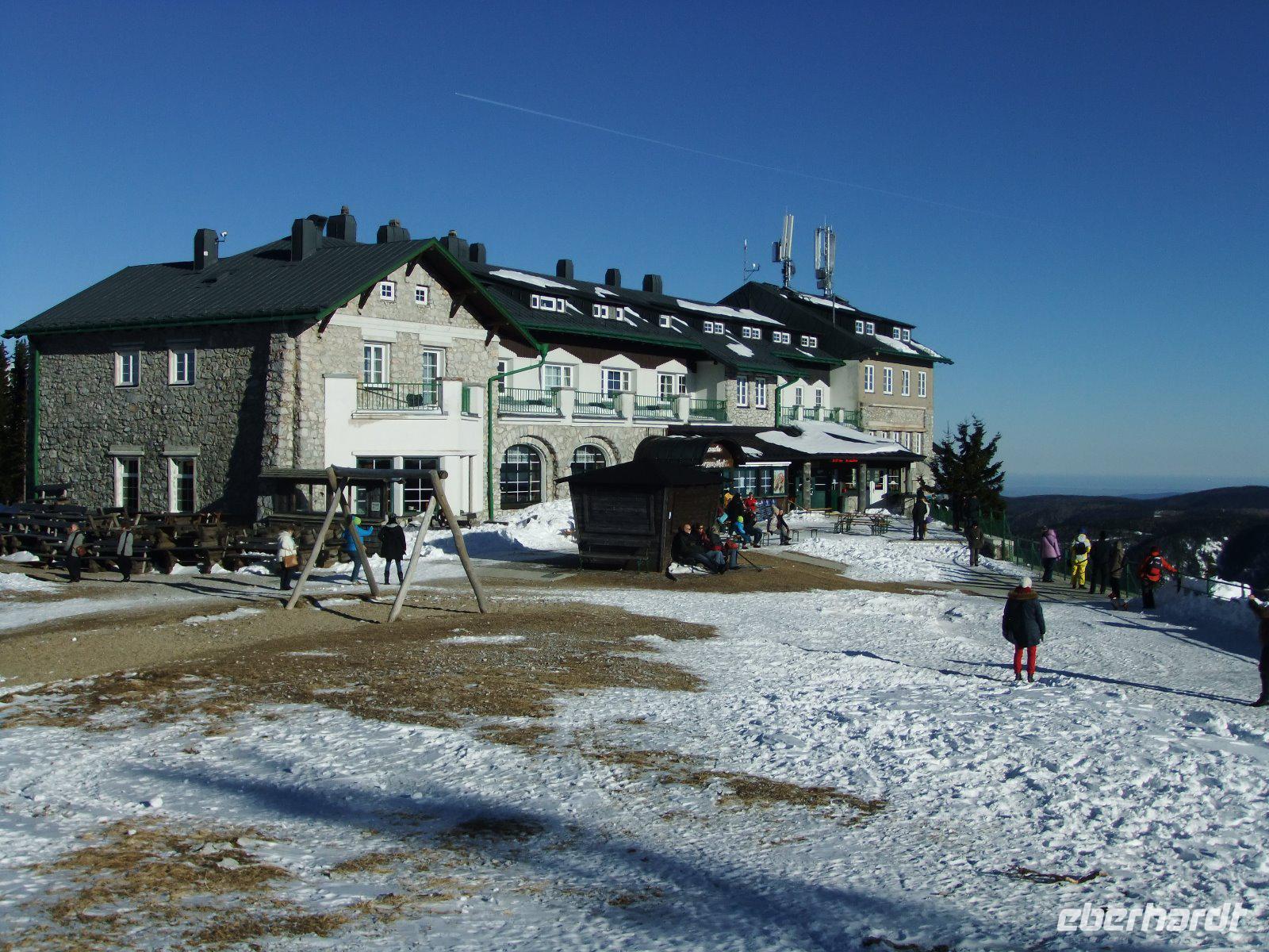 Danach ist der Hirschenkogel, auch Zauberberg genannt, unser Ziel. Hier wimmelt es von Skifahrern und Snowboardern. Mit der Seilbahn geht es eigentlich recht schnell nach oben, doch als alle Gäste in den Gondeln sind, bleibt die Bahn stehen. Bis der Fehler behoben ist, schweben wir mehr als 20 Minuten über dem Berghang. Letztendlich kommen wir doch noch gut oben an und viele klettern auf den Aussichtsturm. Hier bietet sich ein herrlicher Blick auf Raxalp, Schneeberg und die Wiener Alpen. Zurück im Bus wird erst einmal auf den „Seilbahnschreck" ein Schnäpschen getrunken.