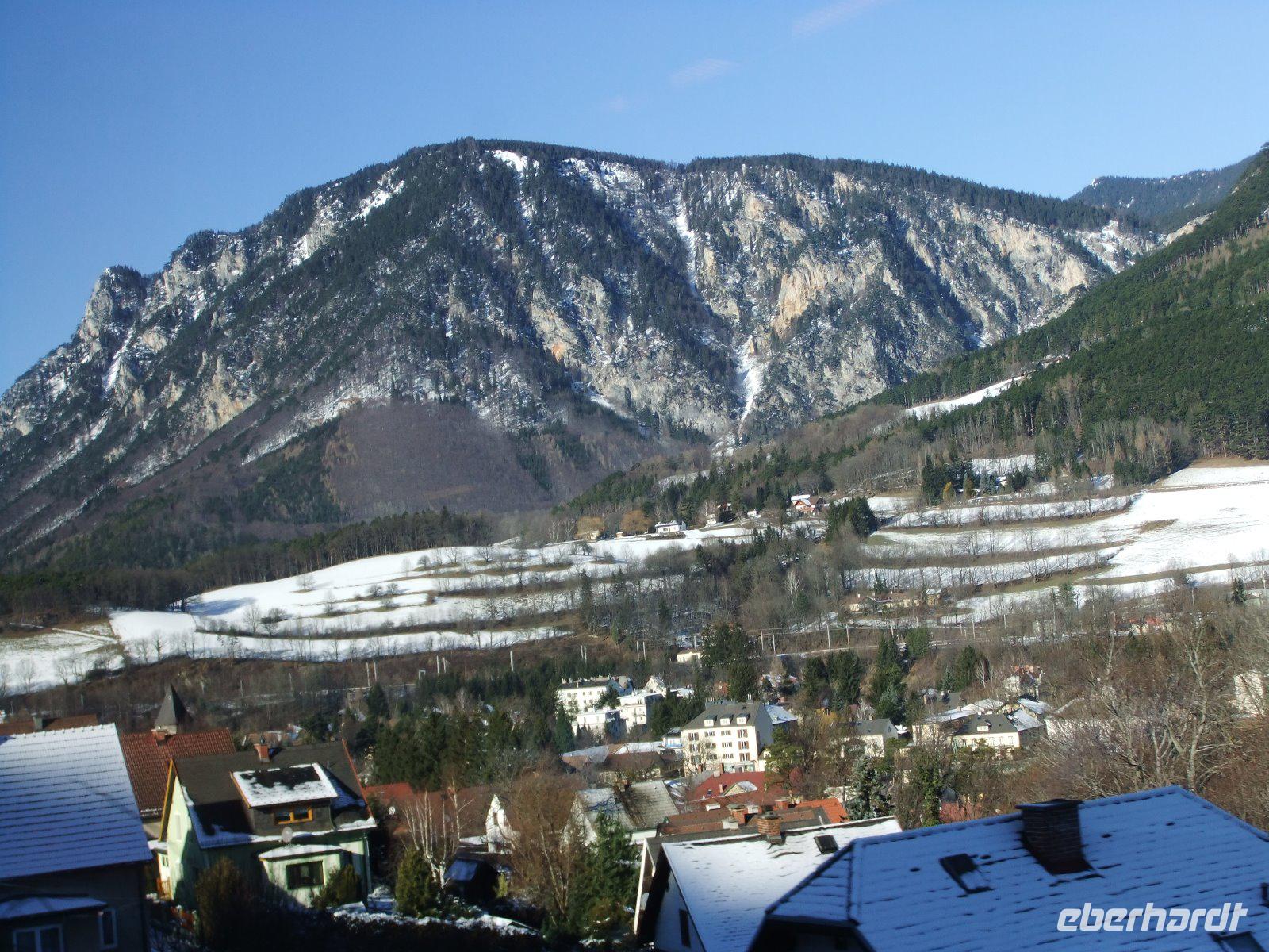 Heute können wir länger schlafen, es gibt ein Spätaufsteherfrühstück. Unser erster Ausflug im neuen Jahr bringt uns durch eine sonnige Winterlandschaft nach Payerbach-Reichenau. Ab hier wollen wir mit dem Zug fahren. Die Semmeringbahn ist ein Teilstück der Südbahn in Österreich und verläuft von Gloggnitz über den Semmering nach Mürzzuschlag. Sie war die erste normalspurige Gebirgsbahn Europas und wurde 1854 eröffnet. Wir genießen die Fahrt auf historischer Strecke in modernen Wagen, fahren über zahlreiche Seitentäler, entlang steiler Berghänge, durch mehrere Tunnel und über hohe Brücken.