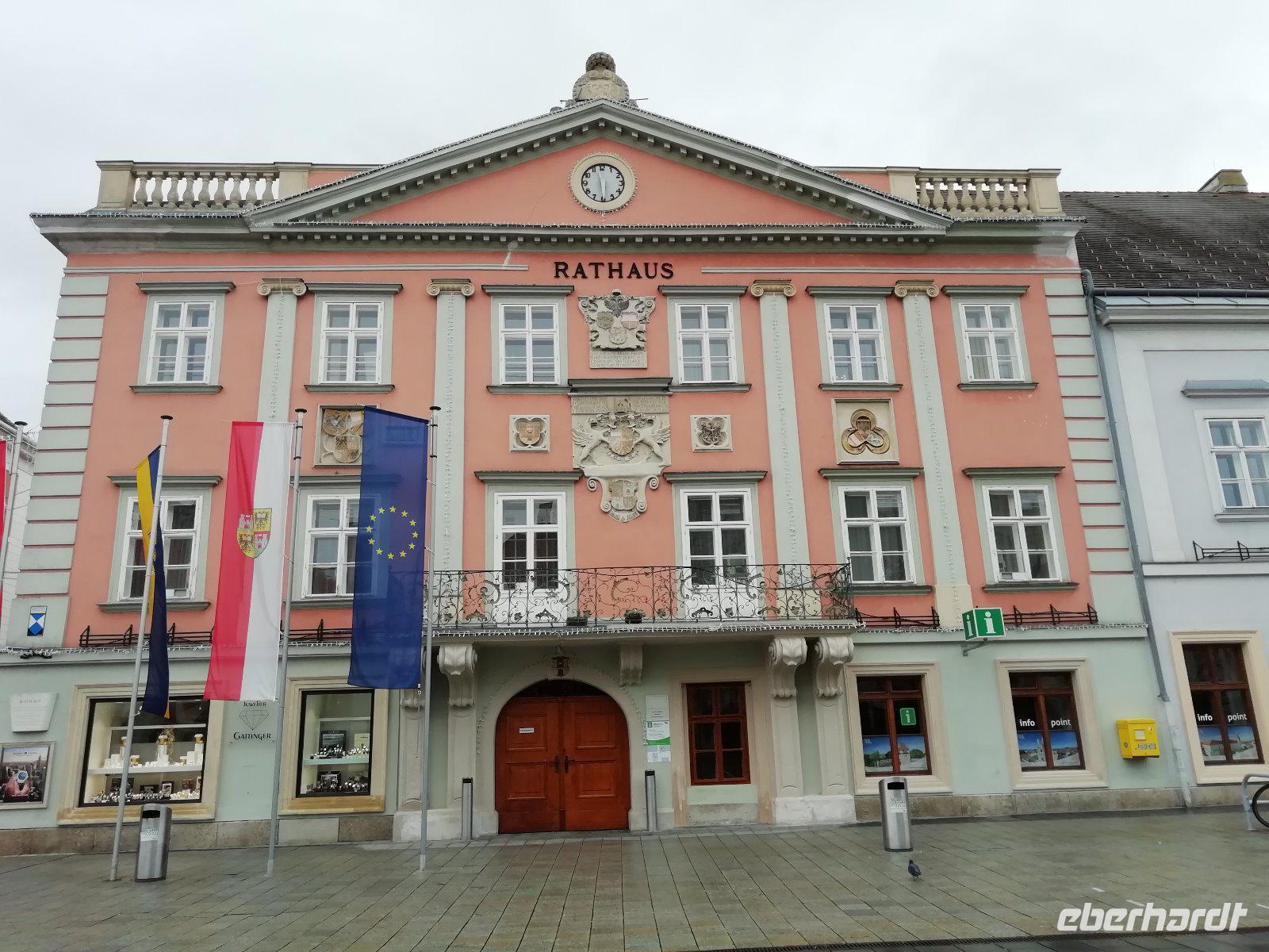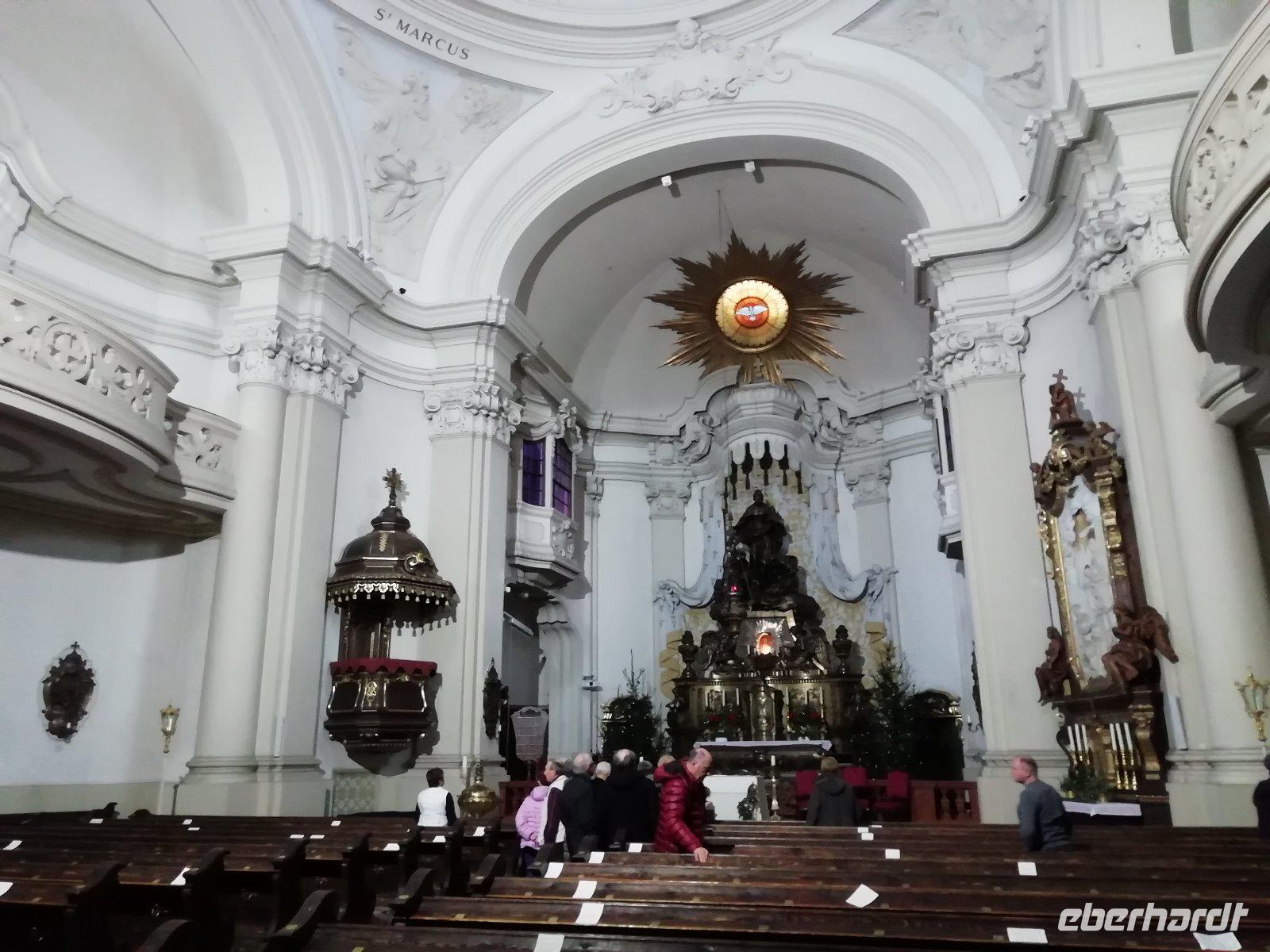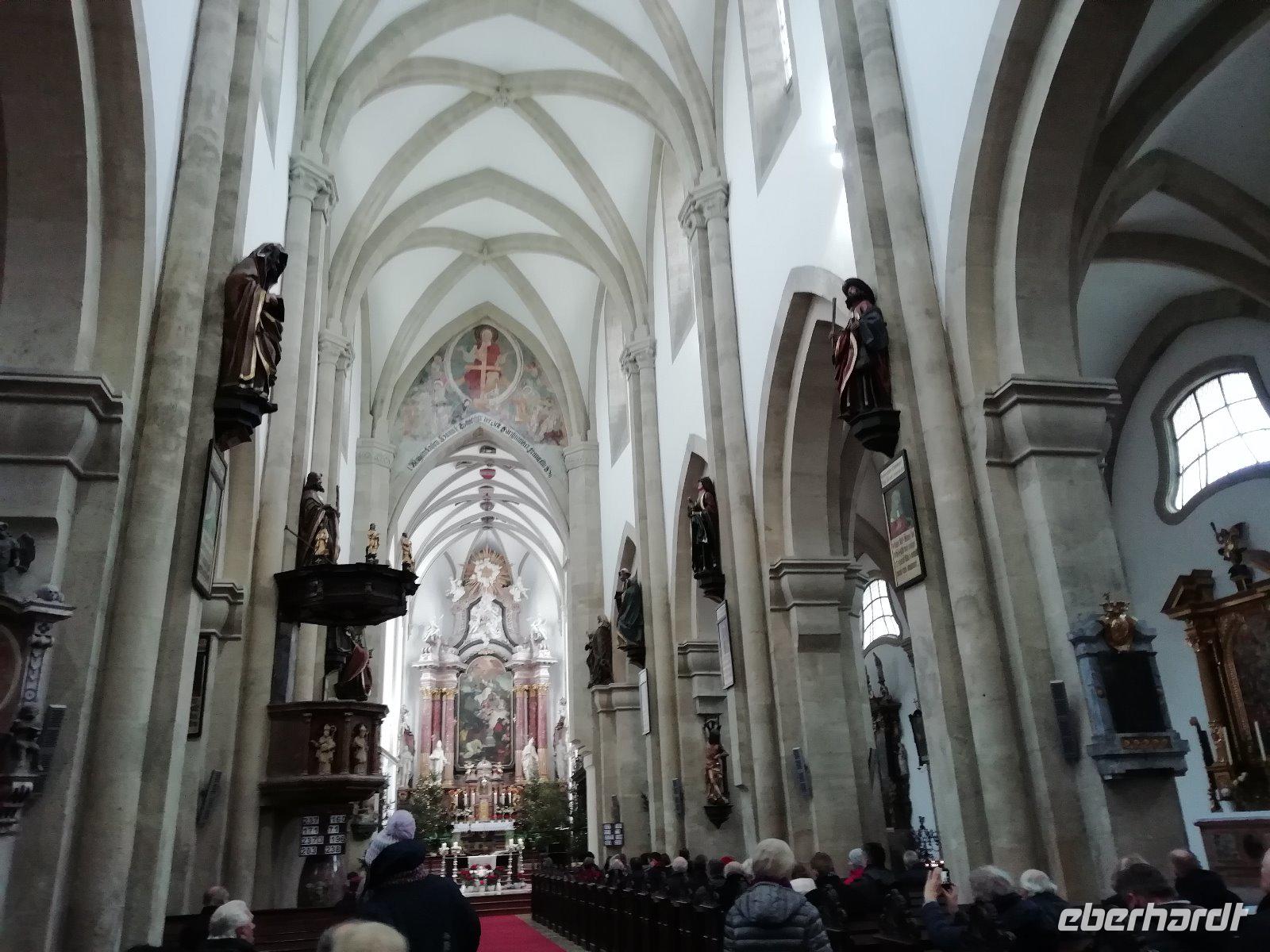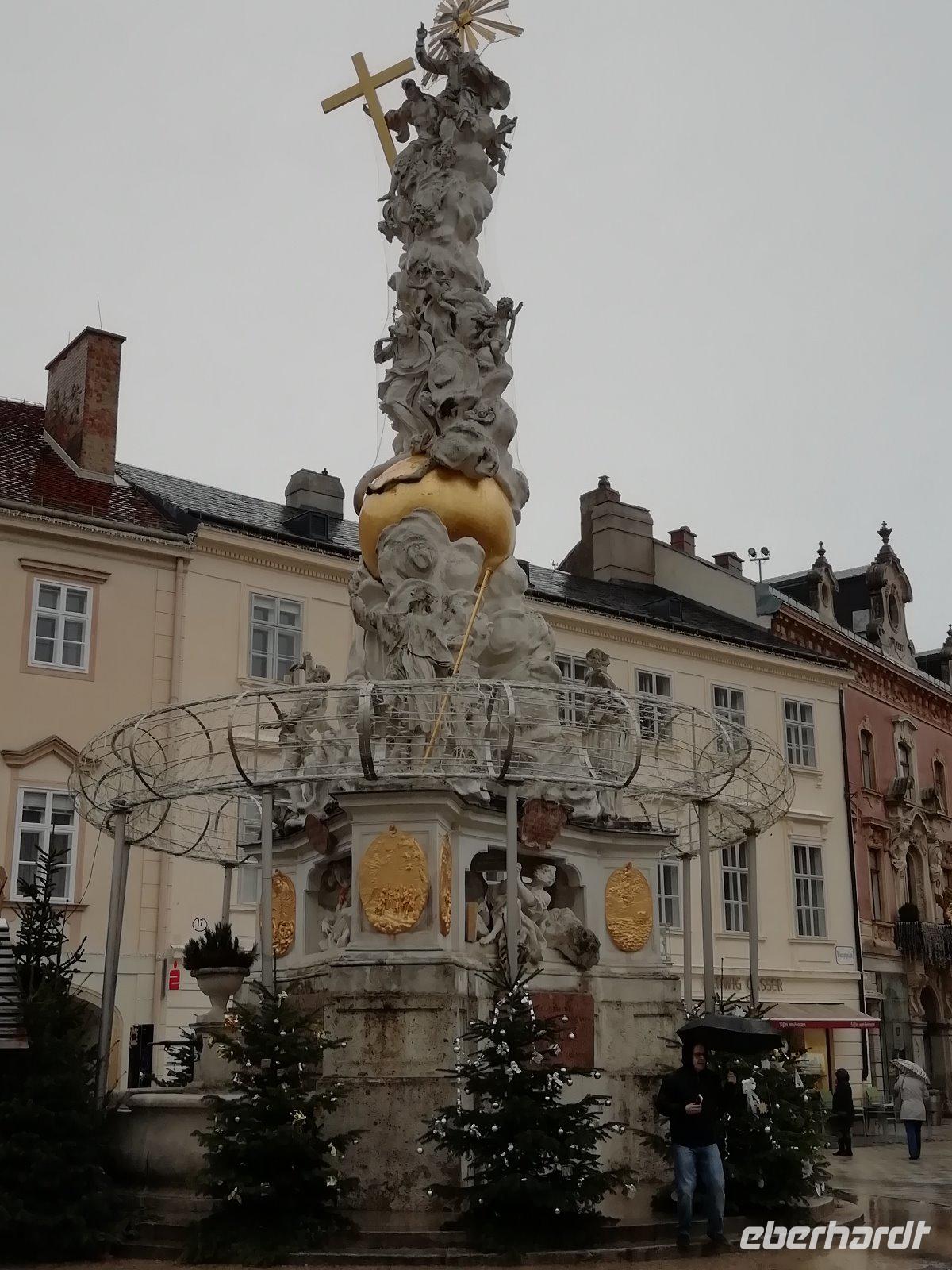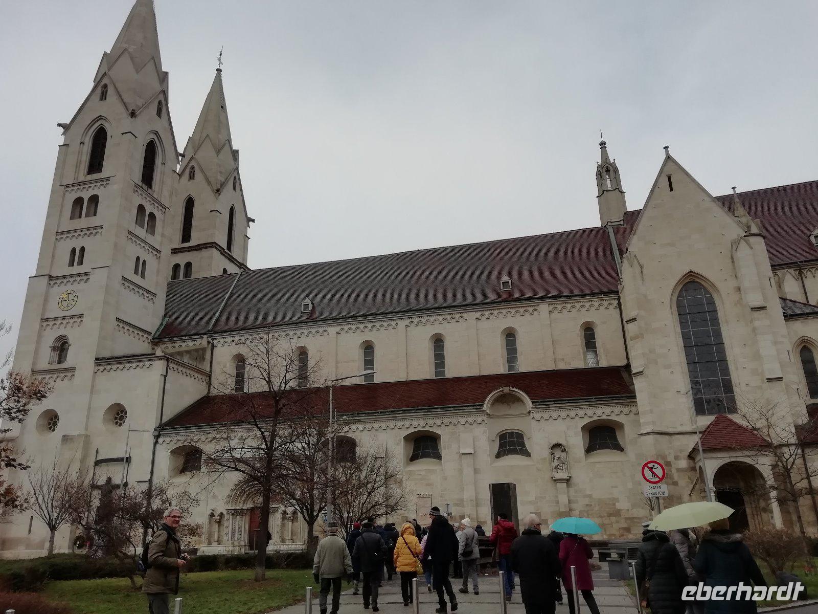 Nach dem Frühstück fahren wir heute nach Wiener Neustadt, ca. 35 Kilometer von Wien entfernt. In der Nähe des Wasserturms und der Militärakademie verlassen wir den Bus. Wir spazieren zum Hauptplatz, wo die Mariensäule steht und der Marienmarkt aufgebaut ist. Fast alle Gäste gehen dann noch zum Dom. Die beiden 64 Meter hohen Türme hatten wir schon von weitem gesehen. Im Dom findet gerade der Sonntagsgottesdienst statt. Uns fällt auf, dass der Hochaltar durch Achsknick nach rechts verschoben sichtbar erscheint. Nun bleibt noch Zeit für einen Bummel durch die Fußgängerzonen.