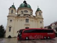 Recht zeitig am Morgen steigen die ersten Eberhardt-Reisegäste in den Bus und nach drei weiteren Stopps ist die Reisegruppe komplett. Chauffeur Tilo bringt uns gut über die A 17 und die D 8 bis kurz vor Prag. Hier machen wir unsere erste Pause. Inzwischen geht am Horizont die Sonne auf und wir fahren durch die tschechische Hauptstadt. Weiter geht es Richtung Brünn, aber bald verlassen wir die Autobahn und fahren über die Dörfer zur Grenze Tschechien/Österreich. Unmittelbar vor der Grenze befindet sich Merlins Kinderland, wo wir unsere Würstchen und Suppen essen. Weiter geht die Reise der Sonne entgegen. Durch Wien kommen wir ganz ohne Stau. Auch im Miesenbachtal ist bei diesem fast frühlingshaften Wetter kein Schnee zu sehen. Familie Hornung erwartet uns schon vor dem Hotel „Börsenhof" und begrüßt uns herzlich. Schnell sind die Zimmer bezogen und die meisten Gäste treffen sich im Restaurant des Hauses zum Kaffeetrinken. Dazu locken die süßen Spezialitäten des Hauses wie Malakofftorte, Gauermanntorte und gebackenes Eis. Die Zeit danach nutzen die einige für einen ersten Spaziergang oder für ein verspätetes Mittagsschläfchen. Zum Abendessen finden sich alle wieder ein. Die fünf Eberhardt-Gäste, die bereits Weihnachten im „Börsenhof" gefeiert haben, erzählen, was sie in den letzten beiden Tagen alles unternommen haben. So waren sie u.a. auf der Hohen Wand. Alle gemeinsam werden wir nun mit einem Salatbuffet und einem leckeren 3-Gang-Menü verwöhnt. Abschließend stimmen wir uns filmisch auf den morgigen Tag ein und stoßen mit einem Punsch auf die kommenden Erlebnisse an.