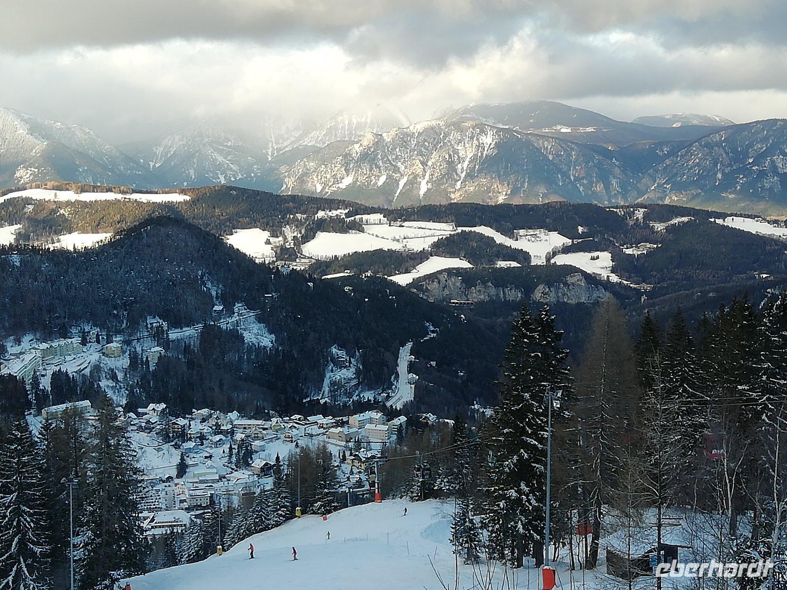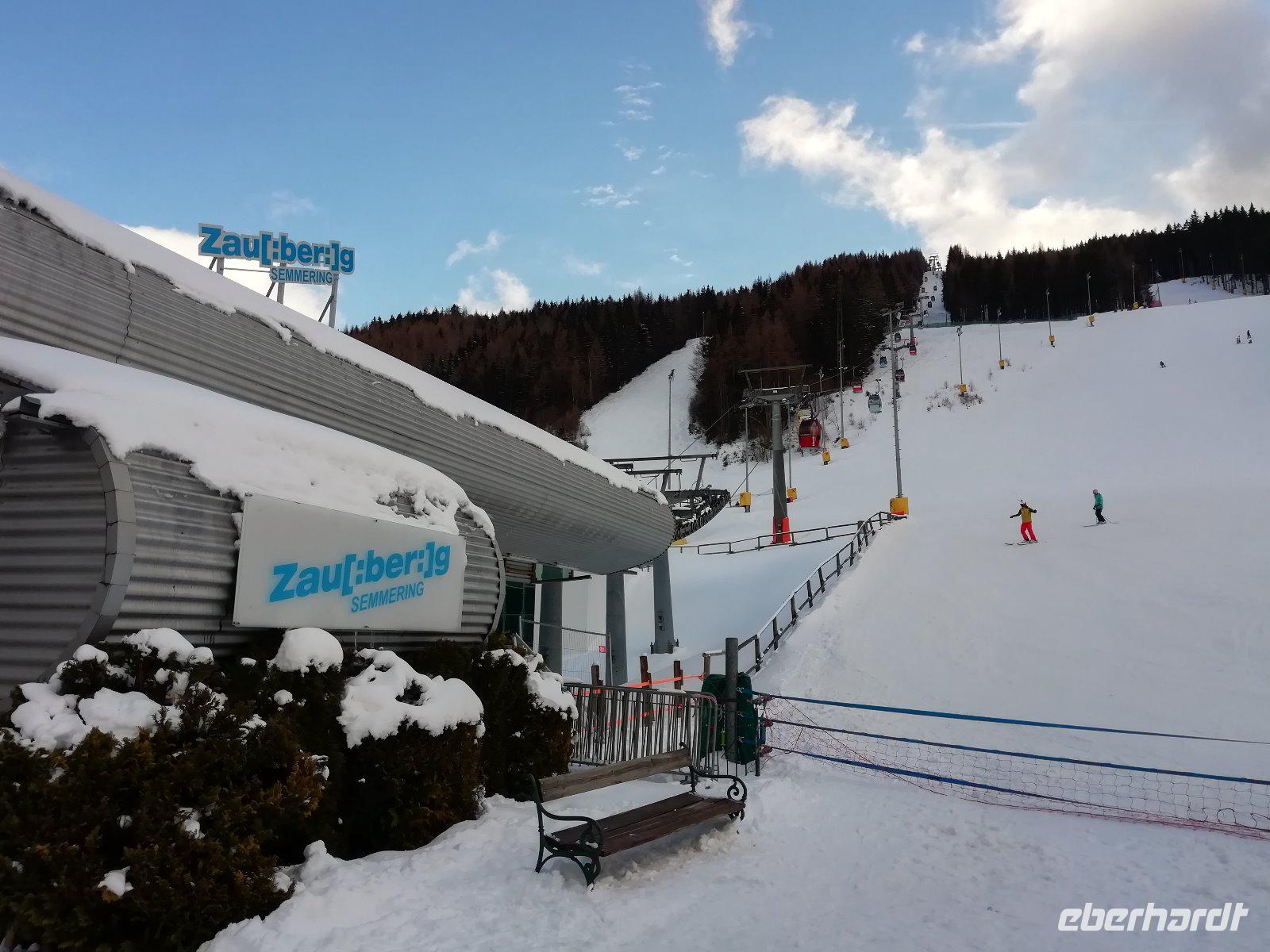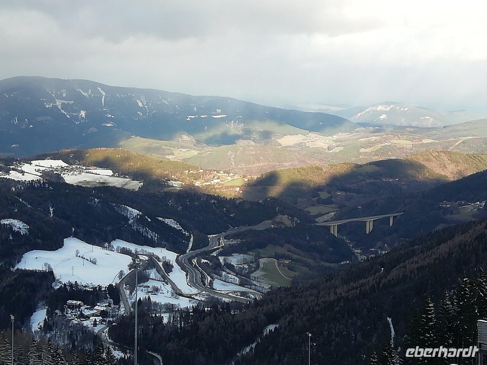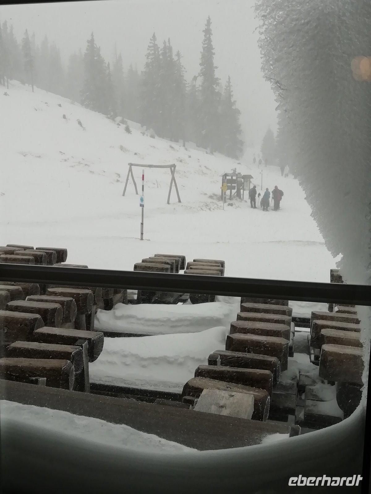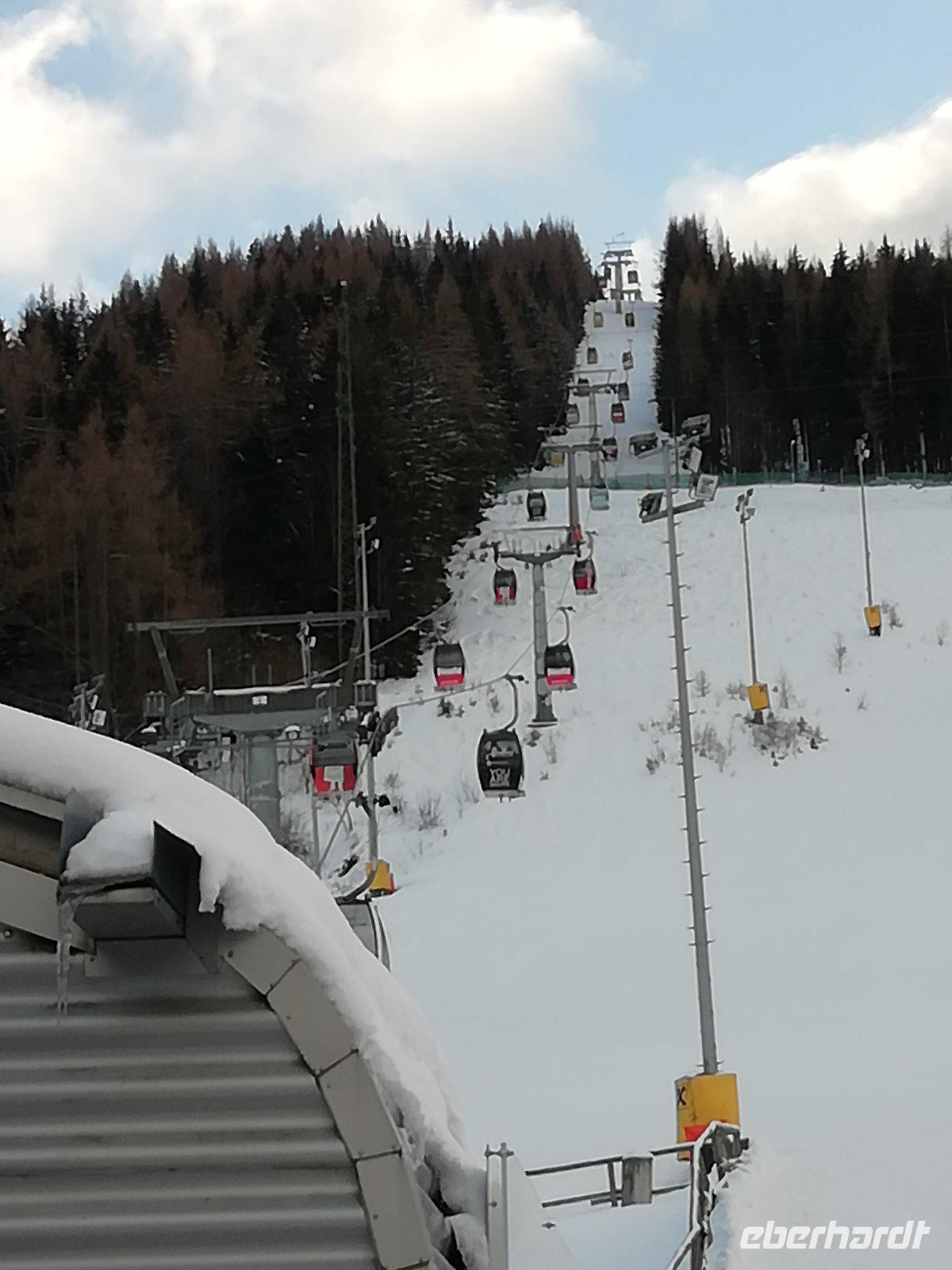 Der Hirschenkogel, auch Zauberberg genannt, ist unser letztes Ziel. Er liegt mit einer Höhe von 1340 m direkt südlich über dem Semmeringpass. Vor wenigen Tagen fanden ihr noch die Weltcup-Rennen statt. Auch heute sehen wir viele Ski- und Snowboardfahrer am Hang. Mit der Seilbahn fahren wir nach oben. Auf den Aussichtsturm klettern wir lieber nicht, denn die Stufen sind dick vereist. Aber auch so hat man einen schönen Ausblick und im „Lichtensteinhaus" lässt sich so mancher von den Gästen Hochprozentiges schmecken.