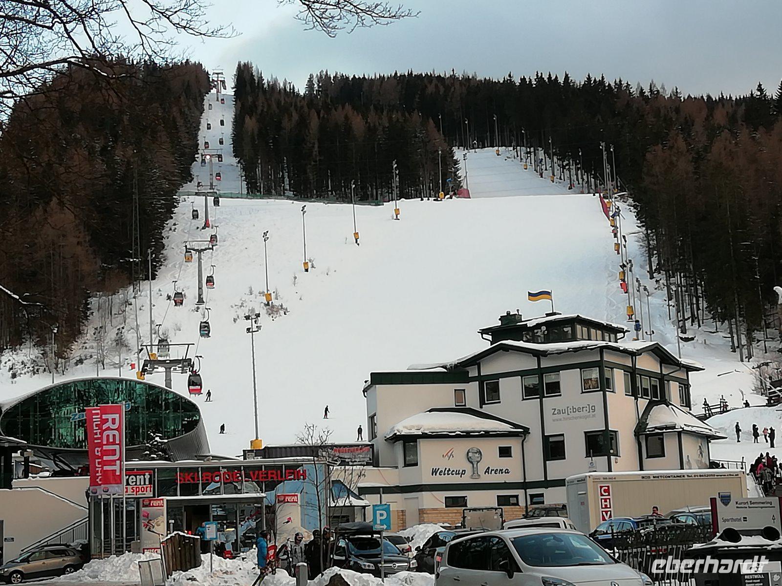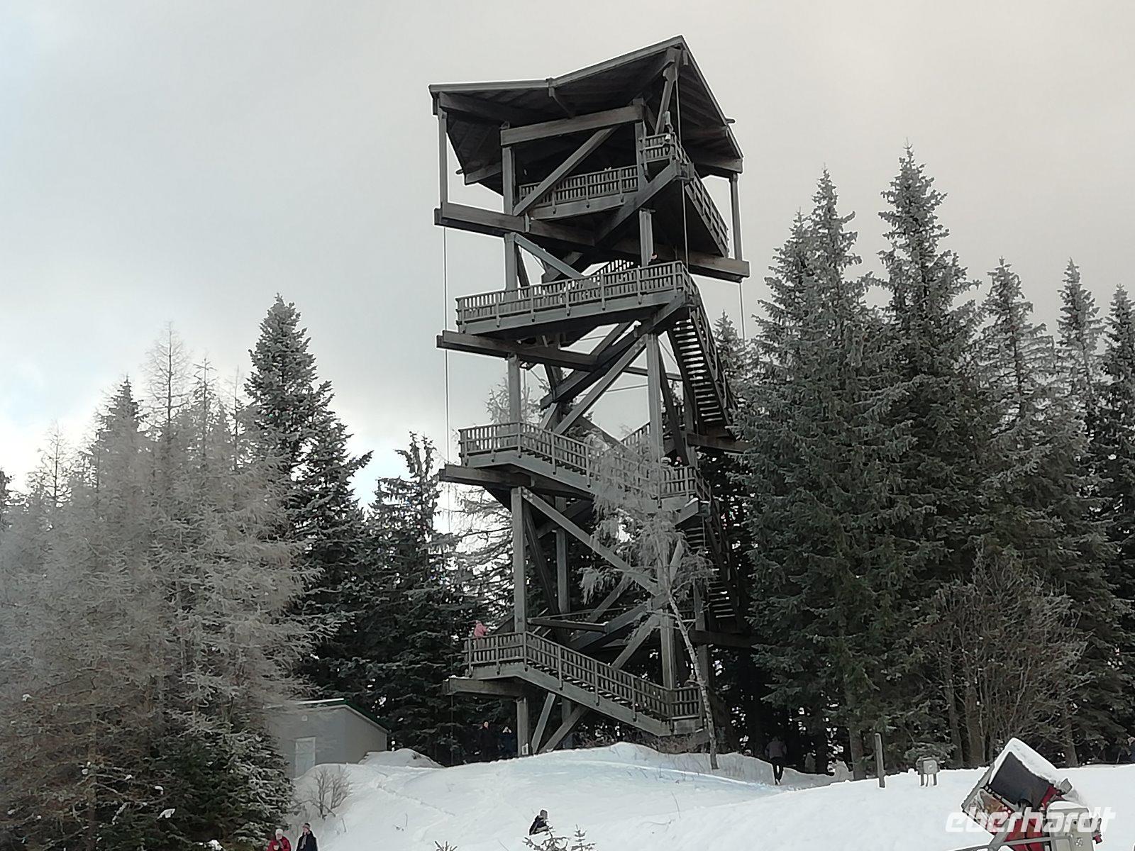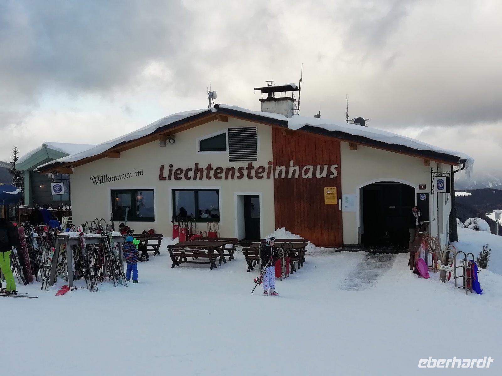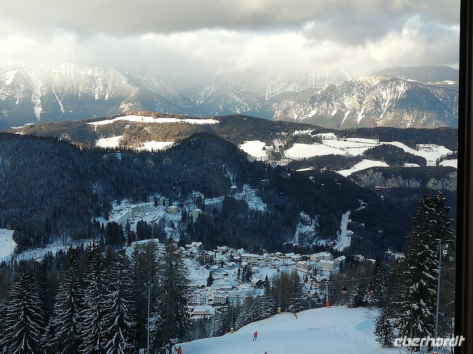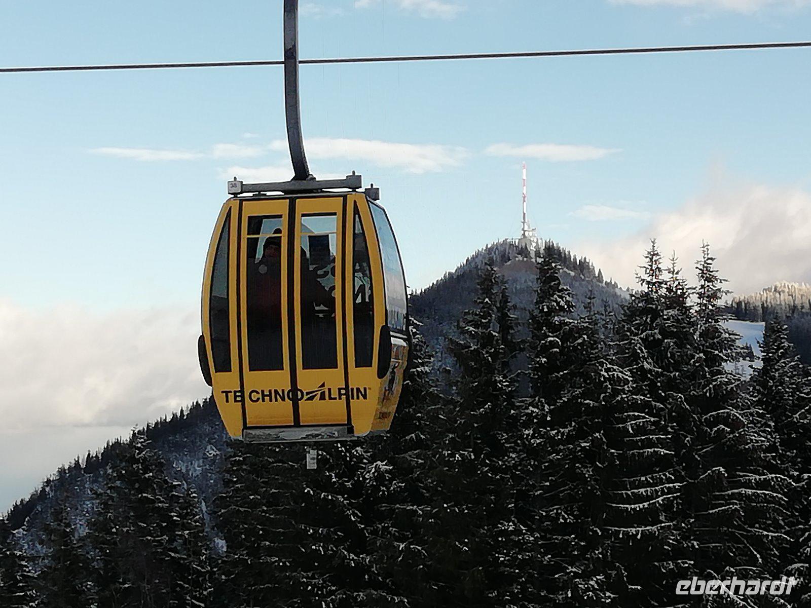 Der Hirschenkogel, auch Zauberberg genannt, ist unser letztes Ziel. Er liegt mit einer Höhe von 1340 m direkt südlich über dem Semmeringpass. Vor wenigen Tagen fanden ihr noch die Weltcup-Rennen statt. Auch heute sehen wir viele Ski- und Snowboardfahrer am Hang. Mit der Seilbahn fahren wir nach oben. Auf den Aussichtsturm klettern wir lieber nicht, denn die Stufen sind dick vereist. Aber auch so hat man einen schönen Ausblick und im „Lichtensteinhaus" lässt sich so mancher von den Gästen Hochprozentiges schmecken.