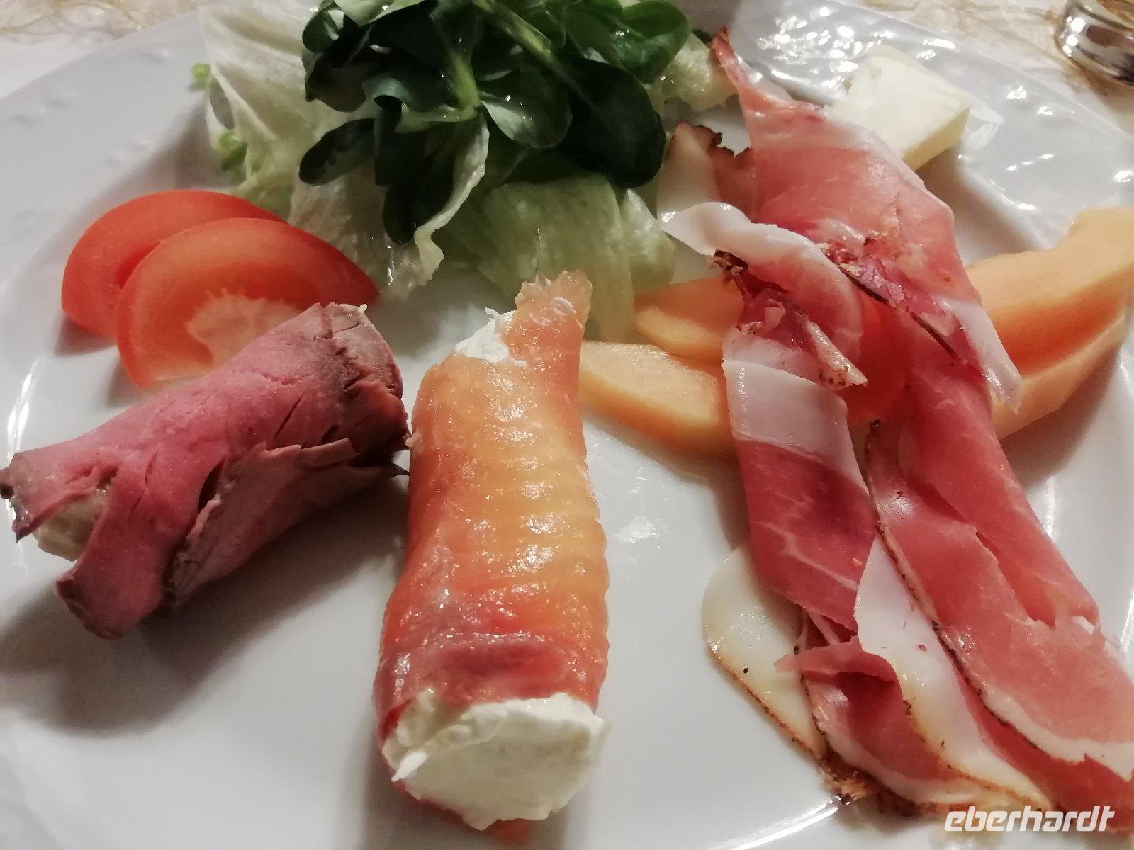 Nun braucht der Magen aber wieder etwas Handfestes. Da passt es gut, dass man uns im Hotel mit einem deftigen Buffet begrüßt. Dabei lernen wir auch Koch Thomas kennen. Gebackener Apfelknödel auf Erdbeersuppe und Eis bilden den süßen kulinarischen Abschluss des Tages. Danach informiert uns ein Film über interessante Ausflugsziele der Region.