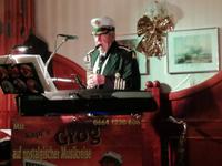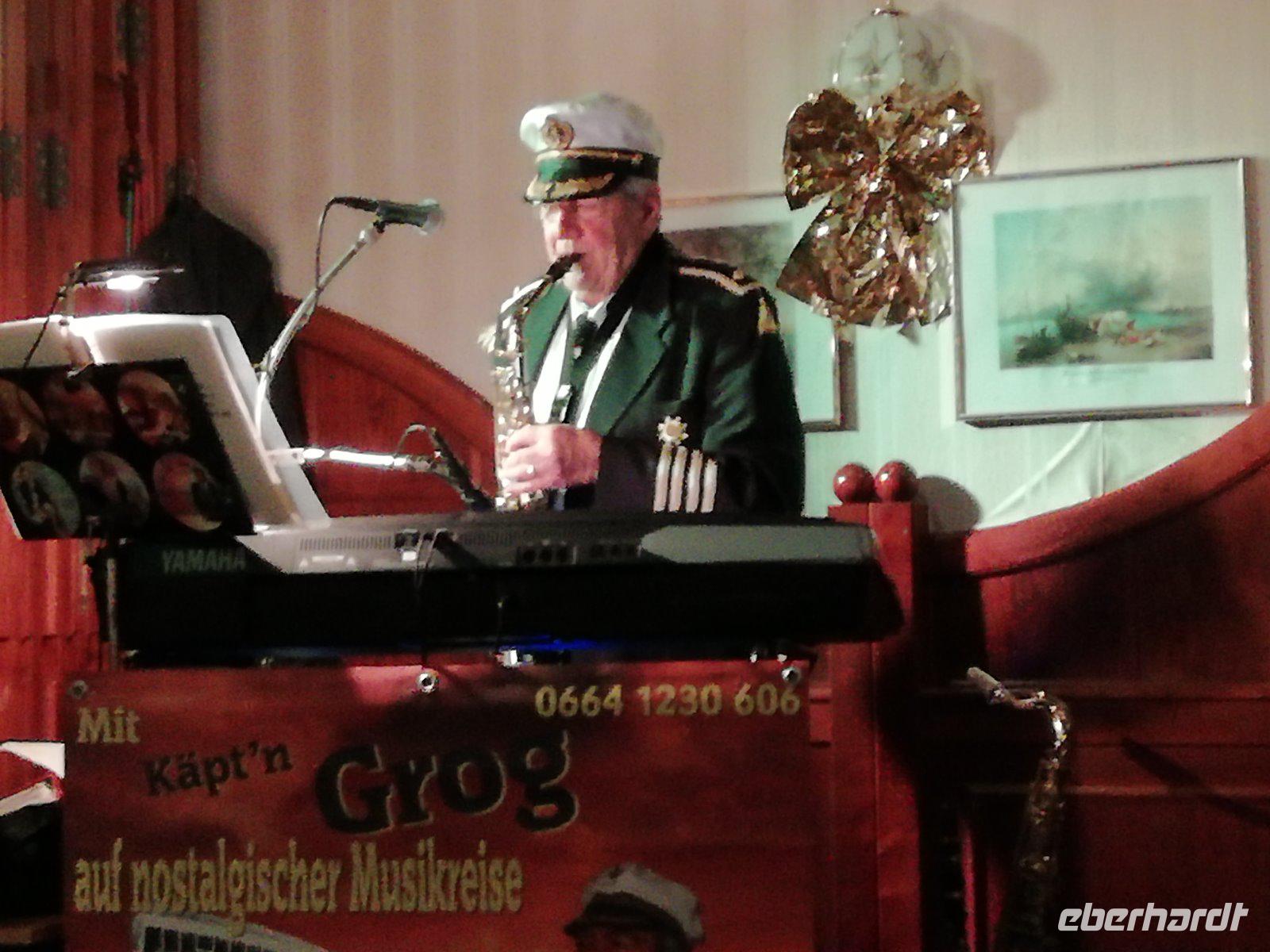 Diese wird mit einem festlichen 4-Gang-Menü eröffnet. Den Auftakt macht ein Vorspeisenteller mit Lachs- und Roastbeefröllchen, Rohschinken und Melone, dann folgt eine Apfel-Sellerie-Cremesuppe. Als Hauptspeise bekommen wir Steak von der Rinderhüfte mit Pfeffersoße, Brokkoli und Pommes Frites serviert und zum Abschluss noch einen flüssigen Schokokuchen mit Eis und Schokomousse. Danach nehmen uns „Käpt'n Grog und seine Saxophone" mit auf eine musikalische Reise. Die Tanzfläche ist immer gut besucht.