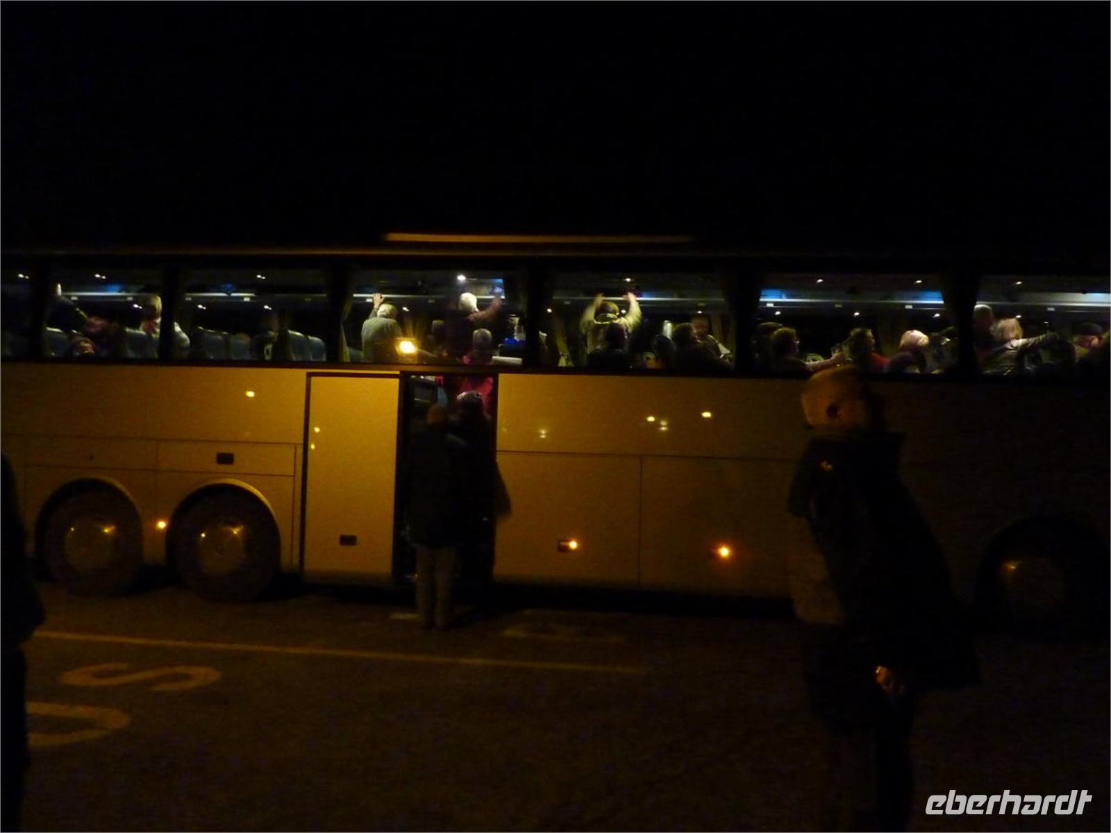 Aber zuerst begrüßte uns der Klaus mit einem kleinen Neujahrsschnaps, den seine Bärbel im Bus mit verschiedenen Sorten austeilte. Wir tranken auf sein Wohl und fuhren dann los zu unserem