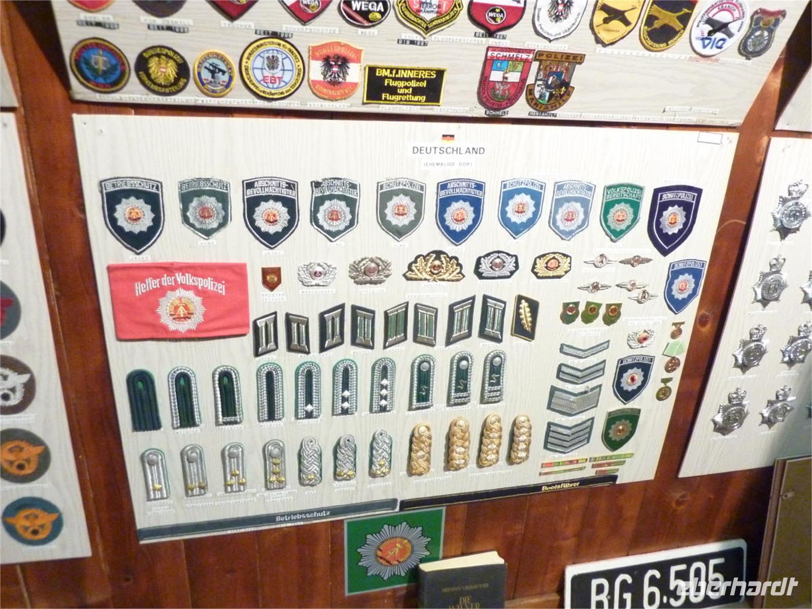 Dann kann man die Kappensammlung bewundern mit 486 Kappen und Helme von Polizei und Gendarmerie und 3000 verschiedenste Abzeichen aus 97 Staaten der Welt.