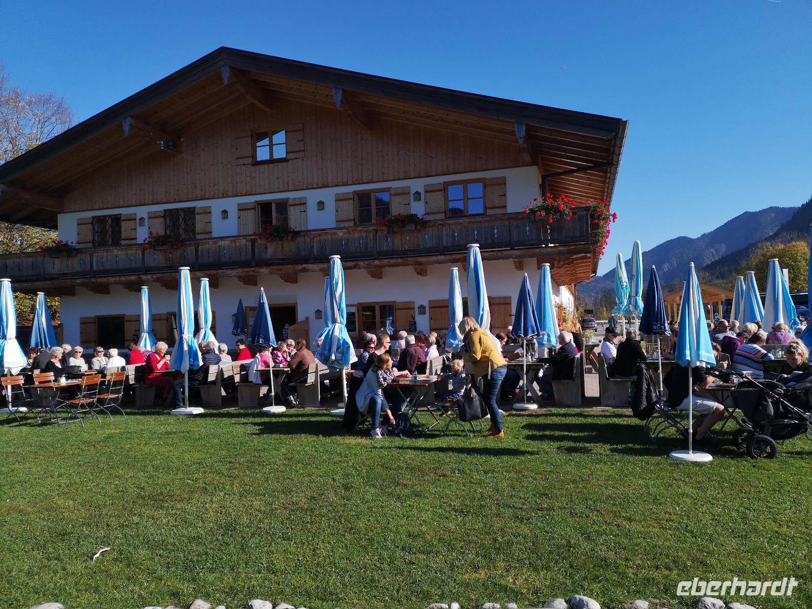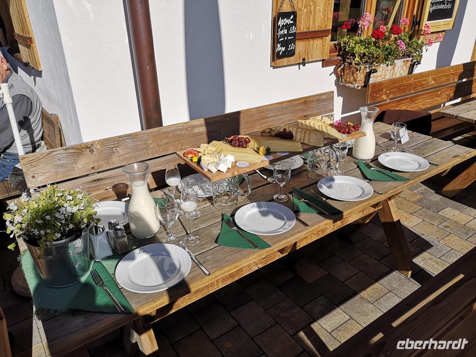 Nach einem schönen Aufenthalt hier in Tegernsee steigen wir nochmal für ein kurzes Strecke in den Bus und fahren in den Ort Kreuth zu einer Naturkäserei mit schönem Biergarten. Hier wollen wir unsere Mittagspause verbringen. Bei diesem schönen sonnigen Wetter, müssen wir unbedingt die Pause im Freien verbringen. Was sich hier in der Käserei natürlich anbietet, sind vielfältige Käsekuchen, Käseplatten oder auch nur ein Käsebrot mit einem Glas Milch oder vielleicht auch einem Bier. Alles ist sehr lecker und zu besichtigen gibt es auch noch das große Käselager und ein Informationsvideo.