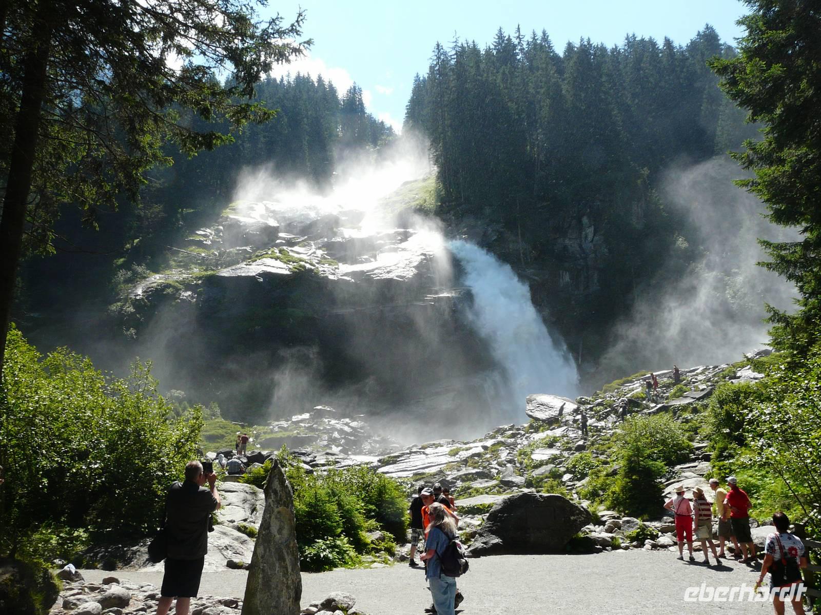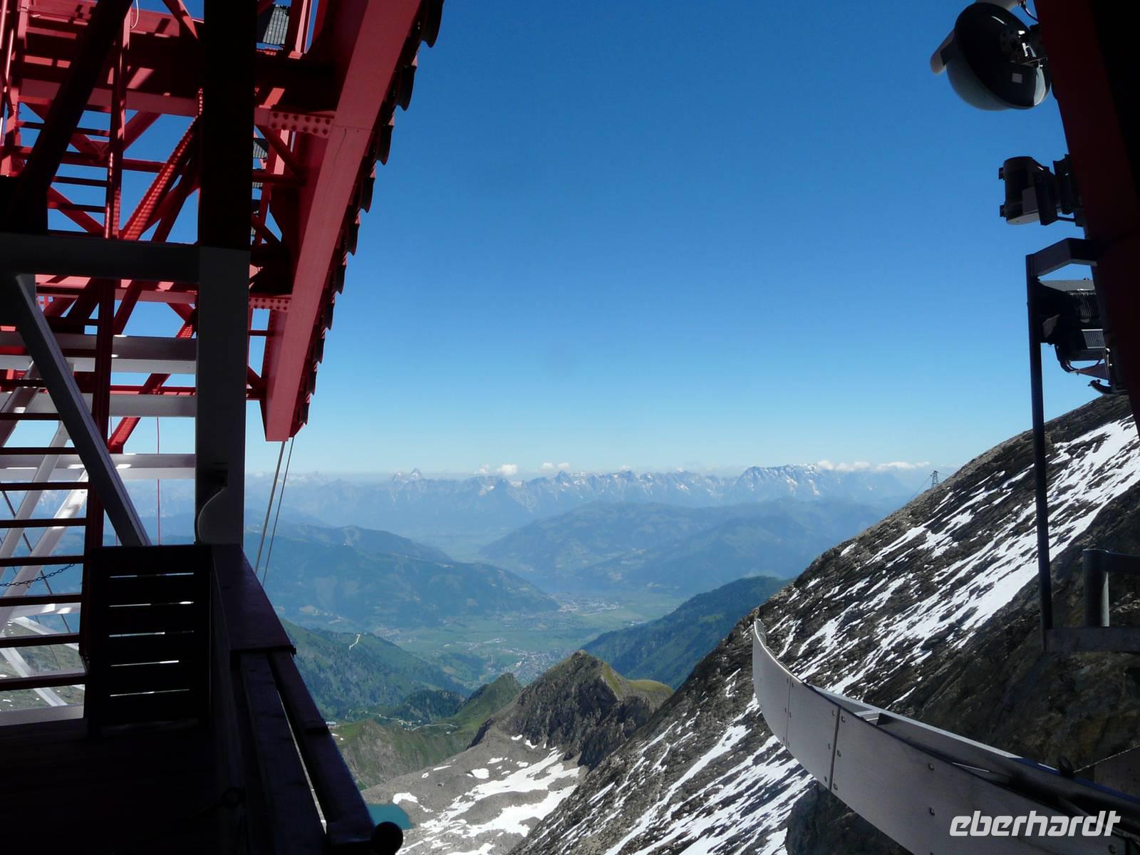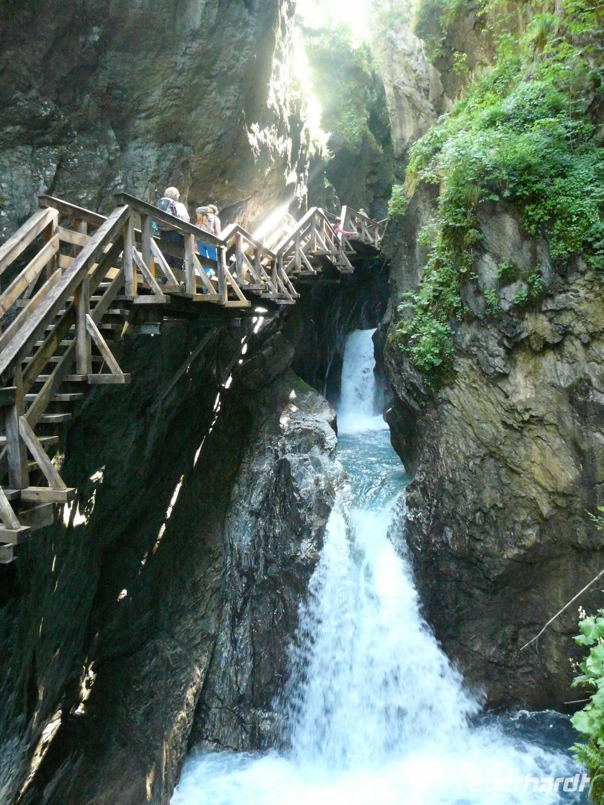 Mit unserer Vorfreude auf diesen 3000er Gipfel sind auch die Temperaturen gestiegen, die nächsten Tage werden uns immer über 30°C erwarten. So müssen wir gerade die Wanderungen entschärfen, die in der prallen Sonne und auf ungeschützten Wegen liegen. So entscheiden wir uns, dem heißen Abstieg vom Kitzsteinhorn eine Wanderung durch die kühle Klamm vorzuziehen. Doch erstmal zum Anfang des Tages: Mit einem Transfer werden wir vorbei an Kaprun bis zur Talstation des Kitzsteinhorns gebracht. Hier beginnt quasi eine dreifache Auffahrt. Zuerst mit Gondel, dann mit Sessellift und zu guter Letzt mit großer Kabinenbahn gelangen wir zum „Top of Salzburg", dem mit 3029 m höchstgelegenen Aussichtspunkt des Salzburger Landes. Die sogenannte „Gipfelwelt 3000" ist ein Besucherzentrum nahe am Gletscher. Von einer Aussichtplattform genießen wir einen atemberaubenden Ausblick in die Bergwelt Österreichs, von den Hohen Tauern mit dem Großglockner hinüber über die Zillertaler Alpen bis hin zur Zugspitze. Während wir versuchen uns an dem Panorama satt zu sehen, macht sich gleichzeitig auch eine kleine Gruppe Gipfelstürmer fertig, um mit 2 Bergführern den Gipfel des 3203m hohen Kitzsteinhornes zu erklimmen. Wir treffen uns dann doch lieber nur mit dem Nationalpark Ranger, welcher uns durch einen in den Berg gehauenen Stollen führt und uns die Enstehung der Gletscherwelt der Hohen Tauern erklärt, die Vielfalt der Natur- und Pflanzenwelt näherbringt und uns die Geschichten über die einstigen Erz- und Silbervorkommen in der Tiefe der Berge erzählt. Am Ende des Stollens befinden wir uns auf einmal an der freien Flanke des Berges und können mit dem Skywalk fast über den Gletscher fliegen. Als letztes Highlight der Gipfelwelt wartet auf uns ein kurzer, jedoch fantastischer Film, welcher die Einzigartigkeit des Nationalparks Hohe Tauern und des Kitzsteinhornes in Bilden einfängt untermalt mit der Stimme von (wer hat's erkannt???) Andreas Gabalier. Es wird Zeit, hinab zu fahren und so nutzen wir Kabinenbahn und Sessellift wieder talwärts, sodass wir an der Häuslalm die kurze Wanderung zur Salzburger Hütte starten. Der Wirt, ein fränkisches Original, macht auch diesen Halt zu einem einzigartigen Erlebnis und gute Augen möchten gesehen haben, dass der hervorragend schmeckende Kaiserschmarrn mit Rum flambiert wurde! Dies führt natürlich dazu, dass der Aufstieg zurück zur Alm und damit auch zur Gondelbahn etwas schwerer fällt - die mittlerweile sengende Hitze selbst in dieser Höhe nicht zu vergessen.