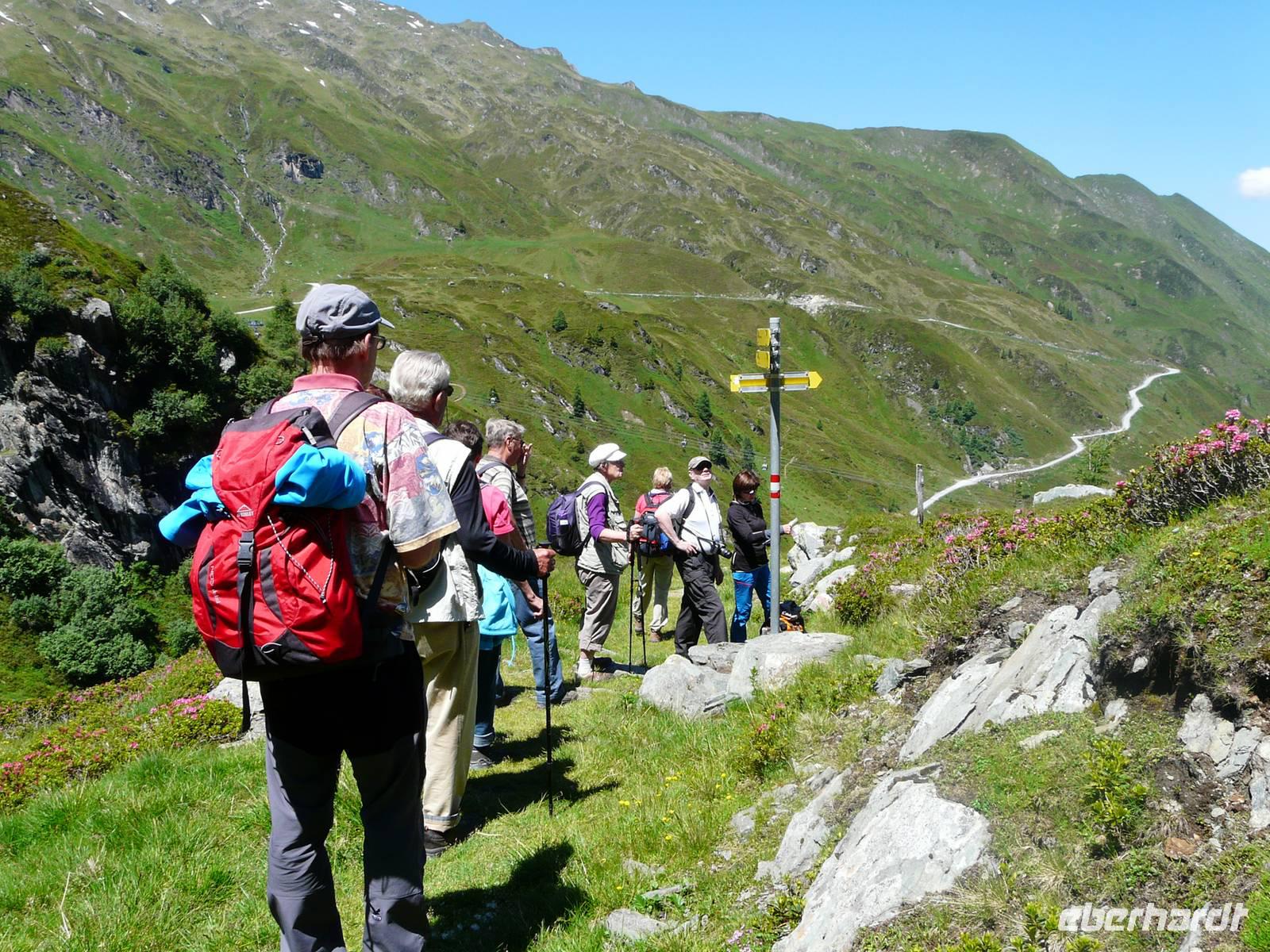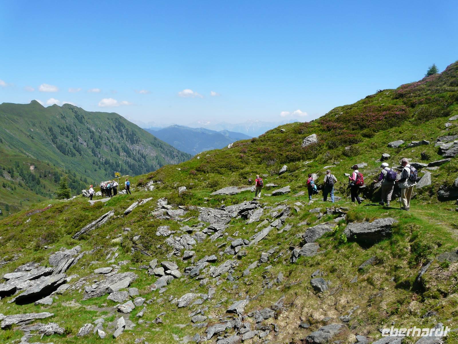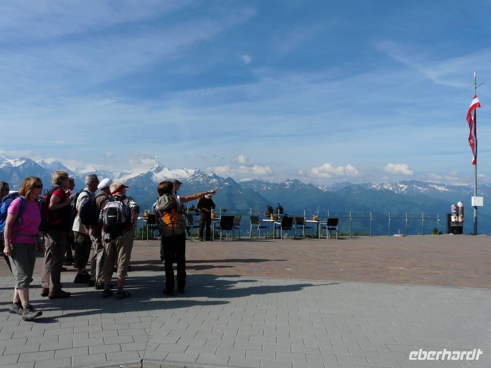 Auf Hertas Vorschlag hin und auch aufgrund der hohen Außentemperaturen verkürzen wir unseren eigentlich angedachten Pinzgauer Spaziergang und haben uns dafür ein Gipfelkreuz als Ziel auserkoren. Vom Hotel aus laufen wir wieder den kurzen Weg hin zur Talstation der Schmittenhöhenbahn und fahren wieder hinauf. Die Sissi-Kapelle, unserer gestriger Endpunkt, ist heute Ausgangspunkt der Wanderung hin zum Maurerkogel. Wir laufen in einen kleinen Talkessel hinein, zuerst über einen schmalen, dann immer breiter werdenden Weg. Der nächste kurze Anstieg führt über breite Wiesen, je höher wir kommen desto mehr Almrausch zeigt sich, immer öfter ganze Teppiche der so typischen und wunderschönen Alpenblume. In einem stetigen Auf und Ab folgenden wir dem Wanderweg Pinzgauer Spaziergang, bis sich am Fuße des Maurerkogels der Weg teilt. Die Gipfelstürmer folgen nun Herta hin zum Gipfelkreuz des 2074m hohen Grasberges. Ich folge mit dem anderen Teil der Gruppe dem Pinzgauer Spaziergang immer schräg zur Flanke des Berges bis hin zur Hochsonnbergalm. Hier wartet die erste, heißersehnte Buttermilch auf uns, frisch vom Almbauern, der auch sonst einen äußerst sympathischen Eindruck macht und sich auch die Zeit nimmt, einen kleinen Schnack mit uns zu erhalten. Ca. eine dreiviertel Stunde später kommen auch die Gipfelstürmer bei der Hütte an und so können wir eine gemeinsame Pause machen. Etwas unterhalb des Hinweges laufen wir später gemütlich zurück. Während die etwas schnelleren Wanderer gemeinsam mit Herta schon wieder im Anstieg zur Bergstation der Schmittenhöhenbahn sind, entscheiden wir weiter hinten, unserer Wanderung noch etwas zu verlängern. Und so laufen Reisebegleitung und ein paar Unersättliche weiter hinab. Am Glocknerhaus werden wir dafür mit einem atemberaubenden Blick auf Österreichs höchsten Berg belohnt. Querfeldein wandern wir nun noch bis zur Mittelstation, von wo aus es mit der Gondel bis ins Zentrum der Stadt und von hier bis ins Hotel geht. Nach einem anstrengenden aber doch schönen Tag lassen wir uns auch heute von der Spitzenküche des Hotels verwöhnen - haben wir uns ja schließlich auch verdient.