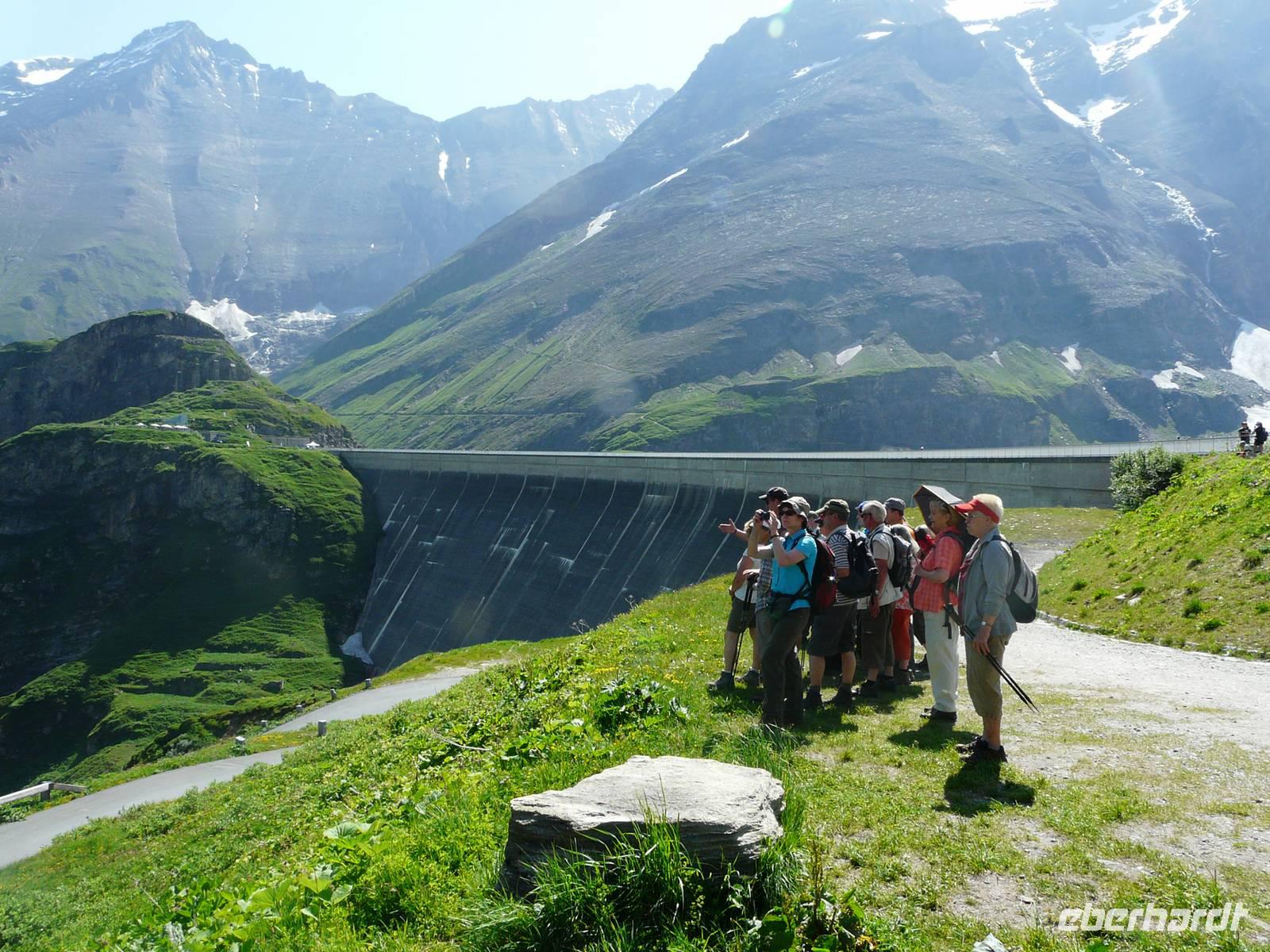 Unser letzter Wandertag steht auf dem Programm und natürlich kommt das Beste zum Schluss! Wieder werden wir mit einem Transfer abgeholt und bis zum Kesselfallhaus gebracht. Hier steigen wir in Shuttlebusse um, welche uns über viele Kehren hinauf zur Mooserbodentalsperre auf über 2000 Meter. Hier bestaunen wir die gewaltige Staumauer, die türkis schimmernden Stauseen links und rechts der Mauer, welche in wunderschönem Kontrast zu den schneebedeckten Gipfeln der umliegenden Bergriesen stehen. Nachdem wir uns selbst ein bißchen umgesehen haben, erwartet uns nun eine kleine Führung mitten durch die riesige Staumauer hindurch. Wir erfahren viel Wissenswertes über die riesige Stromerzeugung und sind überrascht über die Leistungsfähigkeit des Kraftwerks, welches sich unten in Kaprun anschließt. Auf der anderen Seite der Mauer erblicken wir wieder Tageslicht, schauen die kleine Ausstellung im Infozentrum an und laufen kurz zu dem kleinen Bergkreuz.
