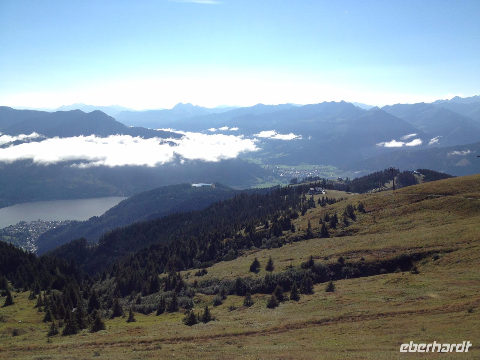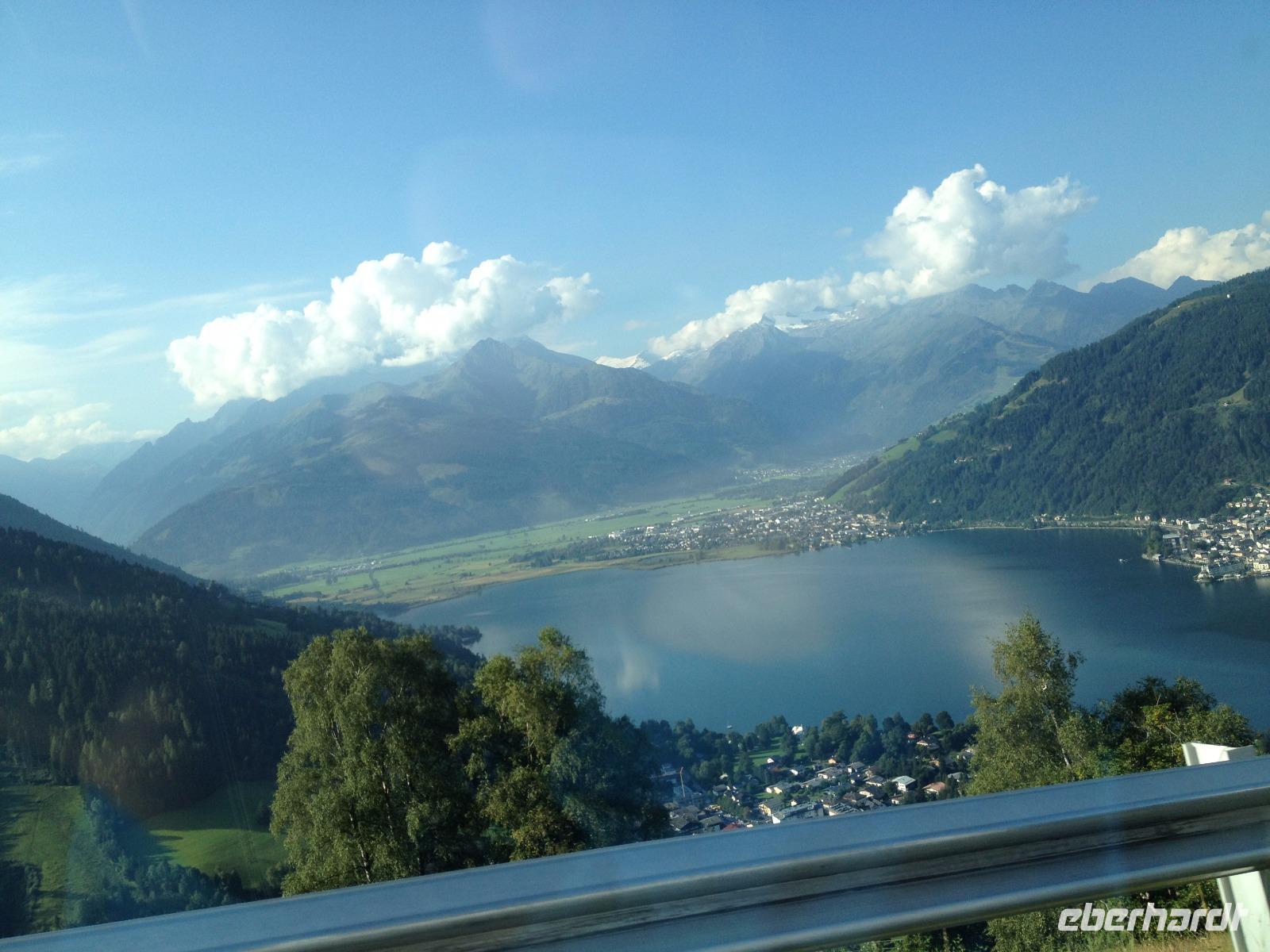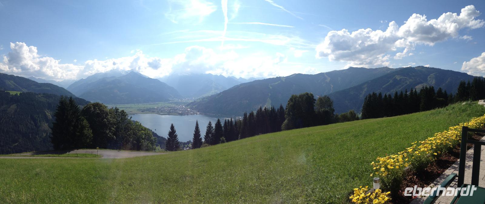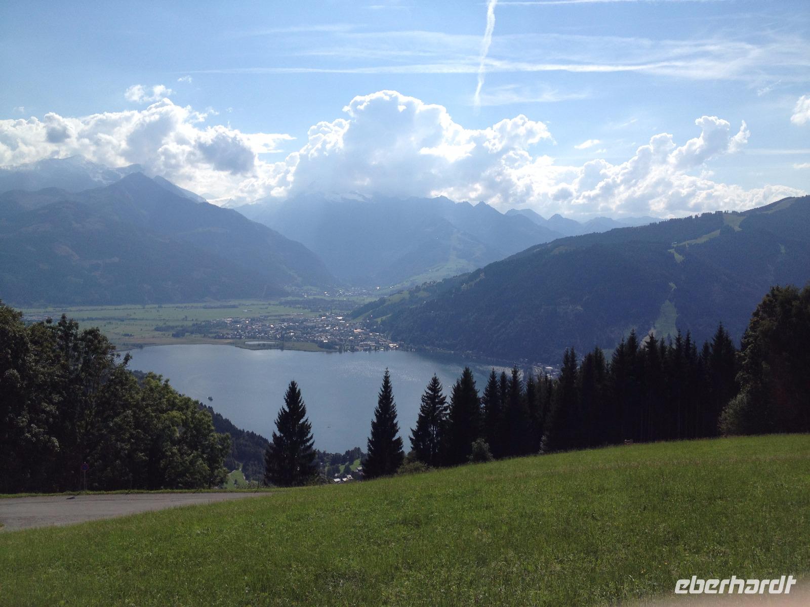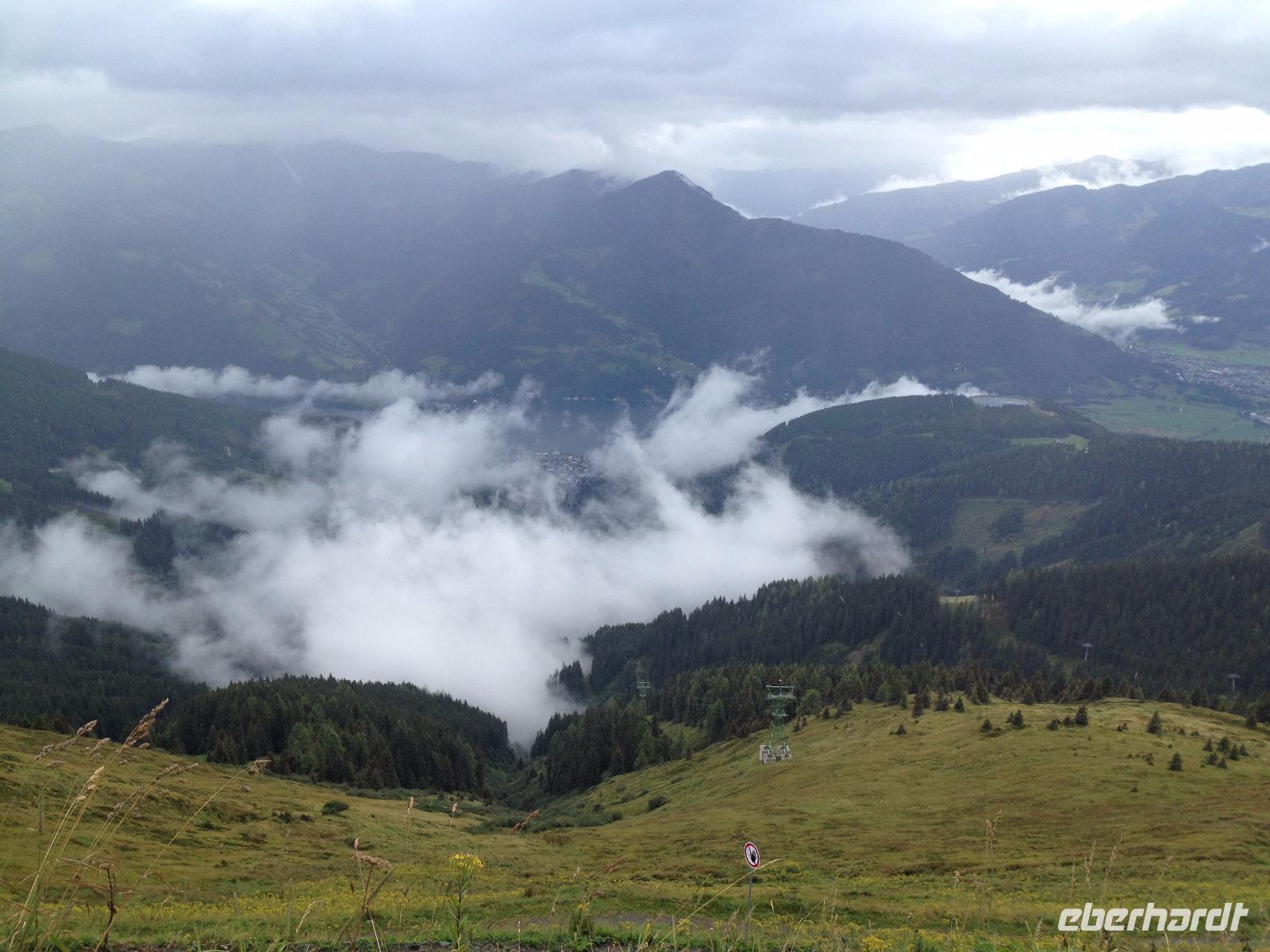 Der Montag empfing uns mit Schauern, welche sich ab und zu über unser Hotel abregneten. Das Frühstück war für uns ab 7:30 Uhr bereit und wir schmierten uns noch ein Lunchpaket für den heutigen Wandertag. Um 9 Uhr lernten wir Herta, unsere örtliche Wanderleiterin, kennen und sie konnte uns mit ihrem Charme sofort für sich und die Umgebung begeistern. Ohne große Vorreden begannen wir unsere erste gemeinsame Wanderung zur Schmittenseilbahn mit der wir auf die Schmittenhöhe fuhren und in den Nebel aus Wolken unter uns hinab schauten. Wir wanderten entlang des Gebirgskamms bis zur Sonnalm und legten auf unserem Weg eine Mittagspause ein, wo wir unsere mitgebrachten Lunchpakete genossen. An diesem Tag waren wir 12:45 Uhr nach der ersten leichten Wanderung zurück im Hotel und machten uns kurz für unseren Nachmittag frisch. Nach einer halben Stunde trafen wir uns in der Lobby und ich ging mit meinen Gästen zusammen die Schmittenstraße hinab bis zum Grandhotel und dem daneben angesiedelten Bootsanleger, wo wir mit unserer praktischen Zell am See - Kaprun - Sommer - Karte kostenlos auf eine Rundfahrt über den Zeller See starteten. Nach einer knappen Stunde mit einer wundervollen Aussicht auf Zell am See kamen wir zurück am Anlieger an und wir nutzten die Freizeit bis zum Abendessen für einen Stadtbummel. An diesem Abend begann unser Abendbrot bereits 18 Uhr und war, wie auch die nachfolgenden Tage, köstlich.
